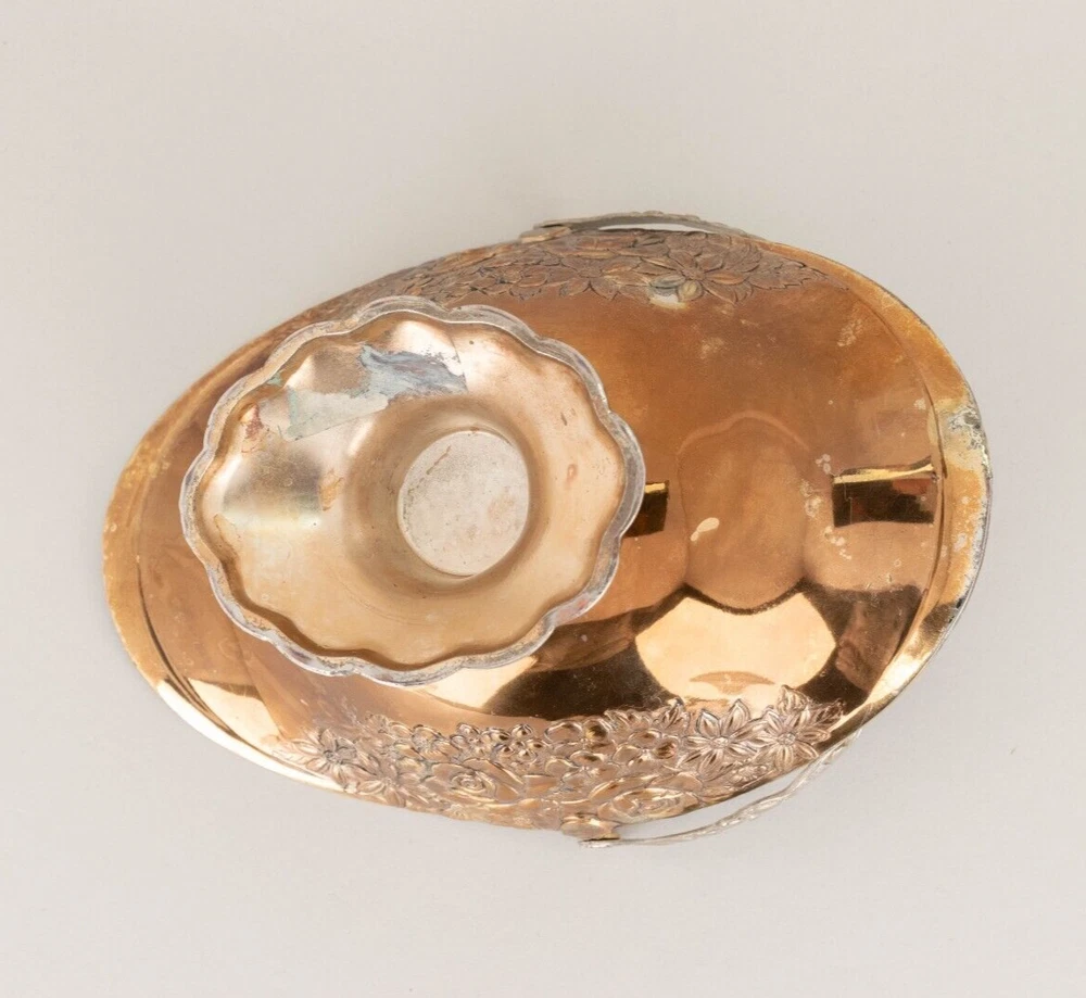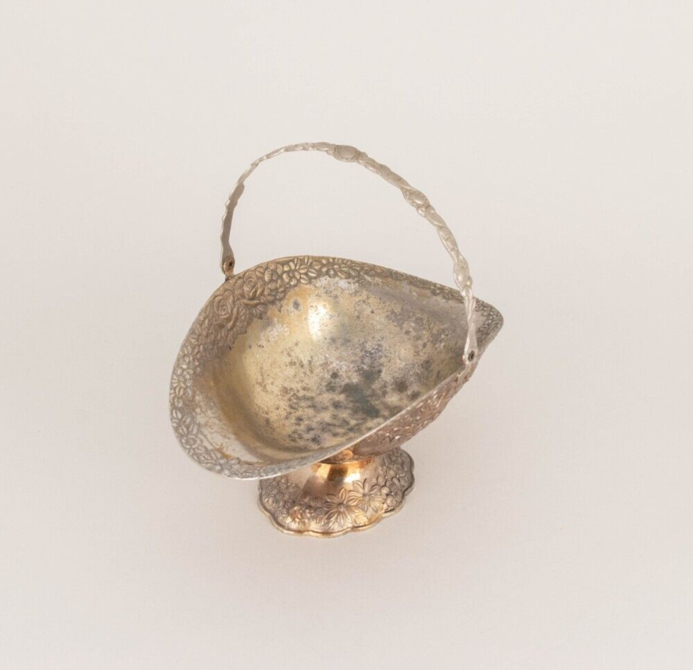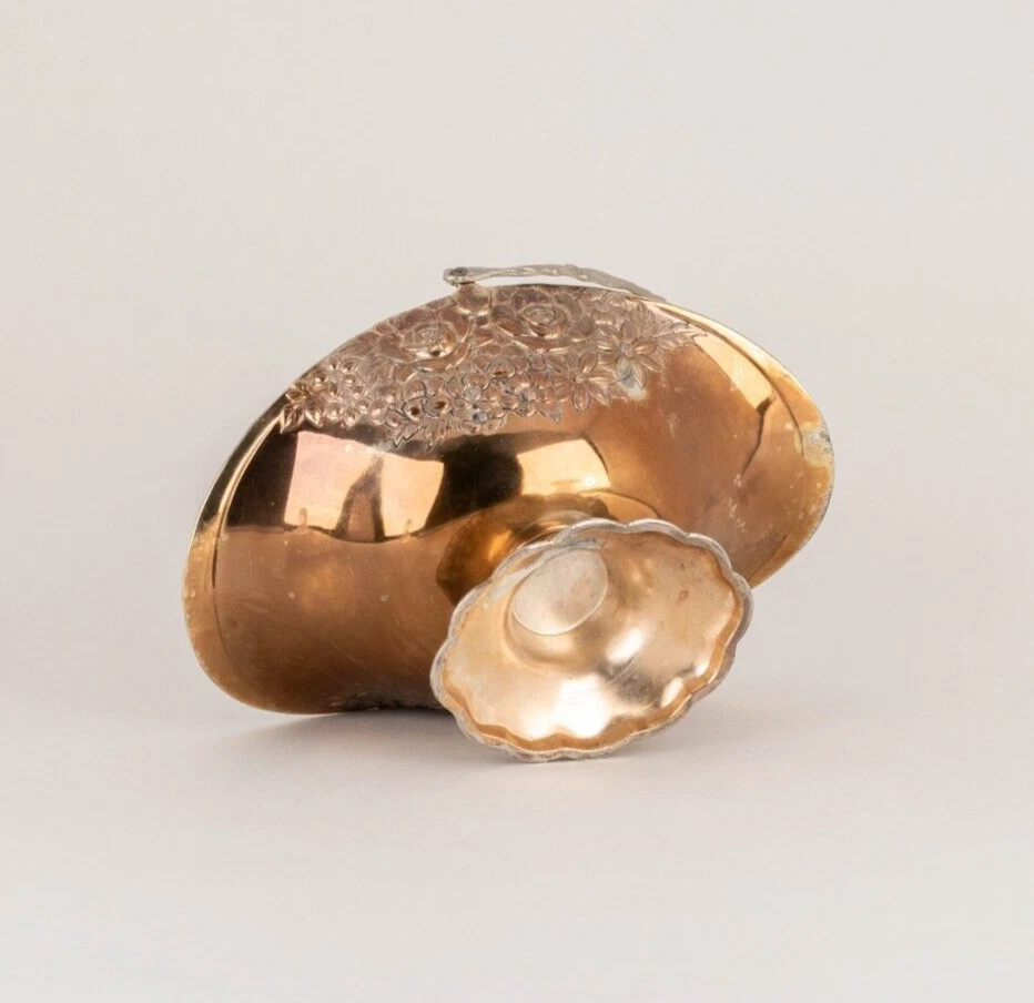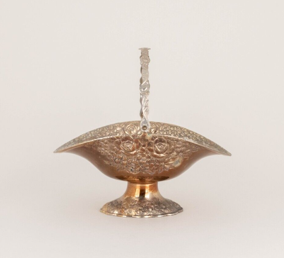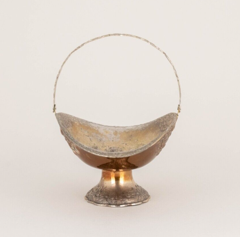 Heavy vintage metal basket with foot and folding handle with raised floral design. Made in Japan by Holiday Imports Bowl measures: 6 1/2" long x 4 1/2" wide x 3" tall (6" tall with handle up). Basket is 2" deep. Weight: 13.5 oz Good vintage condition with some wear, discoloration/patina and corrosion. It would look great repainted and dry brushed. Please take a close look at the photos as they are a part of the description. Items are sold as-is and are not eligible for return so please message me before purchasing if you would like additional pictures or have any questions.