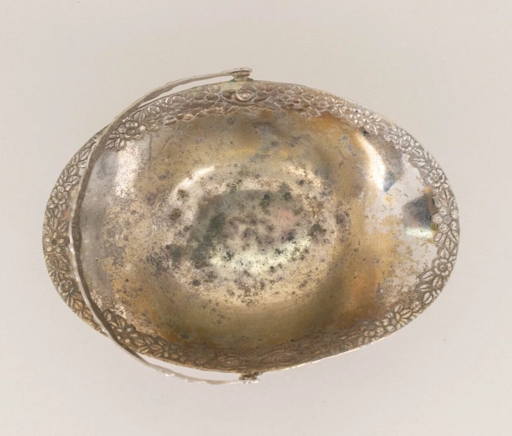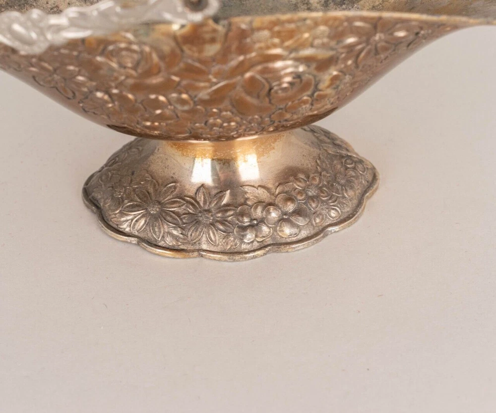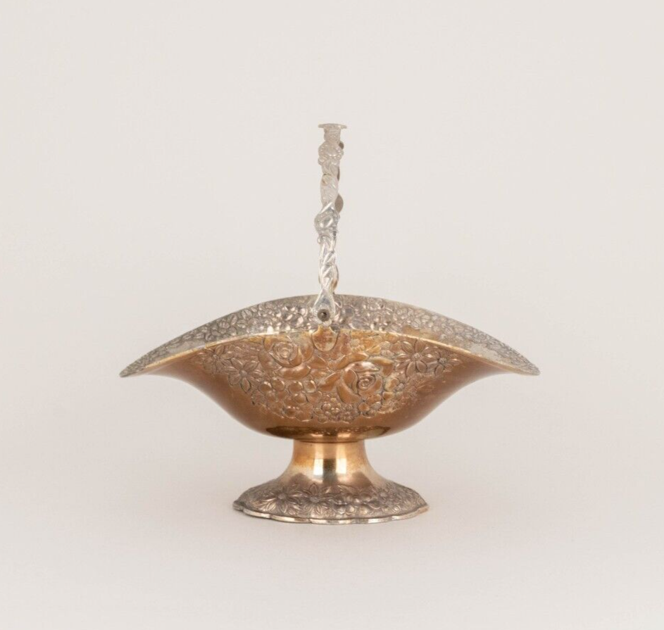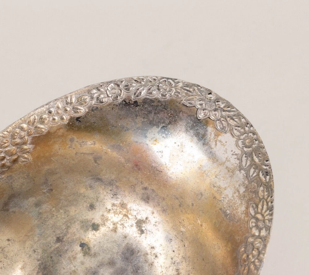 Heavy vintage metal basket with foot and folding handle with raised floral design. Made in Japan by Holiday Imports Bowl measures: 6 1/2" long x 4 1/2" wide x 3" tall (6" tall with handle up). Basket is 2" deep. Weight: 13.5 oz Good vintage condition with some wear, discoloration/patina and corrosion. It would look great repainted and dry brushed. Please take a close look at the photos as they are a part of the description. Items are sold as-is and are not eligible for return so please message me before purchasing if you would like additional pictures or have any questions.