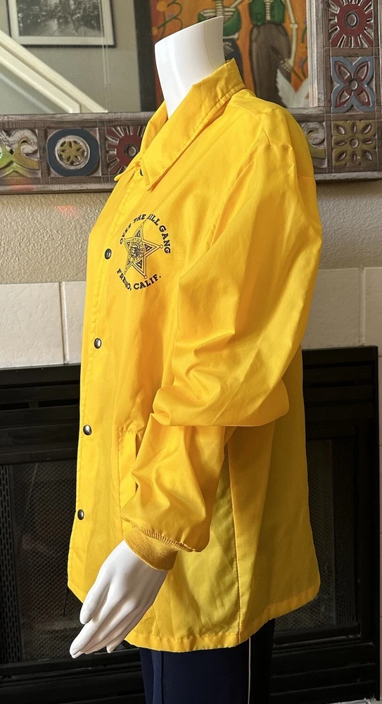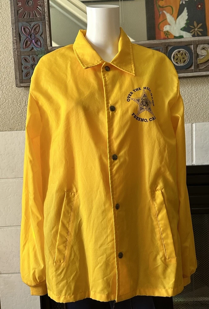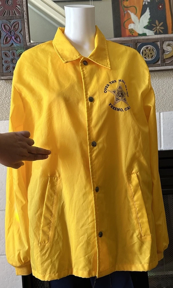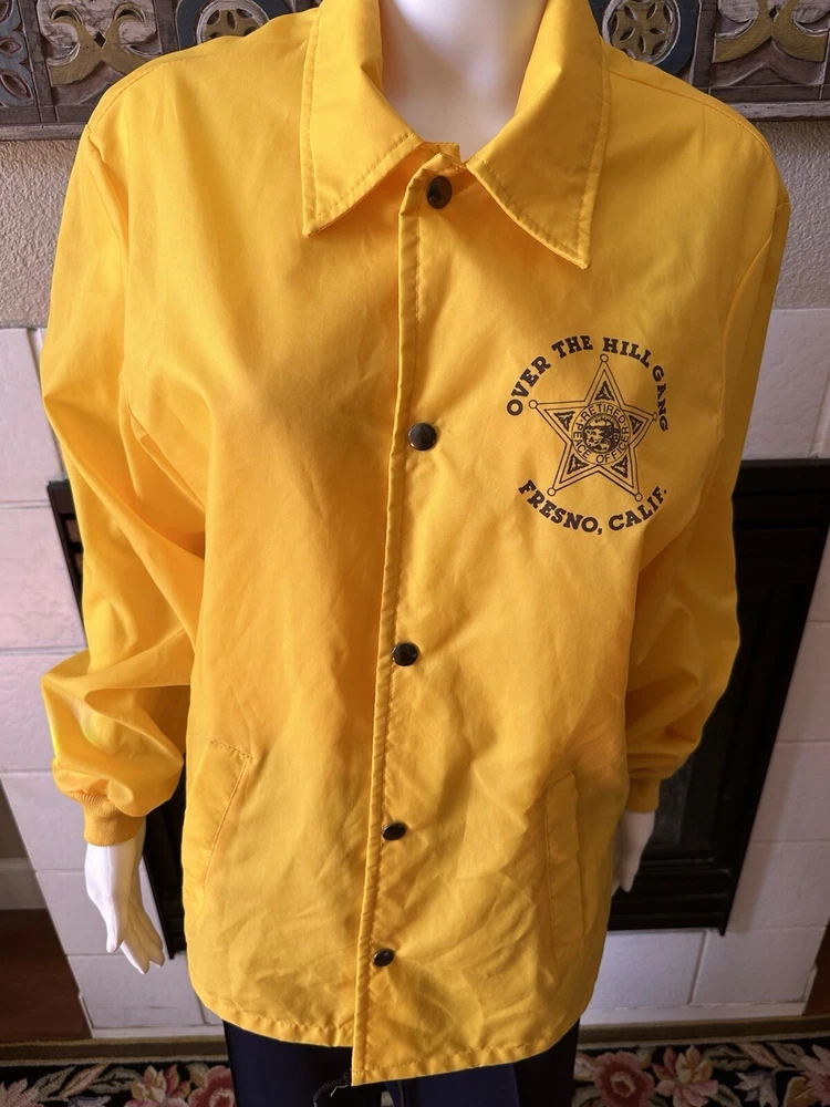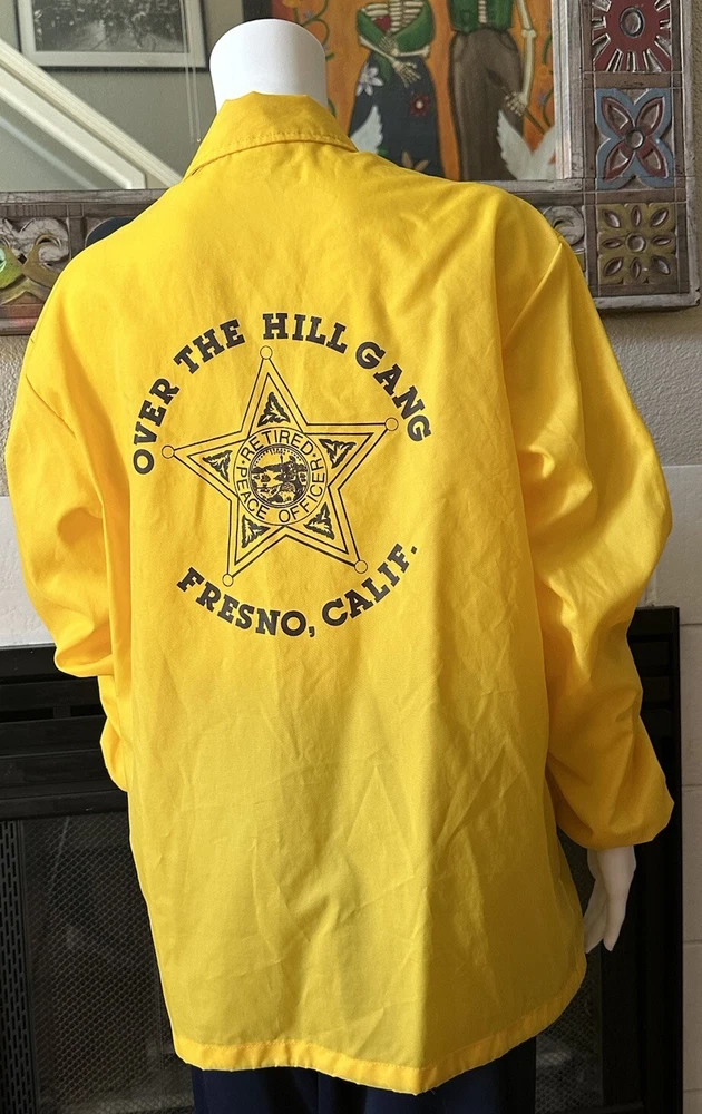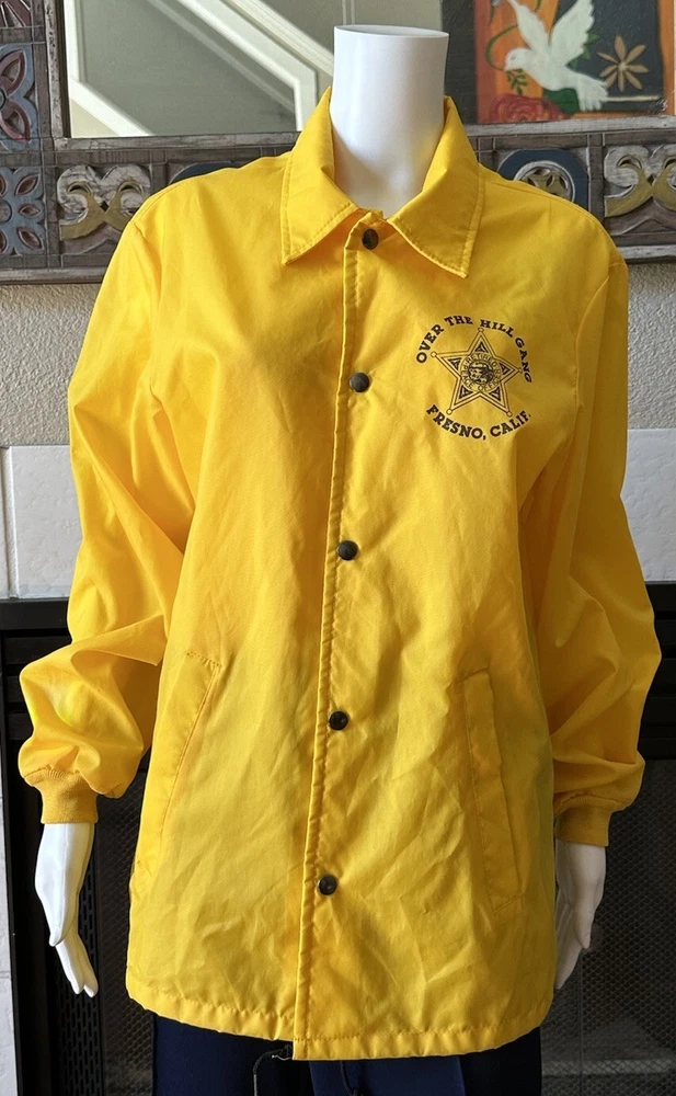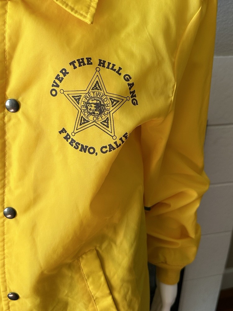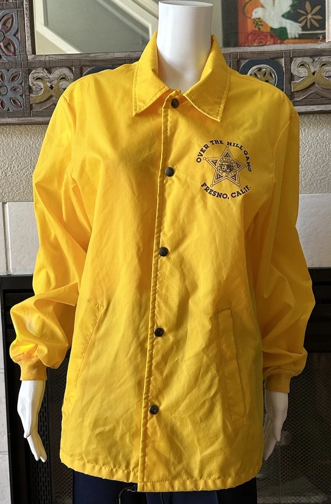This vintage windbreaker jacket from the 80s is a must-have for any fashion-savvy man. With a solid yellow color and black Over The Hill Gang logo, this jacket is perfect for casual occasions, travel, or even parties and cocktails. The jacket features a spread collar, snap and button closures, and a lightweight softshell fabric that makes it suitable for all seasons. The Lasco Inc. brand jacket has a regular fit and is available in size L, with a chest size of 48 inches. It is wind-resistant and perfect for walking every day. The jacket should be hand washed only and has no insulation material. This jacket is a great addition to any wardrobe, and with its peace officer and retirement themes, it's sure to turn heads. Note there is a discoloration mark in front Pointing to area in photo and then close up Measurements Arm pit to arm pit 24” (48”) Sleeve 25” Waist 48” Length top to bottom 29” Shoulder to shoulder 19.5”