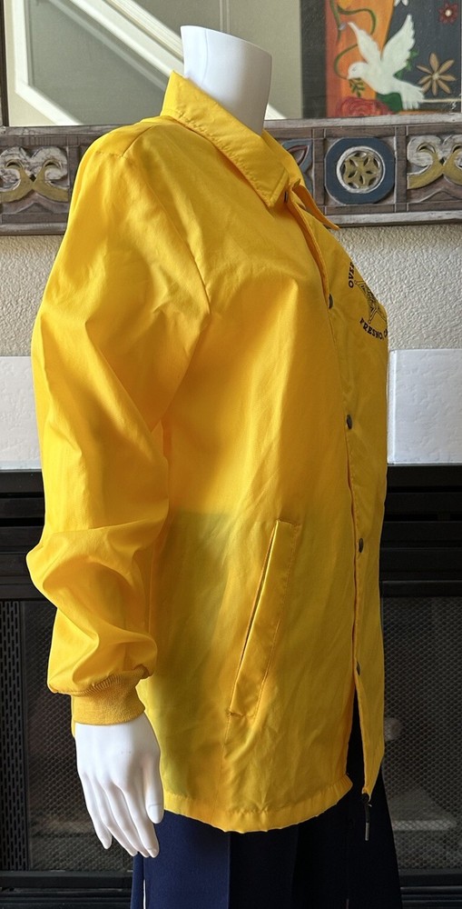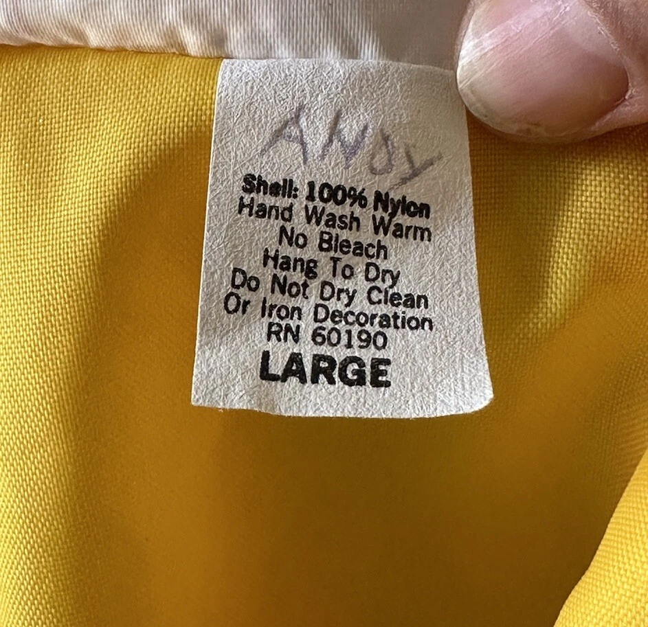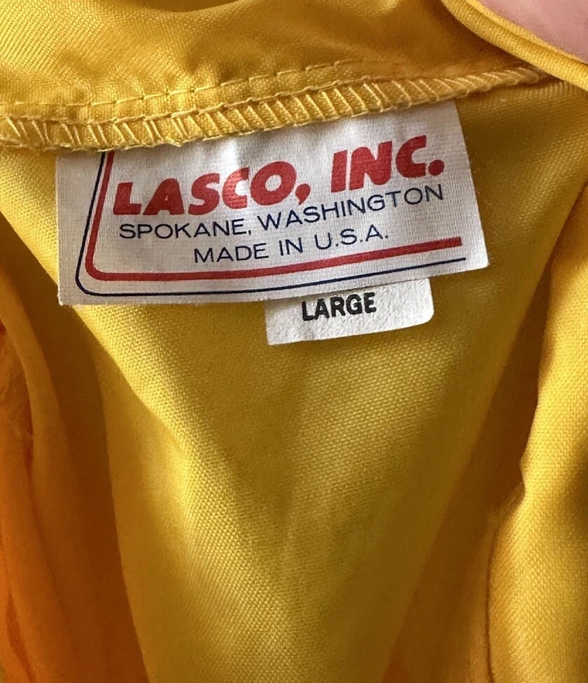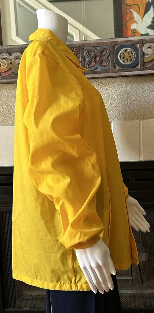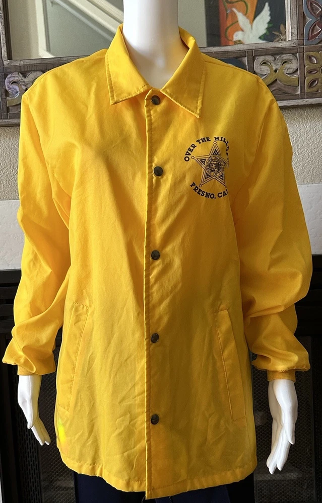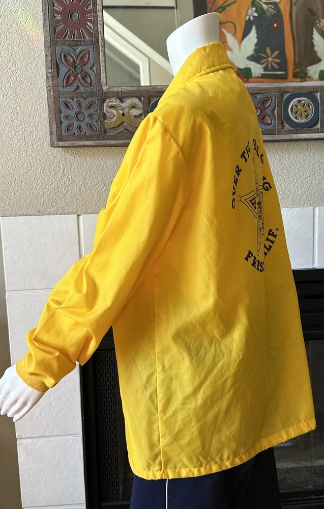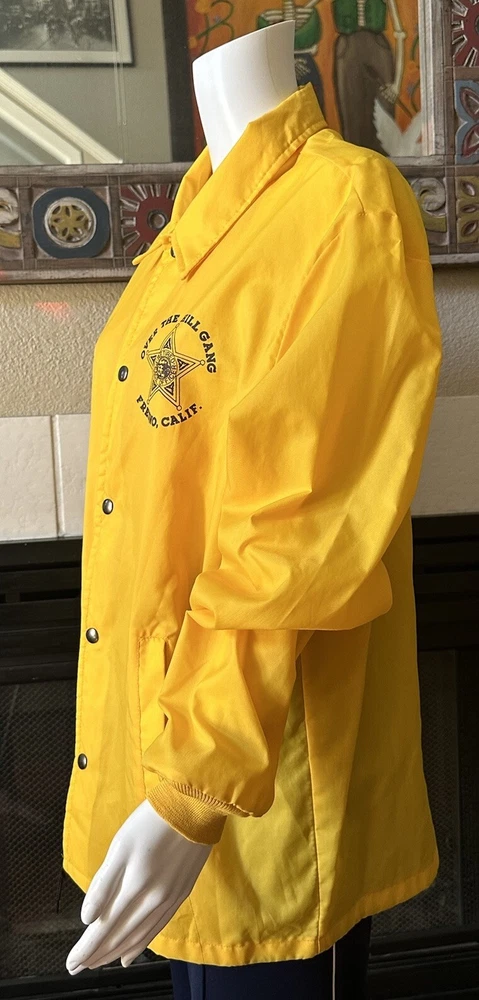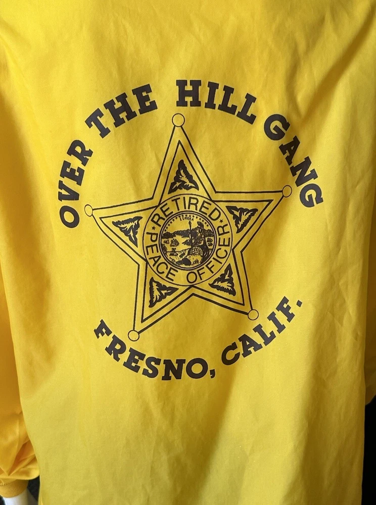 This vintage windbreaker jacket from the 80s is a must-have for any fashion-savvy man. With a solid yellow color and black Over The Hill Gang logo, this jacket is perfect for casual occasions, travel, or even parties and cocktails. The jacket features a spread collar, snap and button closures, and a lightweight softshell fabric that makes it suitable for all seasons. The Lasco Inc. brand jacket has a regular fit and is available in size L, with a chest size of 48 inches. It is wind-resistant and perfect for walking every day. The jacket should be hand washed only and has no insulation material. This jacket is a great addition to any wardrobe, and with its peace officer and retirement themes, it's sure to turn heads. Note there is a discoloration mark in front Pointing to area in photo and then close up Measurements Arm pit to arm pit 24” (48”) Sleeve 25” Waist 48” Length top to bottom 29” Shoulder to shoulder 19.5”