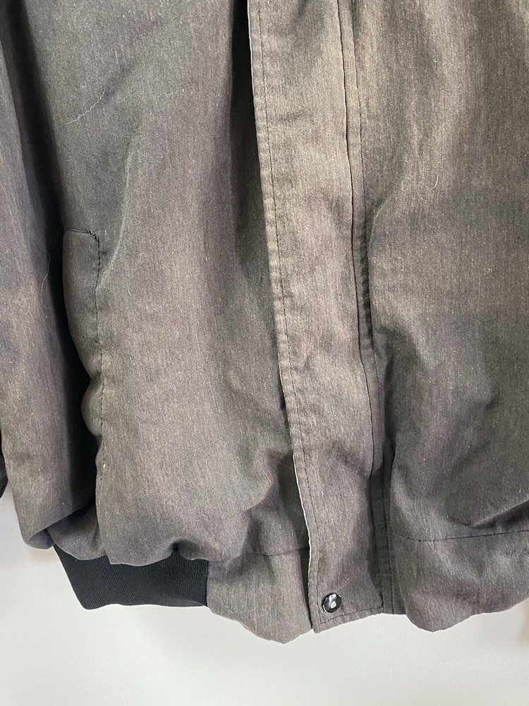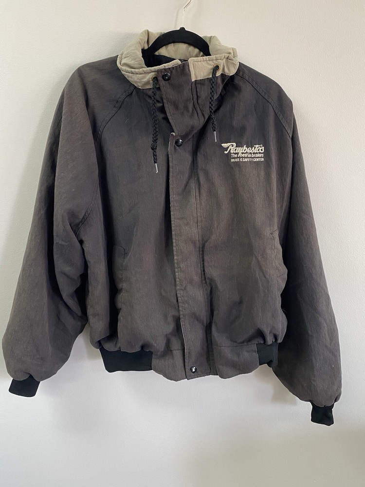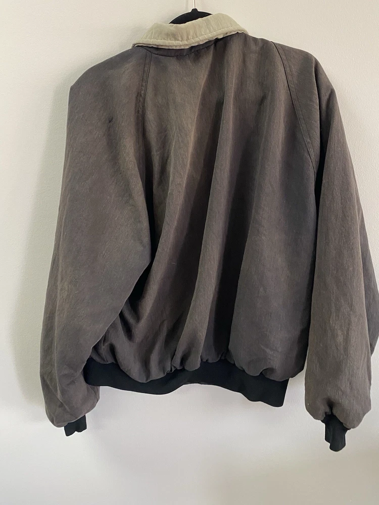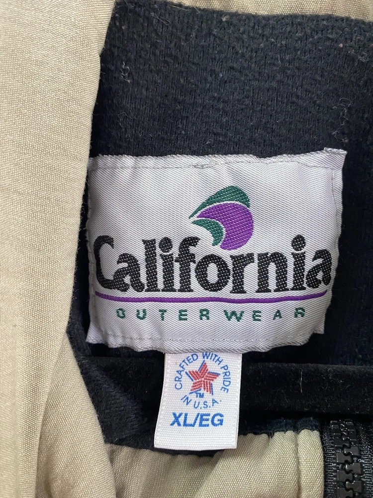 This vintage lightweight bomber jacket in size XL is made in the USA by California Outerwear. The jacket features a solid blue color with a spread collar, zip closure, and polyester lining. It has a classic USA theme and is suitable for all seasons, with wind-resistant and weathergear features. The bomber jacket has a regular fit and is machine washable.