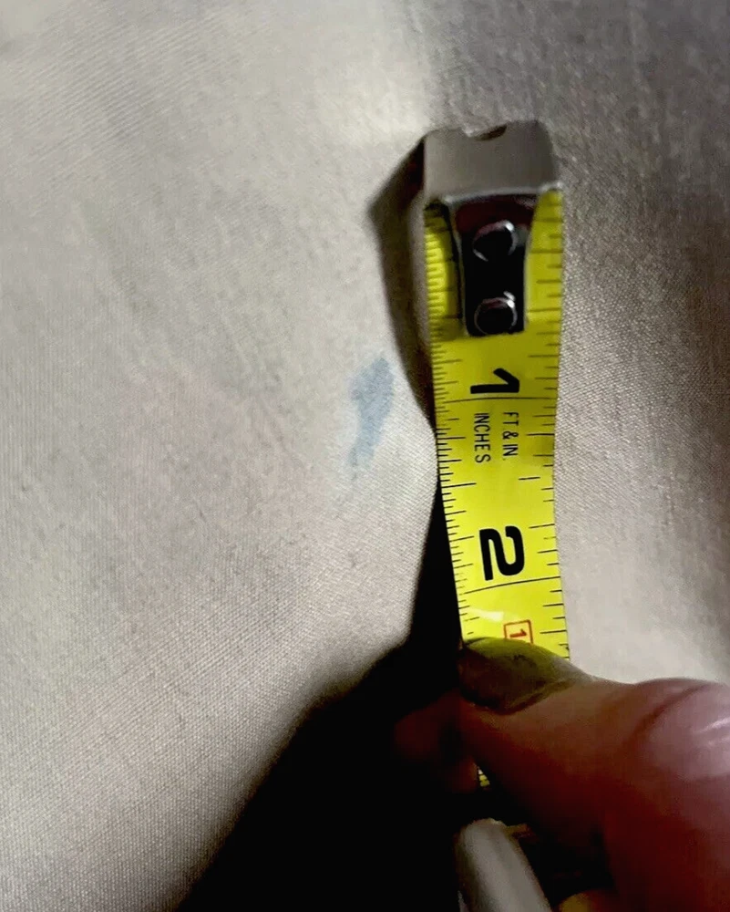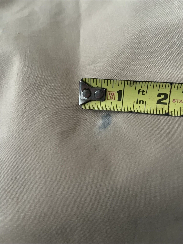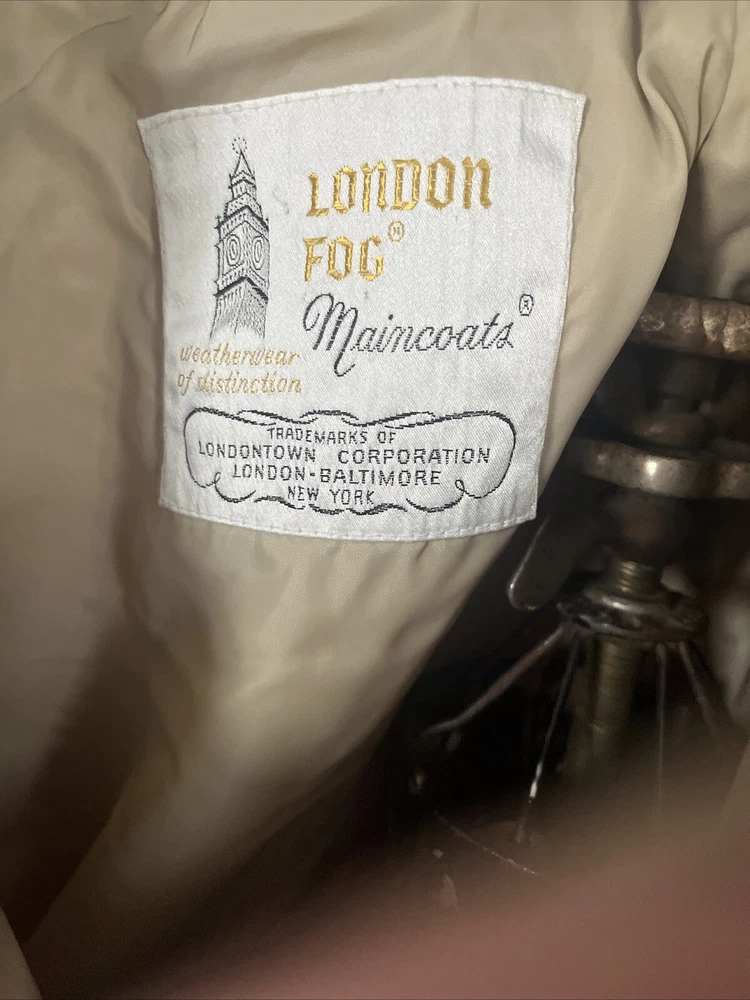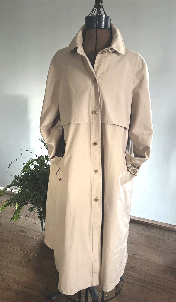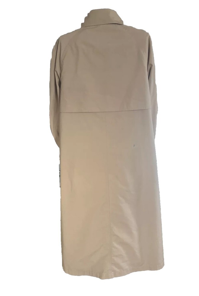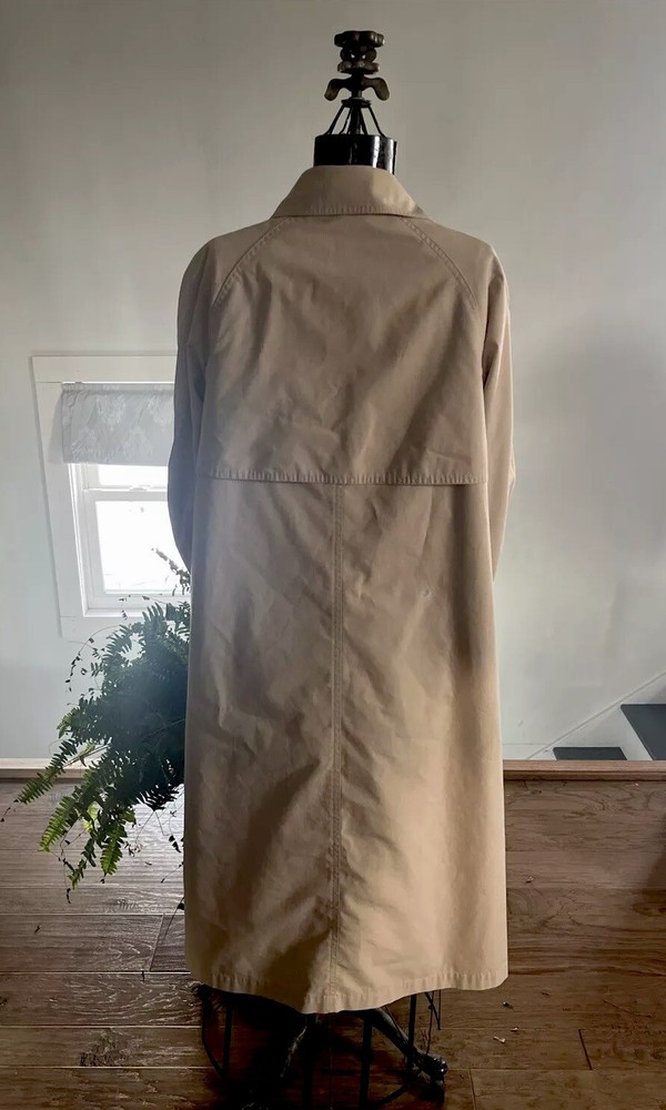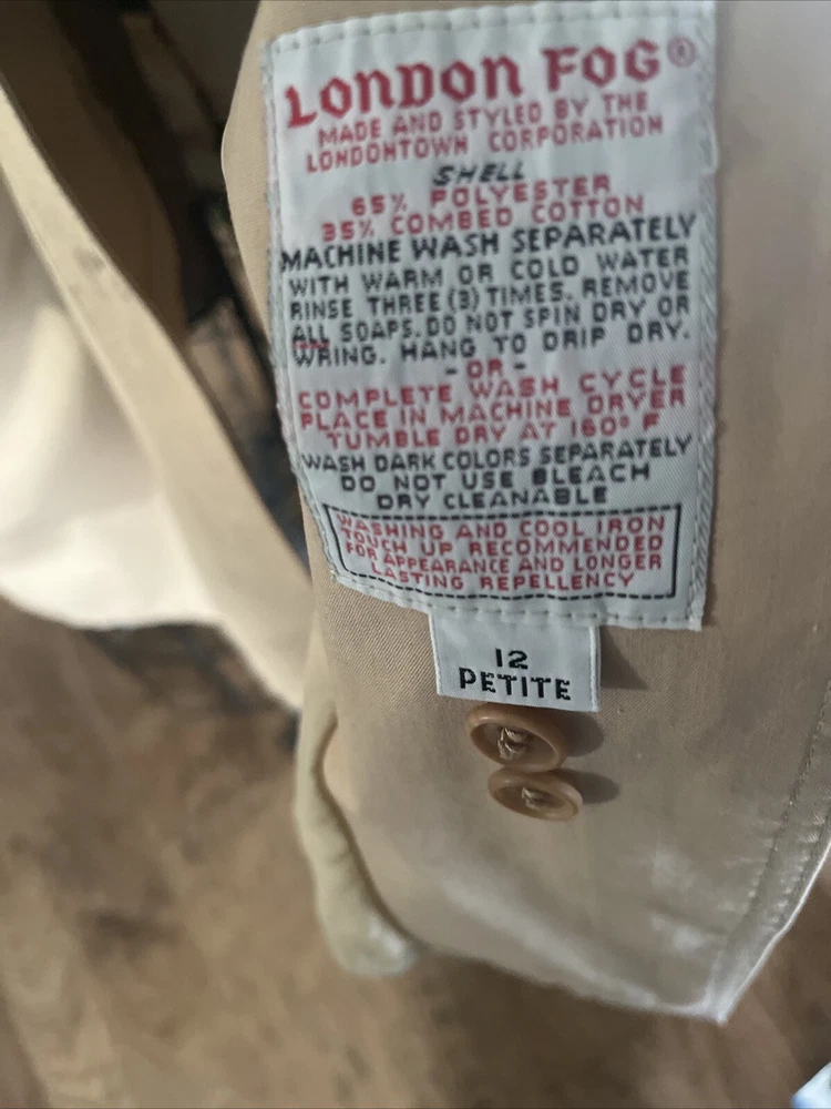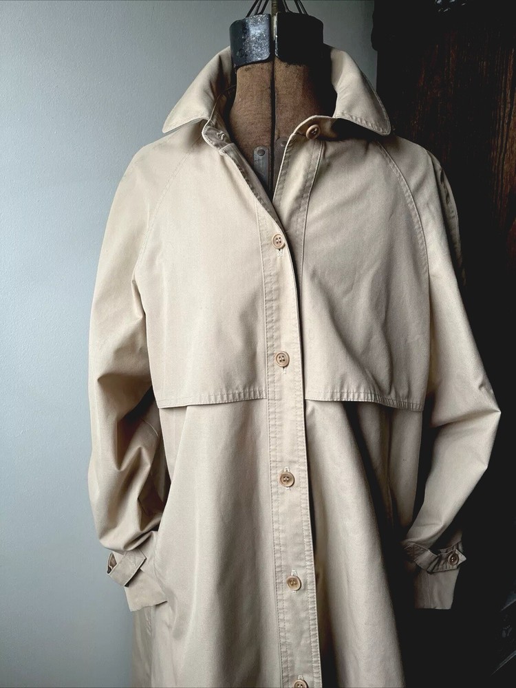 This vintage London Fog Maincoats trench raincoat in tan is a classic piece with a belted, double-breasted design. Made of a polyester and combed cotton blend with a nylon lining, it features a collared neckline, long sleeves, and button closure. Ideal for various occasions like travel, workwear, or casual outings, this water and wind-resistant coat is perfect for the fall, winter, and spring seasons. Please see the pictures of the small blue spot on the back of the coat. The pit-to-pit measurement is 21 inches, and the coat length is 44 inches.