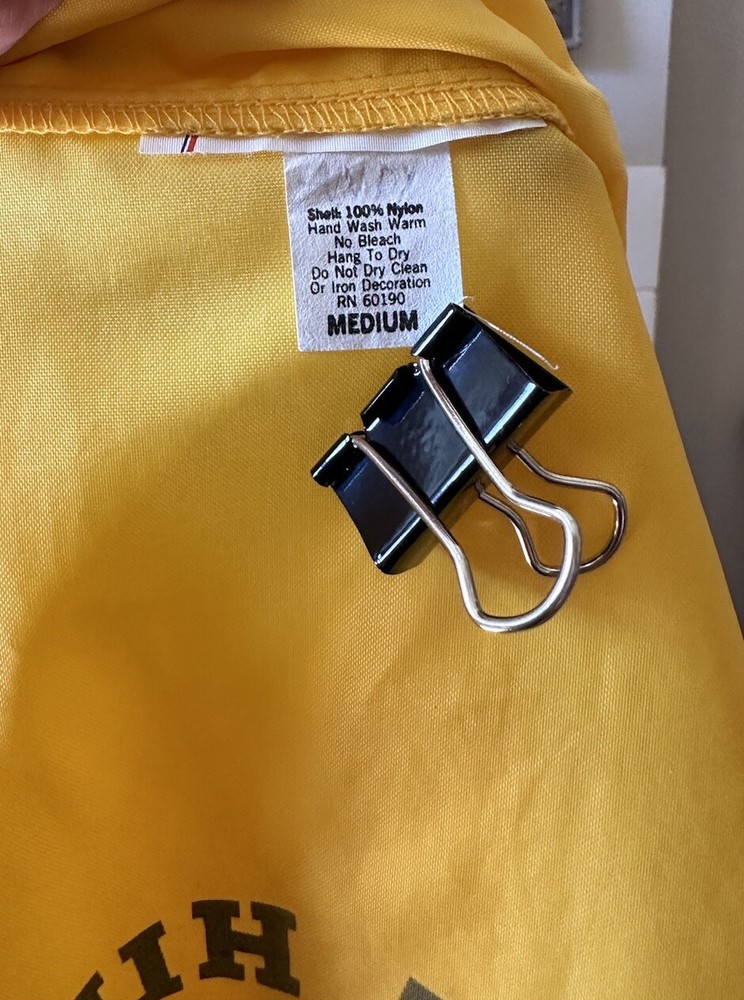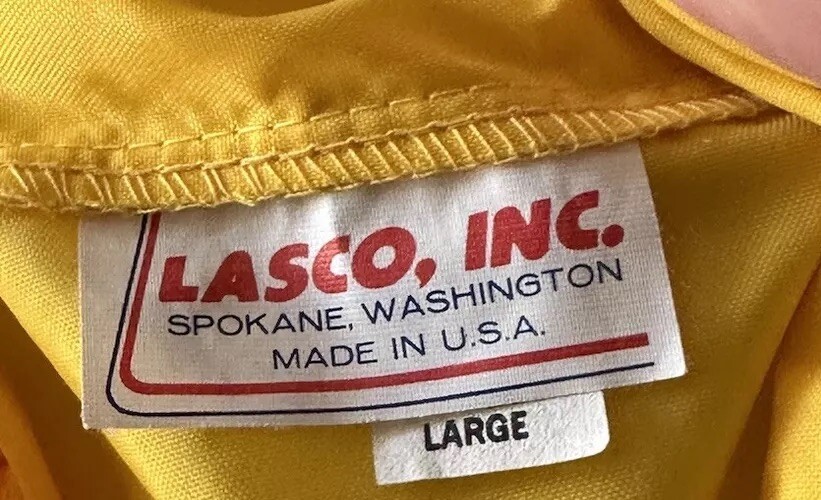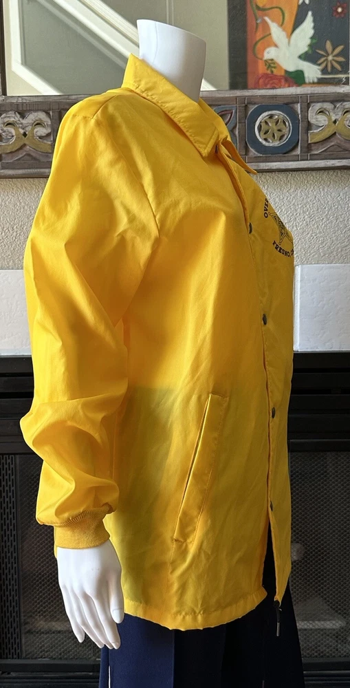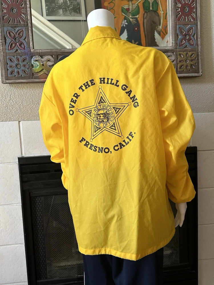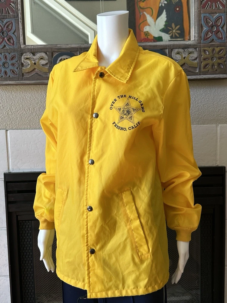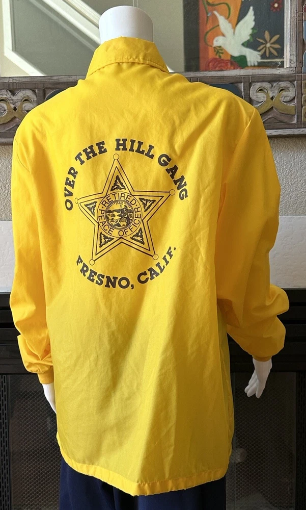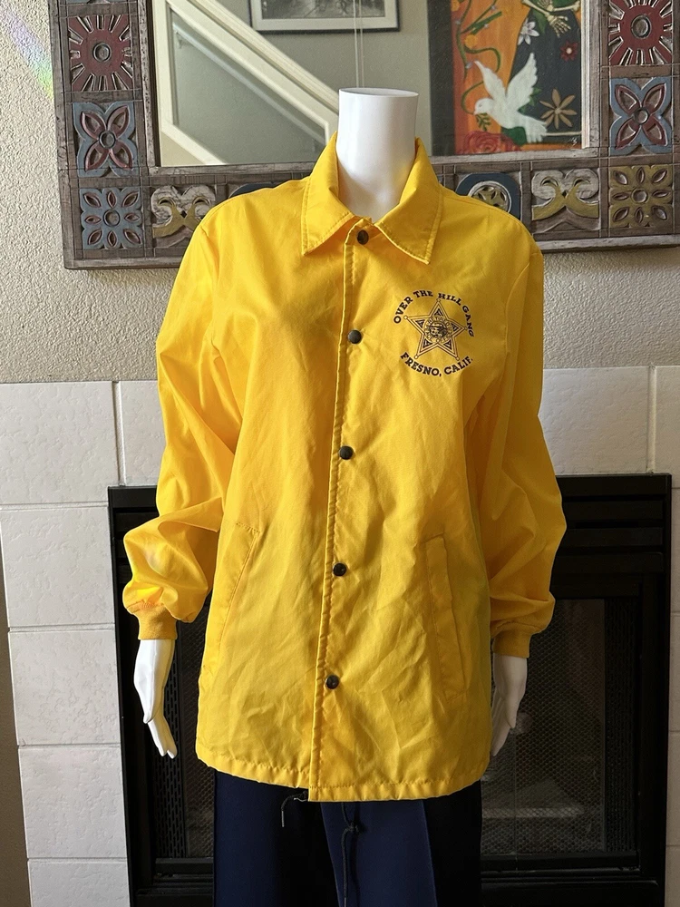 This vintage windbreaker jacket from the 80s is a must-have for any fashion-savvy man. With a solid yellow color and black Over The Hill Gang logo, this jacket is perfect for casual occasions, travel, or even parties and cocktails. The jacket features a spread collar, snap and button closures, and a lightweight softshell fabric that makes it suitable for all seasons. The Lasco Inc. brand jacket has a regular fit and is available in size medium, with a chest size of 44 inches. It is wind-resistant and perfect for walking every day. The jacket should be hand washed only and has no insulation material. This jacket is a great addition to any wardrobe, and with its peace officer and retirement themes, it's sure to turn heads. There is also one in large on my site. Measurements Arm pit to arm pit 22” (44”) Sleeve 25” Waist 44” Length top to bottom 28.5” Shoulder to shoulder 18”