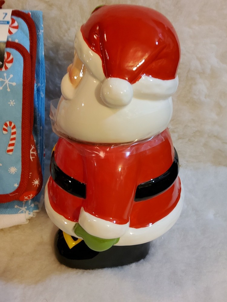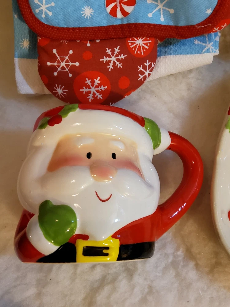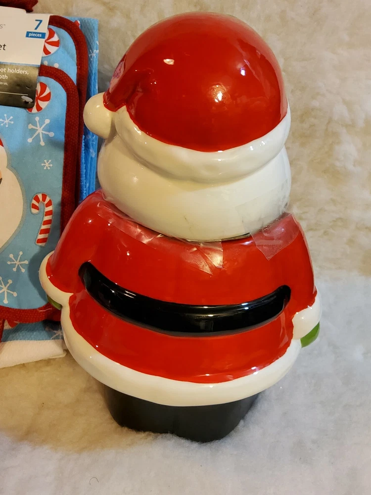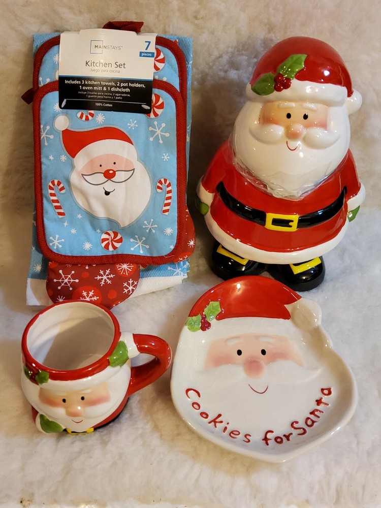 Vintage 2000's Christmas Holiday Complete Santa set . The set starts with a Vintage Smiling Santa Cookie Jar Figurine Approx 11. " tall x 6" width , The set continues with a Vintage Christmas Santa Face Plate & Cup, "Cookies for Santa" Holiday 2000's ceramic glazed, plate measures: 8" ; Cup/ mug measures: 4" W w/ handle, Lastly we have a 7 PC Towel Mainstays Kitchen Textiles Holiday Christmas edition Set 100% Cotton Machine washable Package includes 2 kitchen towels, 2 dishcloths, 2 potholders and 1 ovenmitt \ Brand New This adorable Santa complete set that will evoke memories for Parents & Grandparents with decorative pieces . Whether it is your Children or Grandchildren, memories will be made setting out milk & cookies for Santa. The set is selling as new or other, displayed only, never used and is in excellent used condition. You will not find any part of this set on ebay, they have been long discontinued over 20yrs 1.11