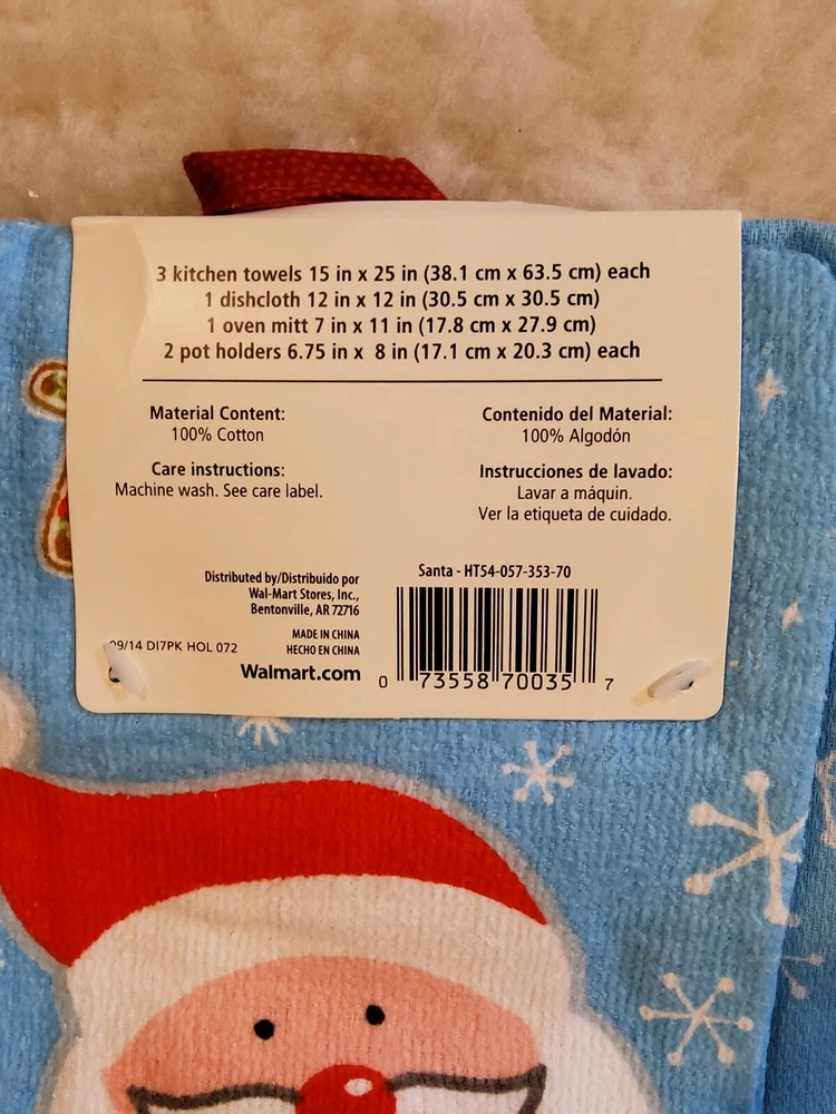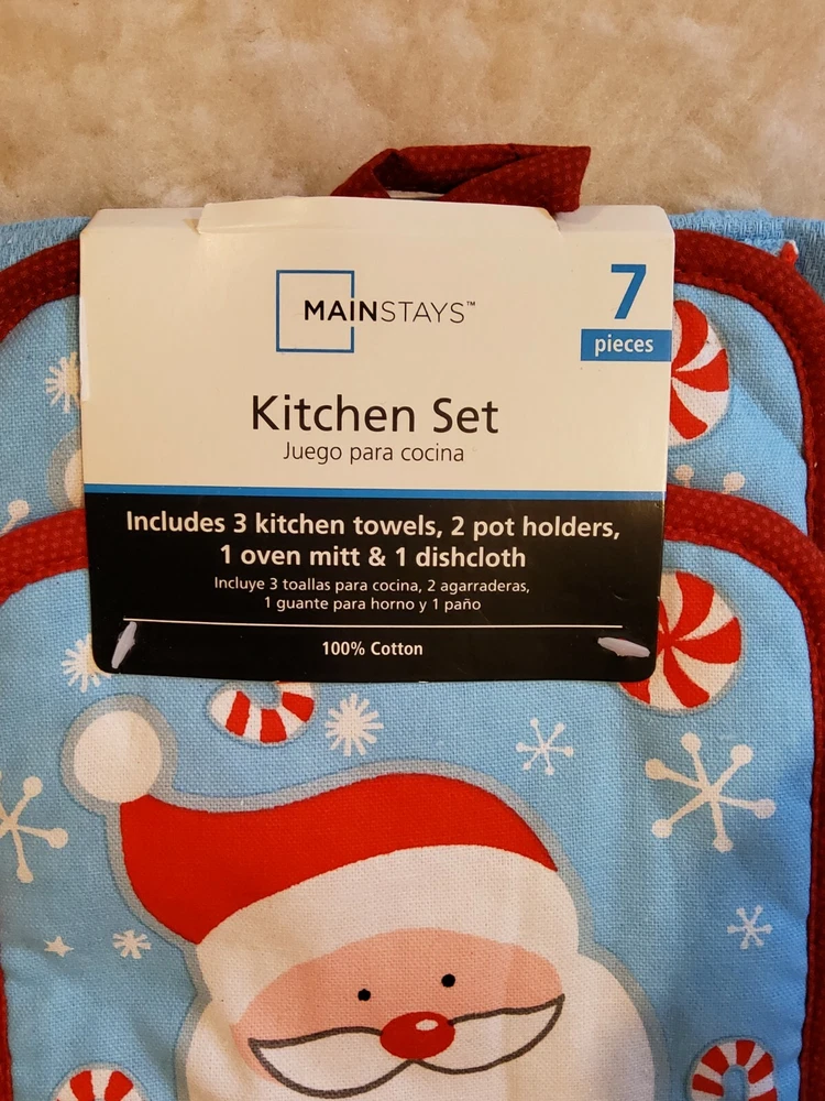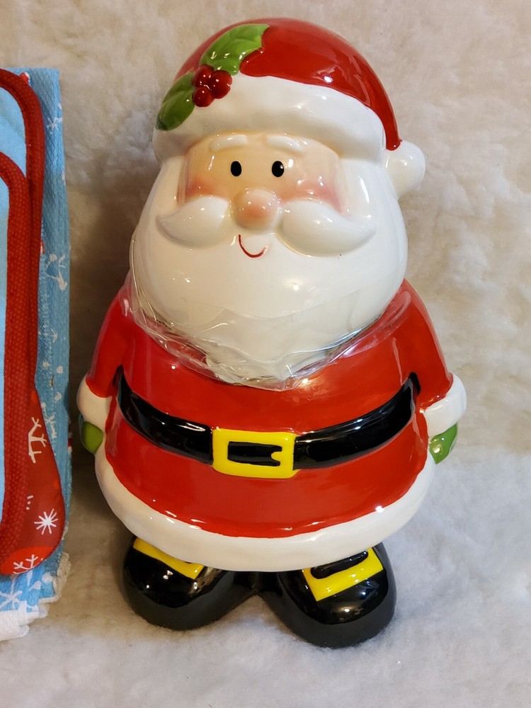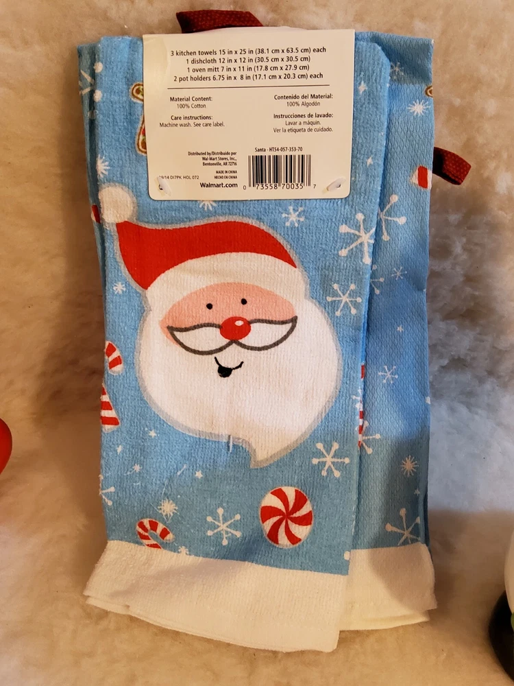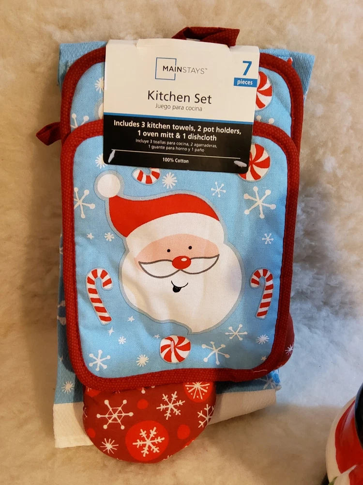 Vintage 2000's Christmas Holiday Complete Santa set . The set starts with a Vintage Smiling Santa Cookie Jar Figurine Approx 11. " tall x 6" width , The set continues with a Vintage Christmas Santa Face Plate & Cup, "Cookies for Santa" Holiday 2000's ceramic glazed, plate measures: 8" ; Cup/ mug measures: 4" W w/ handle, Lastly we have a 7 PC Towel Mainstays Kitchen Textiles Holiday Christmas edition Set 100% Cotton Machine washable Package includes 2 kitchen towels, 2 dishcloths, 2 potholders and 1 ovenmitt \ Brand New This adorable Santa complete set that will evoke memories for Parents & Grandparents with decorative pieces . Whether it is your Children or Grandchildren, memories will be made setting out milk & cookies for Santa. The set is selling as new or other, displayed only, never used and is in excellent used condition. You will not find any part of this set on ebay, they have been long discontinued over 20yrs 1.11