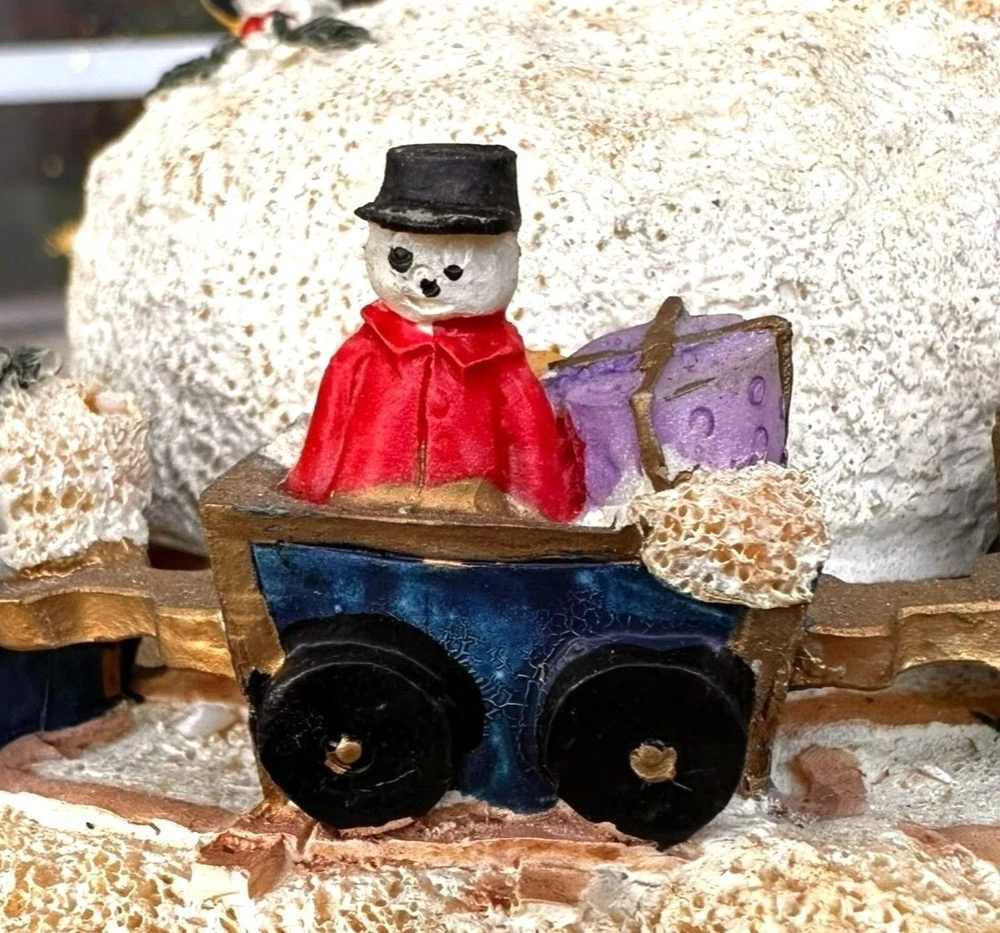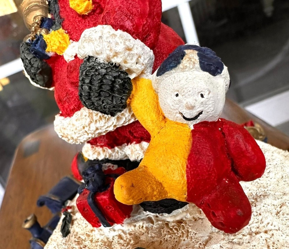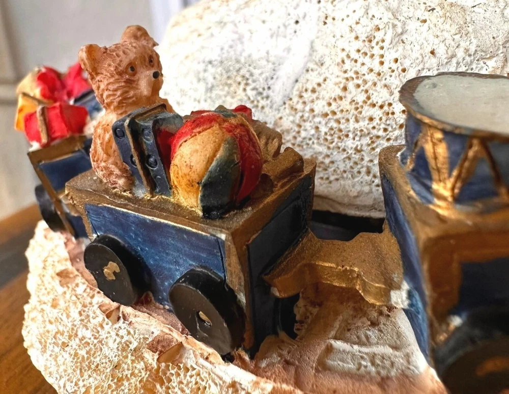 This charming vintage wind-up musical bear is a nostalgic holiday gem! The train circles the track smoothly when wound, and the Santa-dressed bear with his tiny companion is absolutely adorable. The original box adds to its collectible charm, with only minor wear. At 7" tall, it’s a delightful display piece—great condition, full of festive cheer! Perfect for holiday decor or as a sweet gift for vintage toy lovers.
