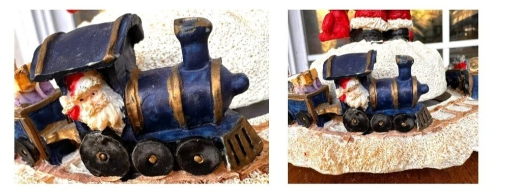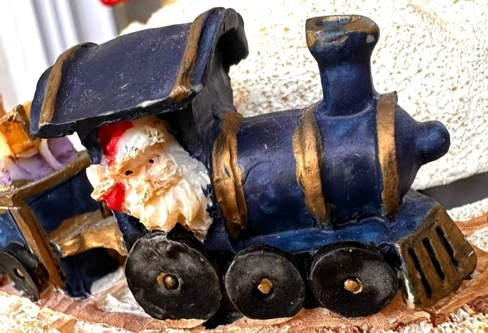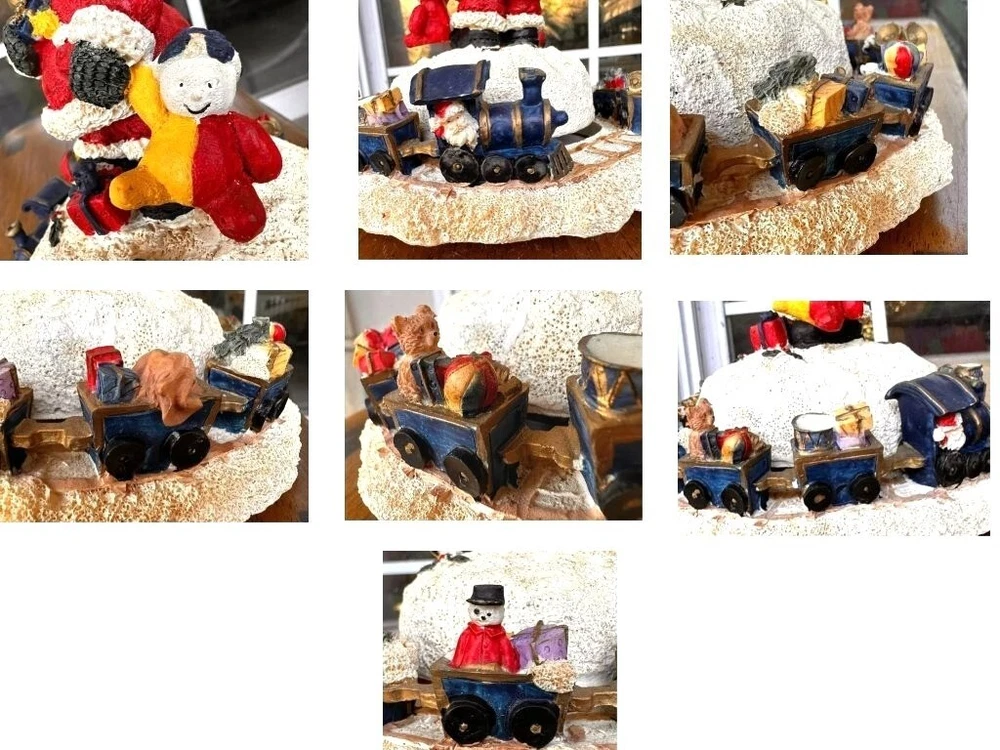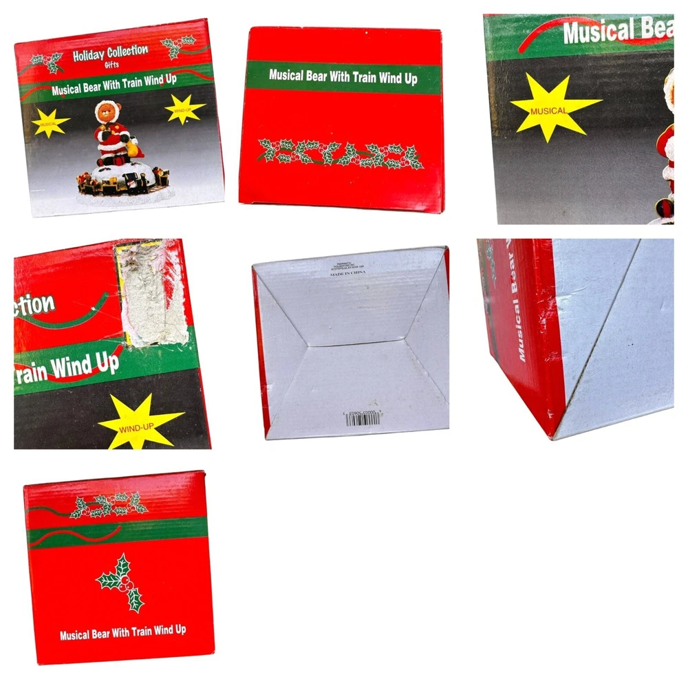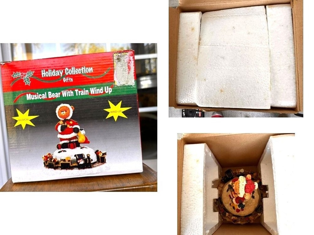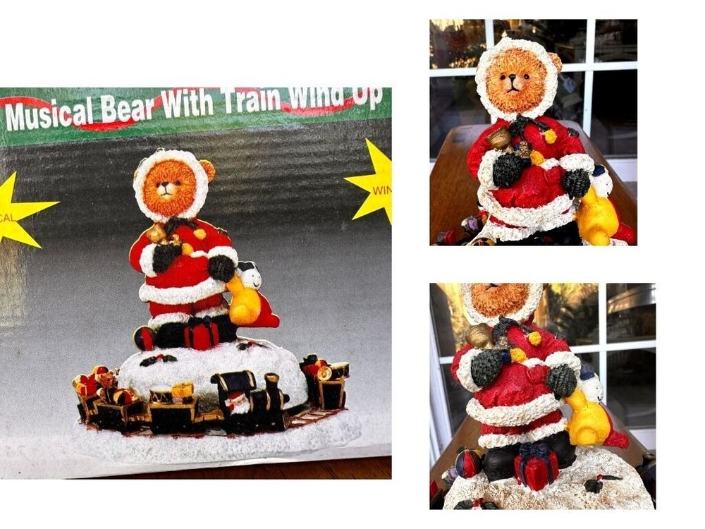 VTG Musical Bear with Train Wind Up Christmas Holiday Collection Santa Nostalgic Great pre-owned Vintage condition...winds up(see last pic) and the train goes around the track In original box...box shows some minor wear. Bottom of item shows some minor wear, wind up mechanism works very well Wind up part of this adorable vintage Christmas item, works well with no issues noted 7" tall x 5" W The bear is all dressed up in his Santa outfit & holding a cute bear in one hand Train has Santa waving out of one of trains A snowman is pulling up the caboose Please see all of my pictures as they best describe this great vintage item From the research that I have done, I believe the material is resin & hand painted Vintage items like this are timeless and represent the childhood of nostalgia with the wonder of Christmas No chips or cracks noted Some ,minor wear on some of the paint...not sure if this is a manufacturer defect or from age, use, storage Measurements approximate Pet, Smoke free environment