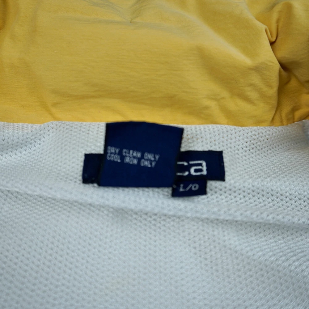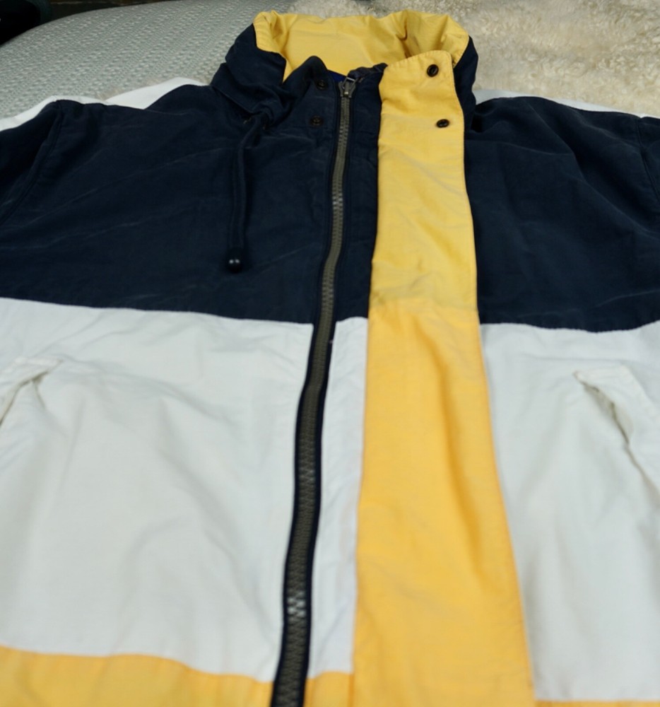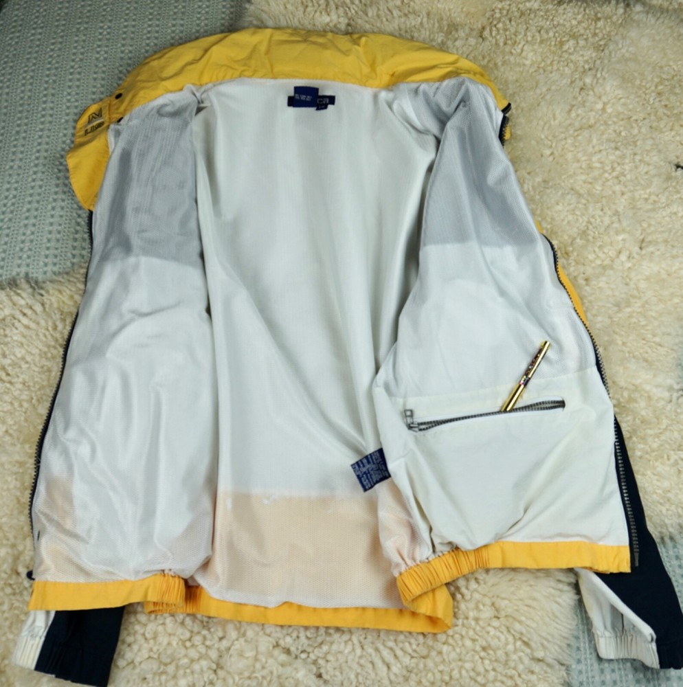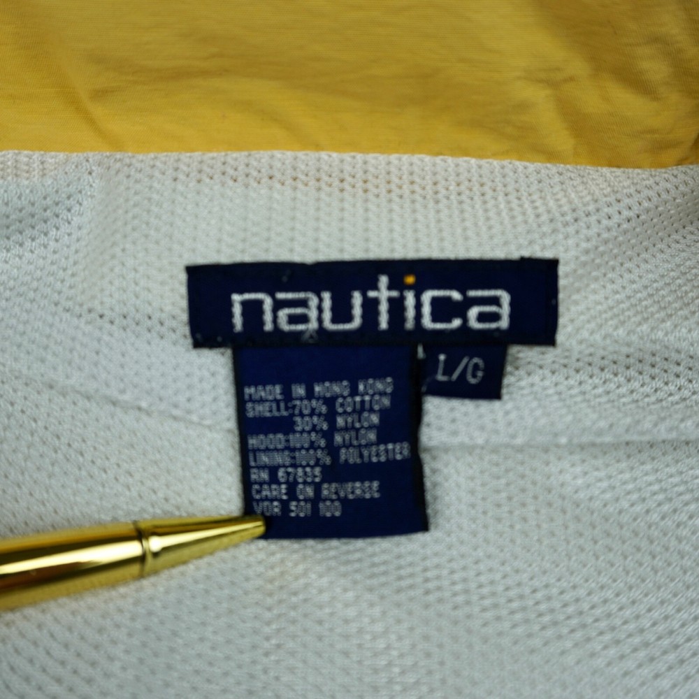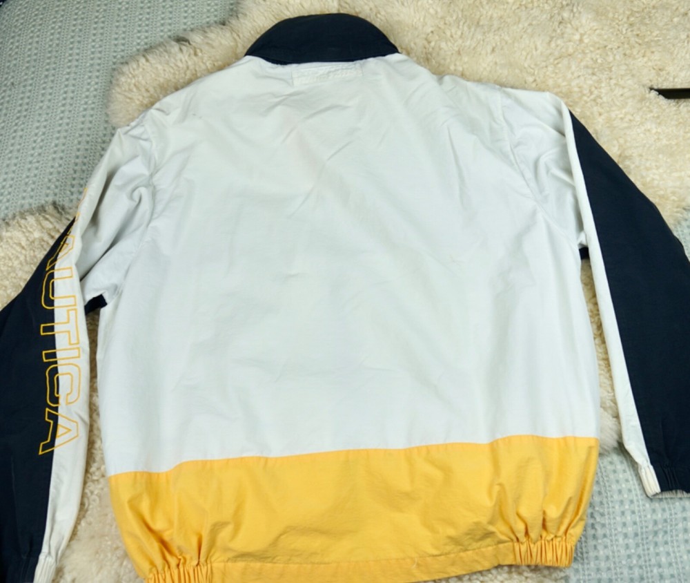 Very good vintage condition - there are some blemishes on the fabric. Please see photos for details. No rips or holes. All zippers and snaps are intact and fully functional. Lined. This Nautica windbreaker jacket is a must-have for any outdoor activity. With a classic fit and mid-length design, it features a stand-up collar, hook and loop closure, zipper and button closure, and a removable hood. The jacket is made of 100% nylon and cotton blend material, making it wind-resistant and lightweight for all seasons. The white jacket has an embroidered Nautica logo and is lined with cotton for added comfort. It is suitable for travel, casual wear, and various activities such as walking, golf, baseball, hockey, lacrosse, basketball, racing, and bodybuilding. The jacket is machine washable and comes in size L.