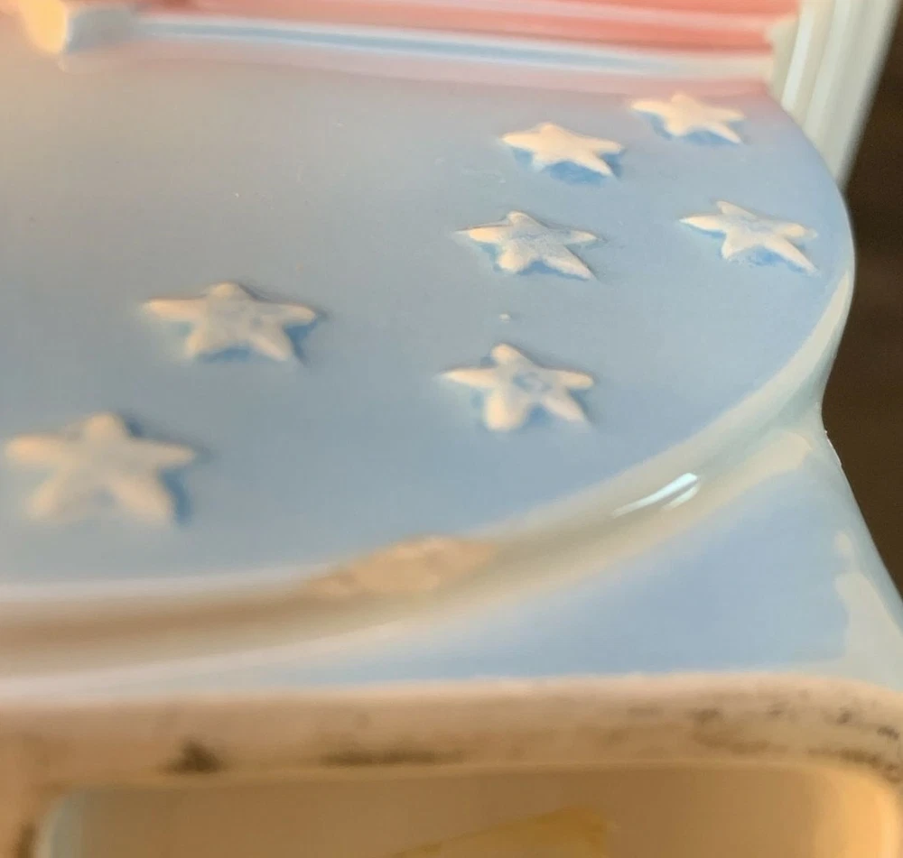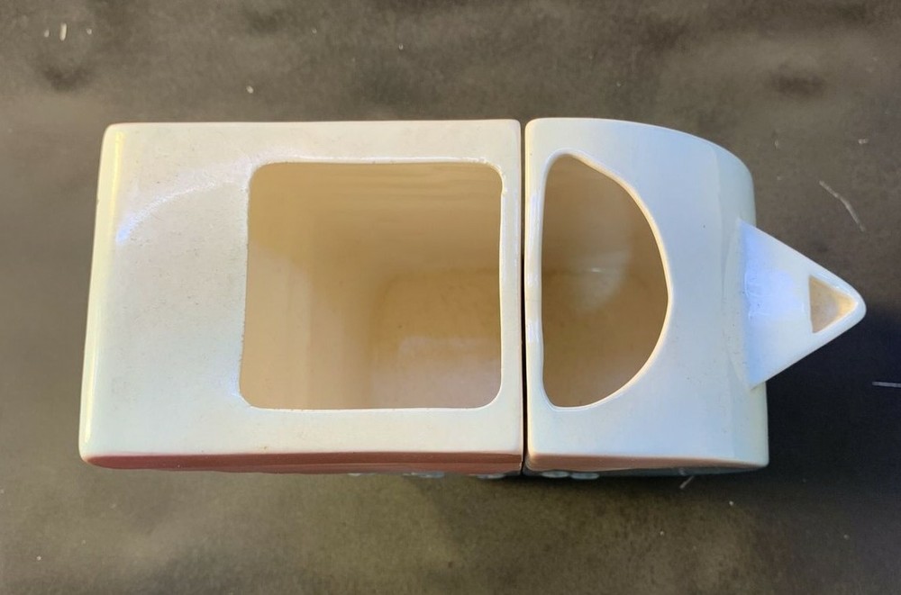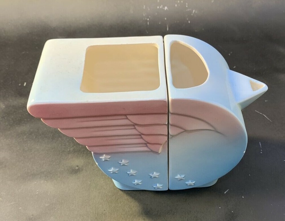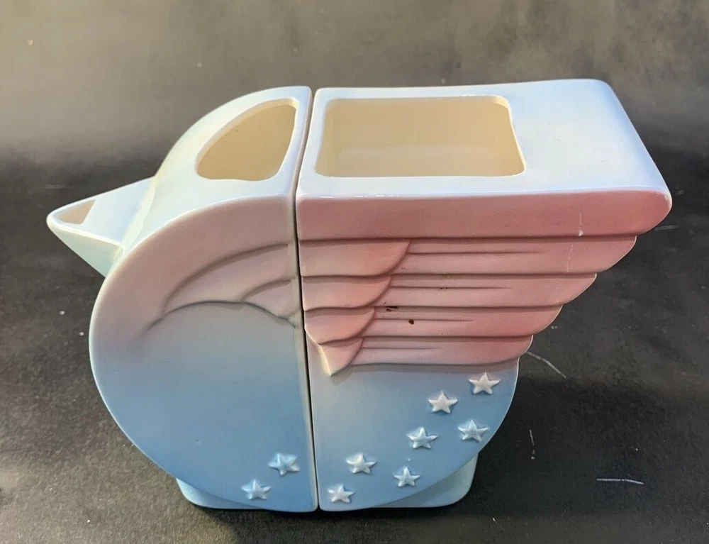 VTG Pelzman Designs Vandor 1979 Ceramic Sugar & Creamer Set "Wings & Stars" No Lid *** We believe this is a vintage Pelzman Designs Vandor Imports sugar and creamer set, in the "Wings & Stars" pattern, from 1979. We say we "believe" it is a sugar/creamer set, because our research has yielded no other items like it for sale, so we think this is definitely a rare set. If it is, indeed, a creamer and sugar set, the sugar container may have had a lid, which is missing from the set. The pieces measure about 4-1/2" tall, and measure 6-1/2" from the tip of the creamer spout to the "tail wings" of the sugar container. Together, the set weighs about 12 oz. The pastel pink and blue in these pieces complement each other nicely. Each of the pieces has a minor fleabite in an edge of the ceramic piece, and the "sugar" has a scratch on the white side of the piece that is meant to be stored adjacent to the cream pitcher (see photos). Thus, the set is priced accordingly. We have tried our best to take photos of the imperfections. Given the age of this set, the set is in good condition. This pattern reminds us of a design Wonder Woman would use when serving her guests! :-) Please see our other listings for additional Pelzman Vandor Wings & Stars pieces. We offer discounts for multiple orders and would be happy to combine shipping on orders from multiple listings. Please examine all photos, as they are part of the description. Thank you for shopping with us!