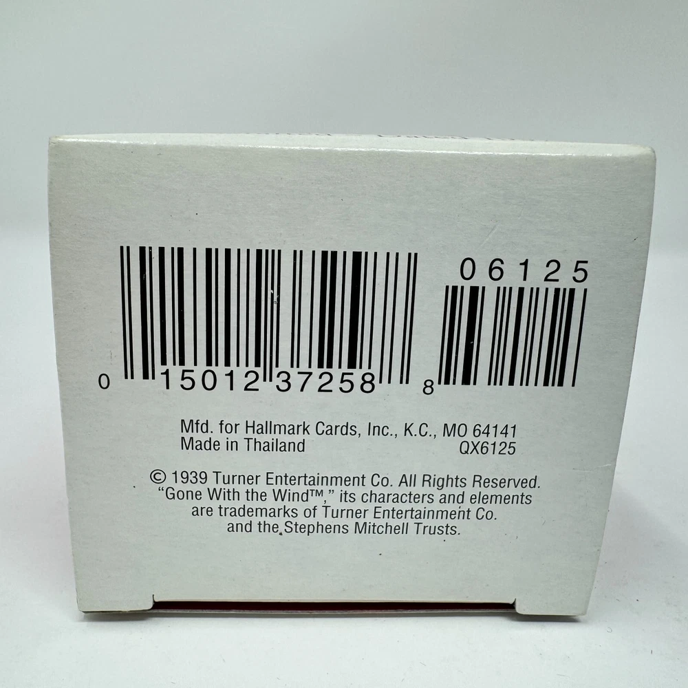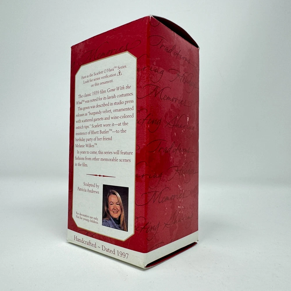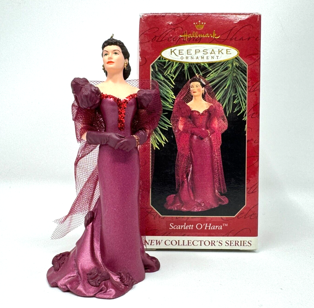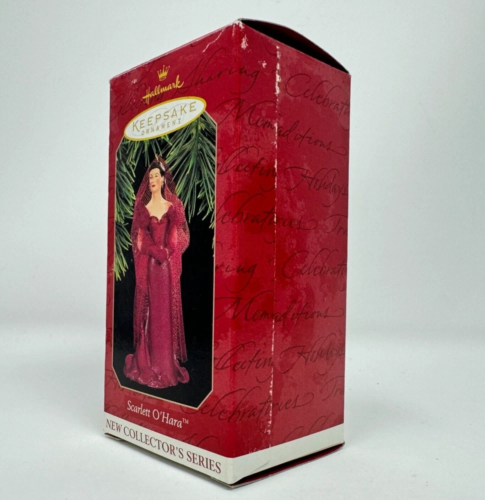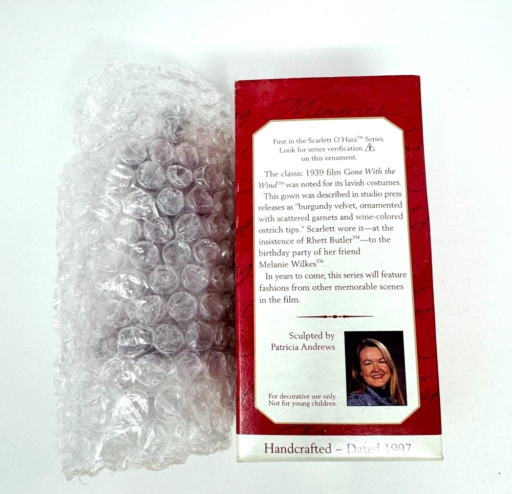 Add a touch of vintage glamour to your holiday decor with this beautiful Hallmark ornament featuring Scarlett O'Hara in her iconic burgundy dress from Gone with the Wind. Crafted with mixed materials and handcrafted in Thailand, this small ornament is perfect for any GWTW fan or collector of vintage ornaments. The multicolor design and intricate details make it a standout piece in any collection. This Scarlett O'Hara ornament is a must-have for any fan of the classic movie and is sure to be a conversation starter during the holiday season. Whether you're looking to add to your collection or just want to add a touch of elegance to your decor, this vintage Hallmark ornament is the perfect choice. VTG SCARLETT OHARA Burgundy Dress 1997 Hallmark Ornament Gone with the Wind IOB. Ornament is in excellent used condition. Mixed materials - plastic and fabric. Wrapped in bubble wrap and in original box. Box has some shelf wear - creasing - marks. Price tag has been removed.