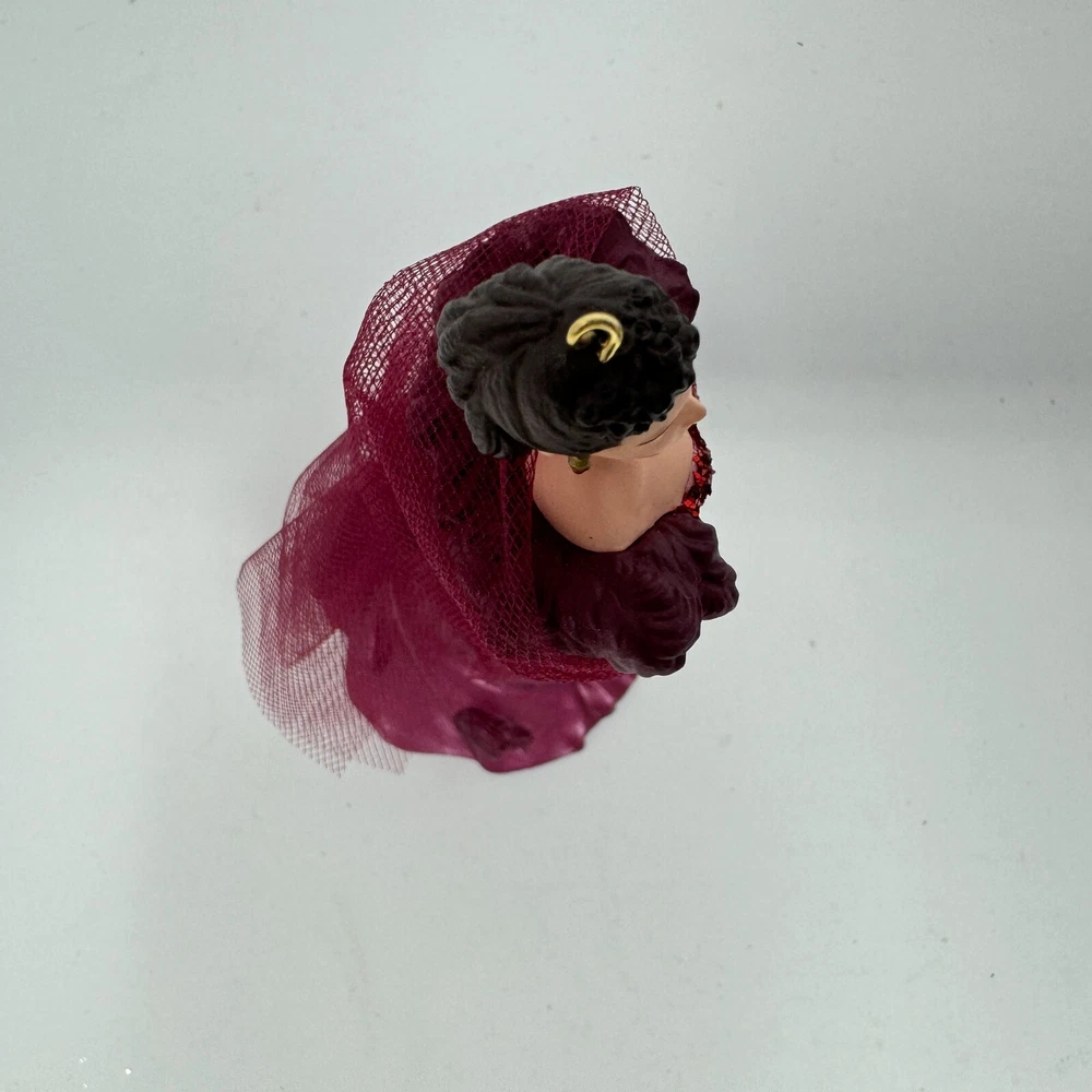This charming Hallmark ornament captures Scarlett O'Hara’s elegance with stunning detail—her burgundy gown is beautifully crafted, making it a nostalgic treasure for Gone with the Wind fans. The mixed materials and hand-painted touches give it a vintage feel, perfect for collectors or holiday displays. A lovely keepsake that adds classic Hollywood charm to any tree!