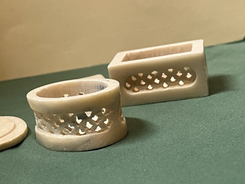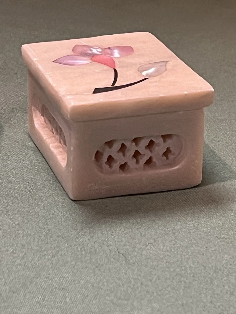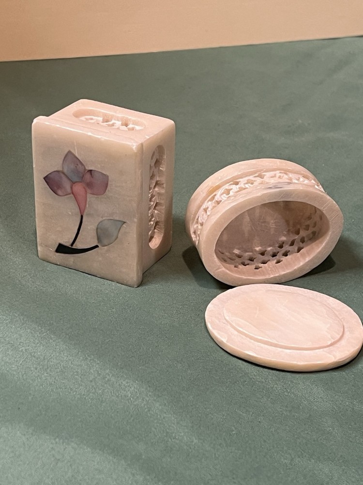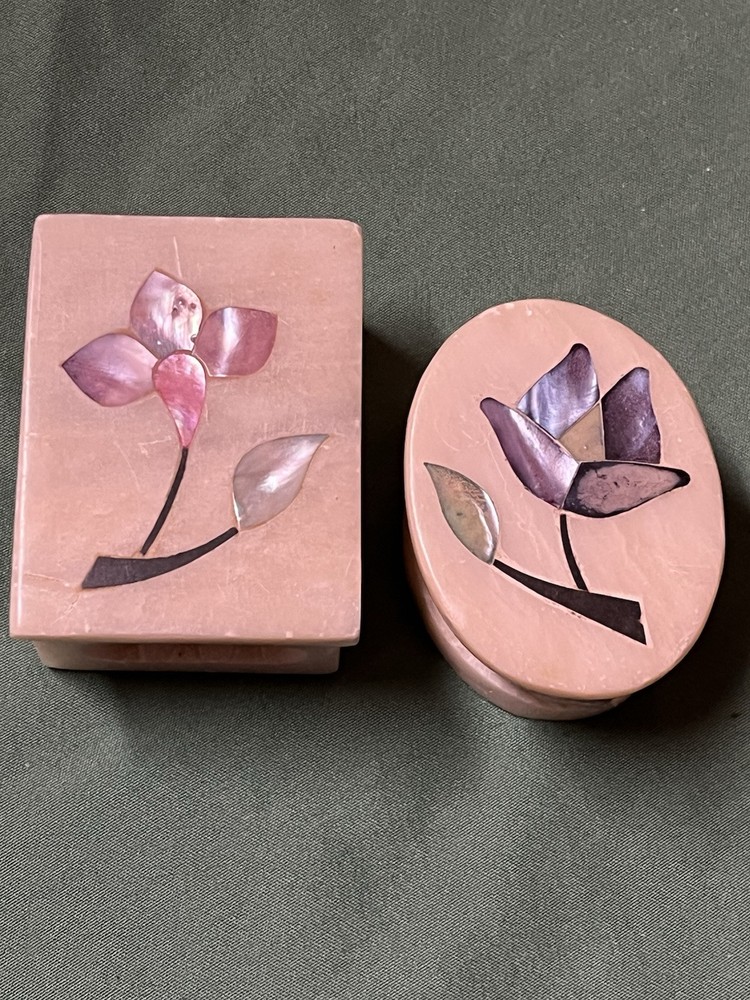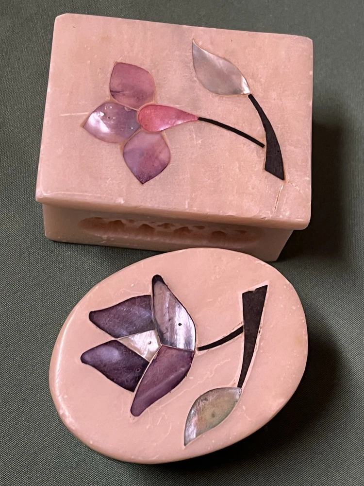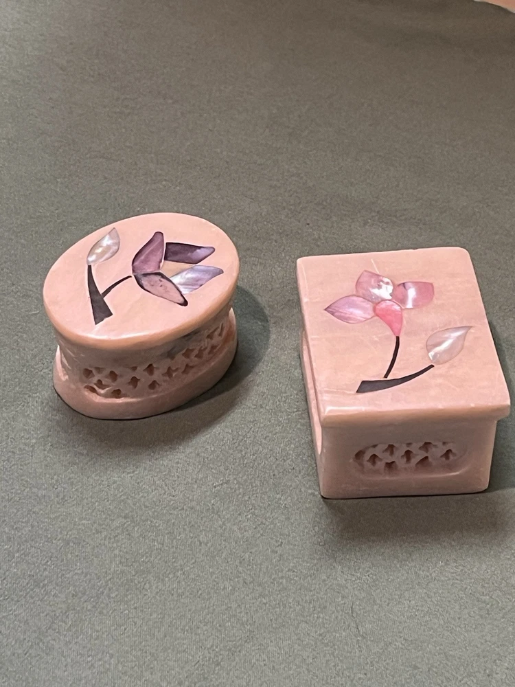 These vintage soapstone trinket boxes are absolutely stunning! Handcrafted in India, the intricate flower patterns and mother-of-pearl inlays give them a unique, elegant charm. The oval and square shapes are perfect for organizing jewelry, keys, or small keepsakes, and the removable lids make access effortless. A beautiful, functional addition to any dresser or nightstand!