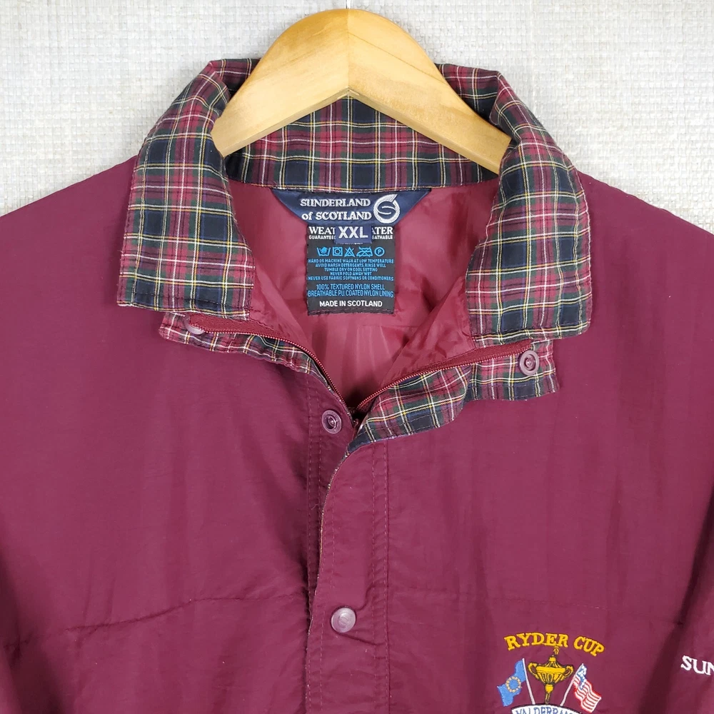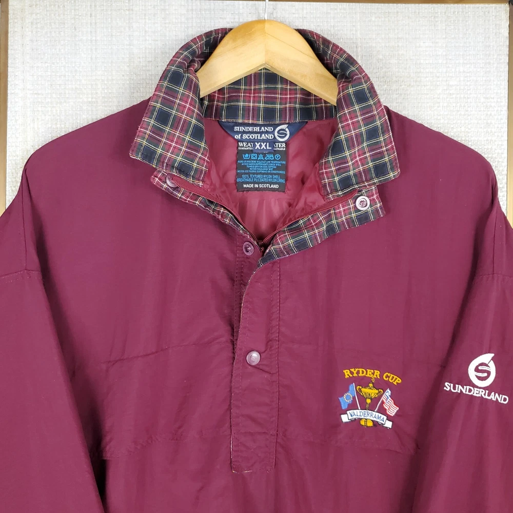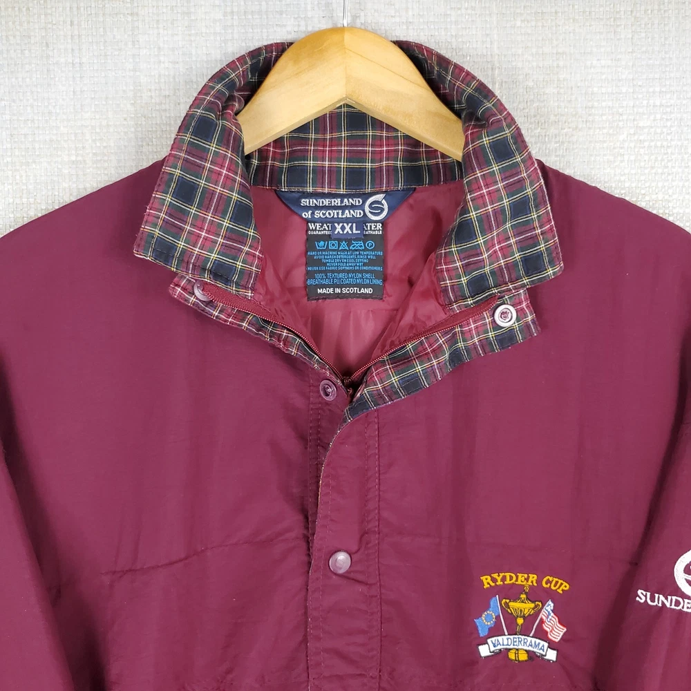 Sunderland of Scotland Men's Waterproof/Breathable 1/4 Zip Windbreaker Jacket Made in Scotland 1997 Ryder Cup - Valderamma Golf Club - Sotogrande, Spain Tiger Woods 1st Ryder Cup Features: -1/4 Zip -Snap Storm Flap -Side Hand Pockets -Waterproof -Windproof -Breathable -Moisture Wicking -Ryder Cup Chest Logo -Sunderland Sleeve Logo Material: 100% Nylon - Waterproof Polyurethane Membrane Size: 2XL Color: Oxblood Red Chest(armpit to armpit): 30" Length: 30" Condition: excellent condition-no rips, stains, tears, holes-appears and feels sparingly worn Shipping: USPS Ground Advantage Fast Same Day Shipping on all 3500+ Items