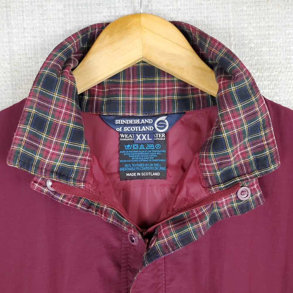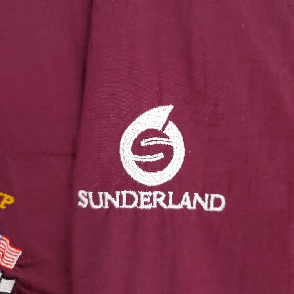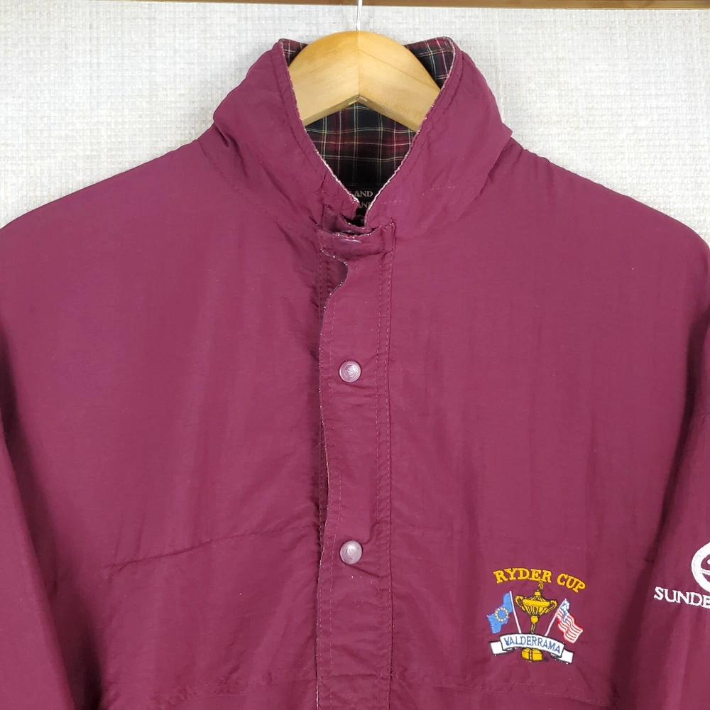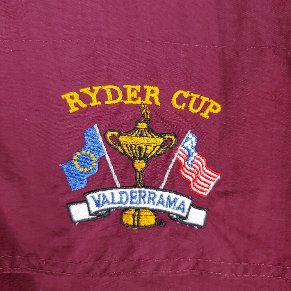 Sunderland of Scotland Men's Waterproof/Breathable 1/4 Zip Windbreaker Jacket Made in Scotland 1997 Ryder Cup - Valderamma Golf Club - Sotogrande, Spain Tiger Woods 1st Ryder Cup Features: -1/4 Zip -Snap Storm Flap -Side Hand Pockets -Waterproof -Windproof -Breathable -Moisture Wicking -Ryder Cup Chest Logo -Sunderland Sleeve Logo Material: 100% Nylon - Waterproof Polyurethane Membrane Size: 2XL Color: Oxblood Red Chest(armpit to armpit): 30" Length: 30" Condition: excellent condition-no rips, stains, tears, holes-appears and feels sparingly worn Shipping: USPS Ground Advantage Fast Same Day Shipping on all 3500+ Items