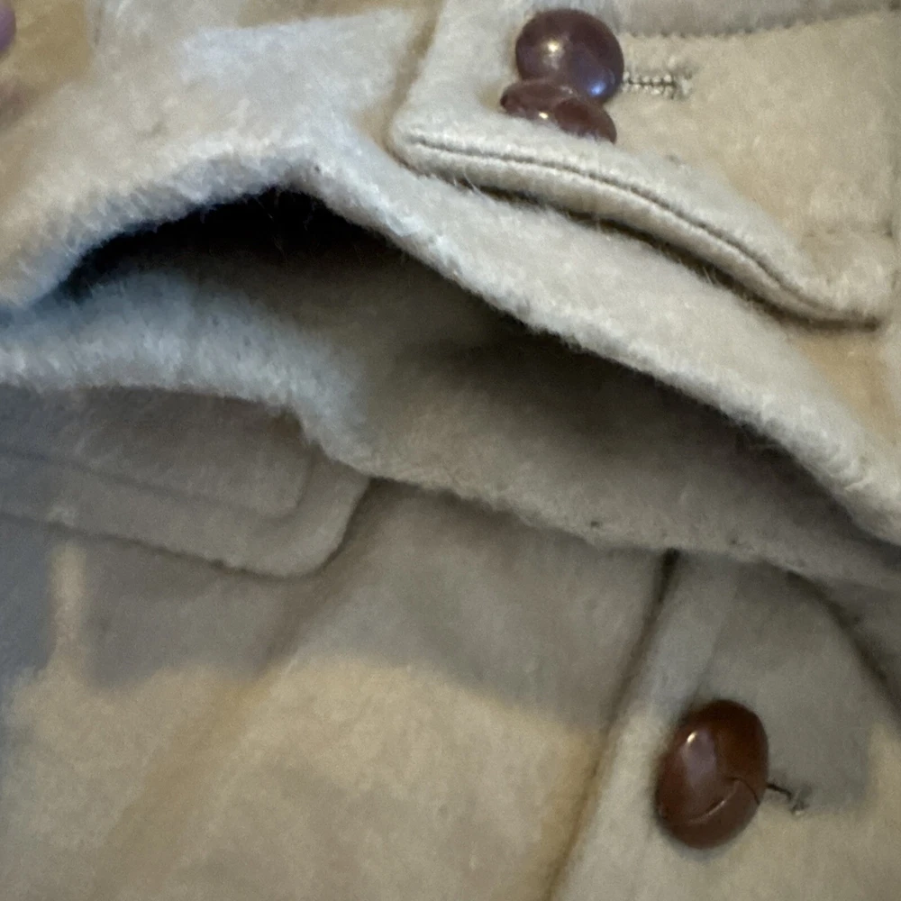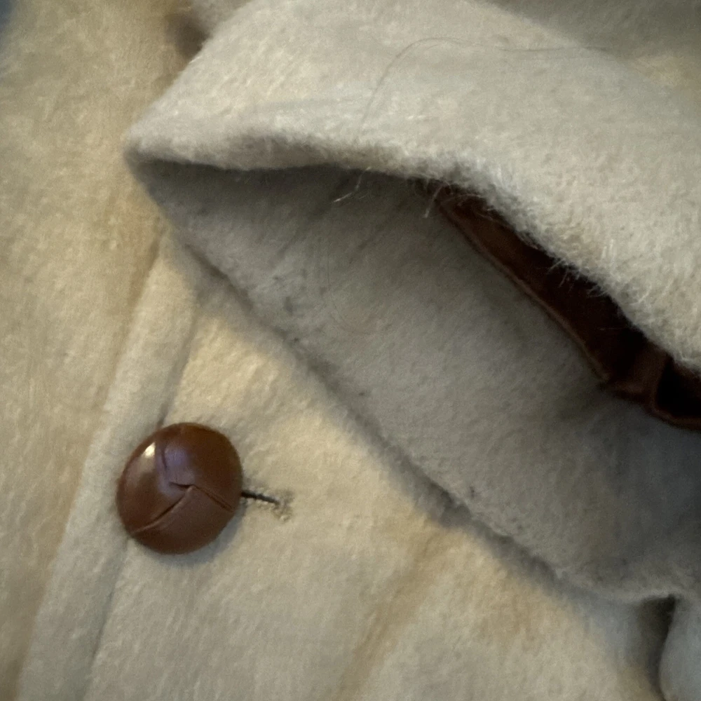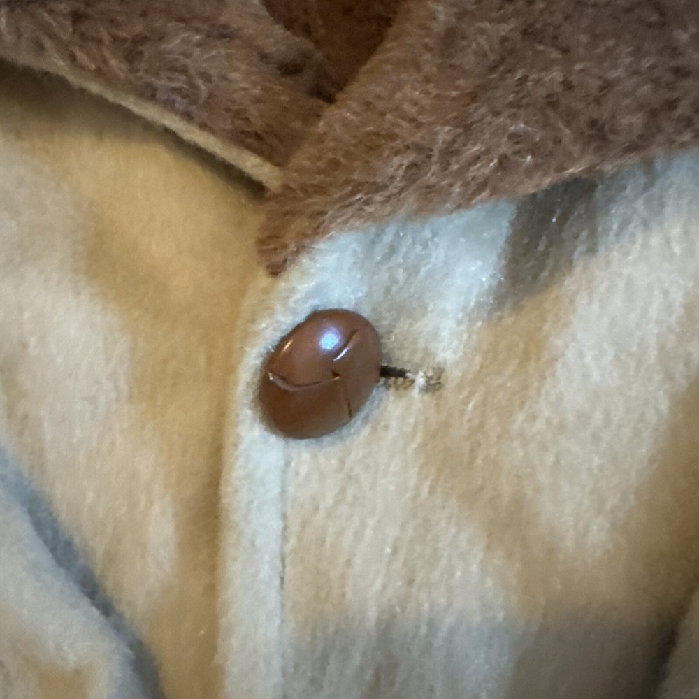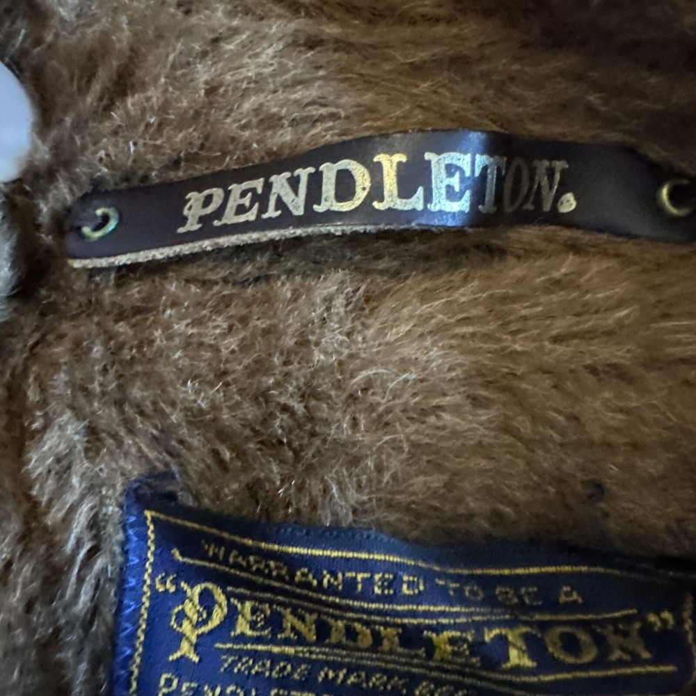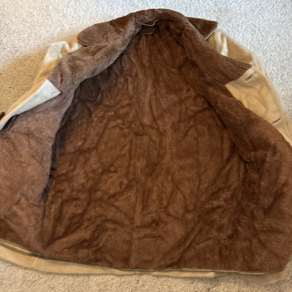 This vintage Sir Pendleton overcoat is the perfect addition to any wardrobe. Made of 100% virgin wool, this camel-colored coat features a button closure and is lined with sherpa for added warmth. The coat is wind-resistant and perfect for all seasons, making it a great choice for travel, parties, workwear, and more. It has multiple pockets for storage, and the knit fabric type adds a classic touch. The coat is available in size L and has a relaxed fit. The jacket/coat length is mid-length, and the lining material is also wool. This coat is a must-have for anyone looking for a warm, stylish, and versatile piece. Pit to pit -26” Pit to bottom hem-23” Pit to end of sleeve-17” Top of shoulder to end of sleeve-24-25” Great condition! Wrinkled due to storage! Sold as is!