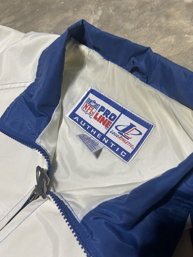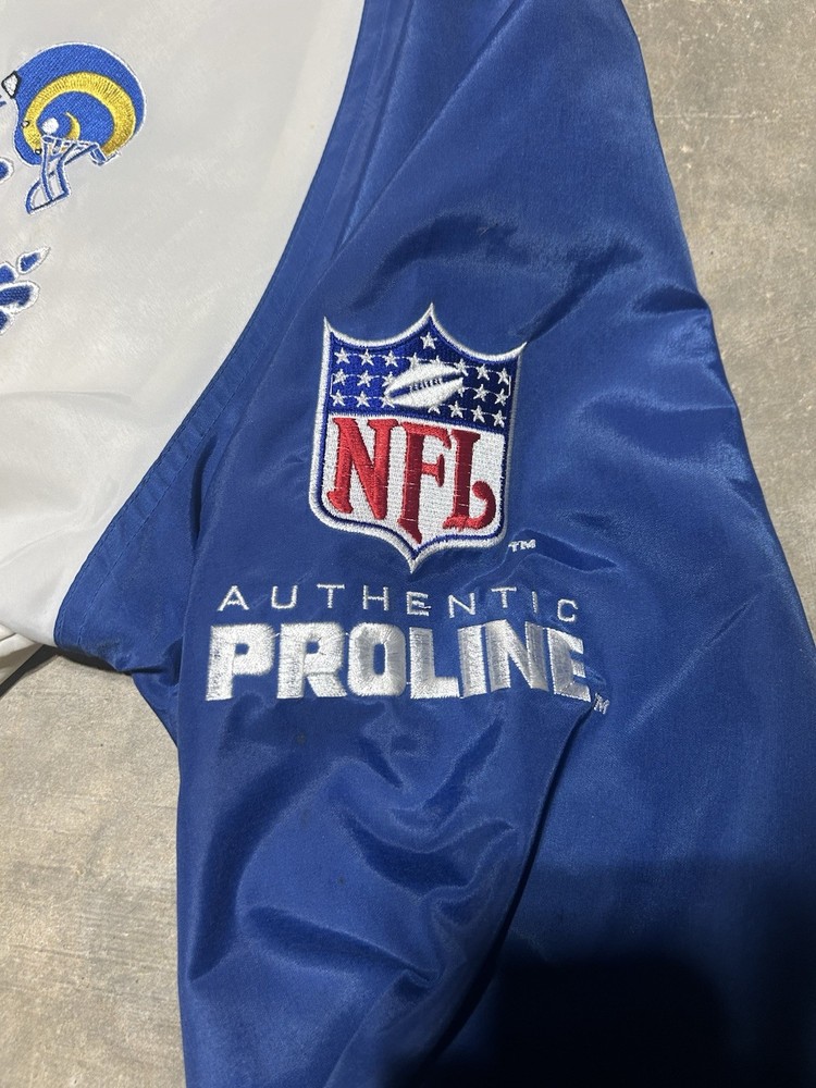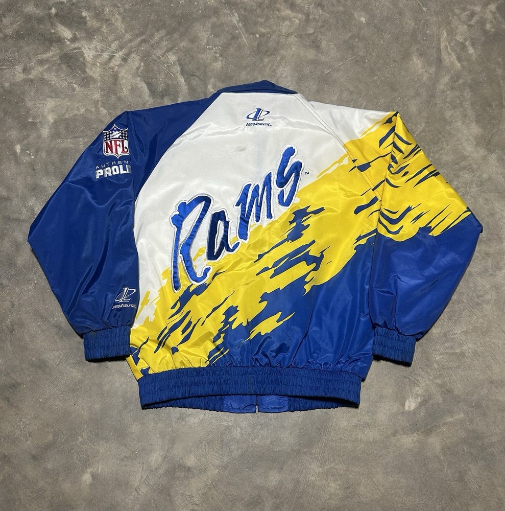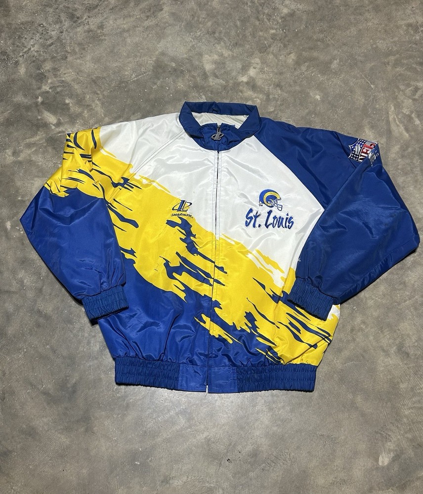 The VTG St. Louis Rams Splash Jacket in size L is a vintage windbreaker featuring the iconic team logo. Made of nylon with a polyester insulation, this lightweight jacket is perfect for casual occasions and outdoor activities, especially football games. The full zip closure and wind-resistant design make it practical and stylish for fans looking to show their support for the St. Louis Rams in a fashionable way. This Pro Line brand jacket is a must-have for any die-hard fan of the team.