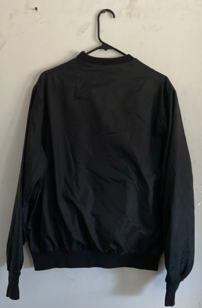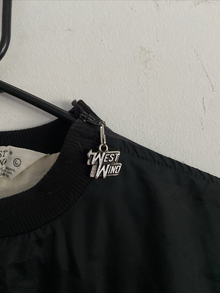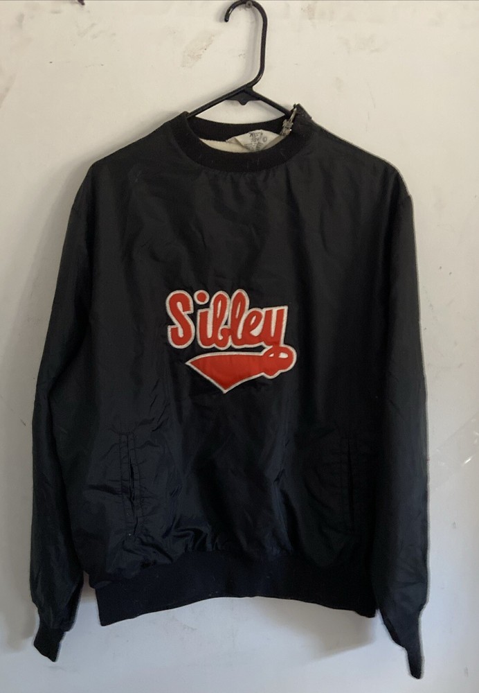 This vintage West Wind by Buccaneer windbreaker is the perfect addition to any casual outfit. Made with a black nylon outer shell and polyester lining, this mid-length jacket features a snap closure and classic fit. The jacket is adorned with the Sibley logo and is a size Large.
