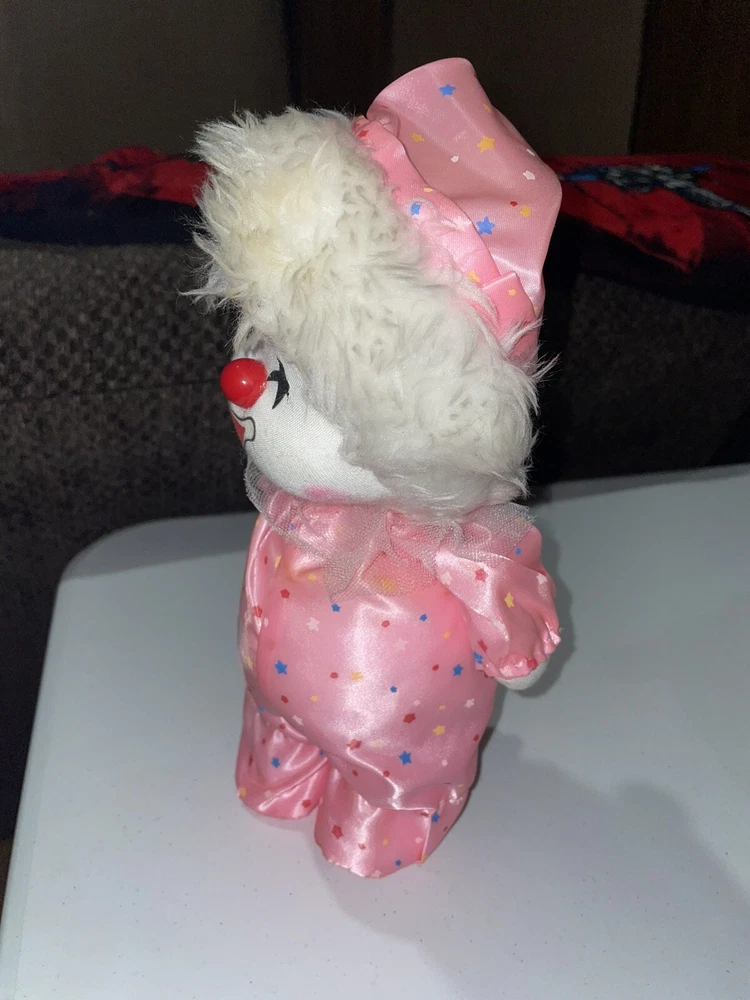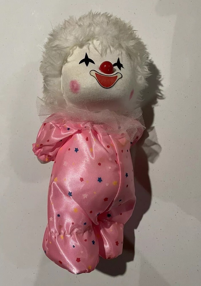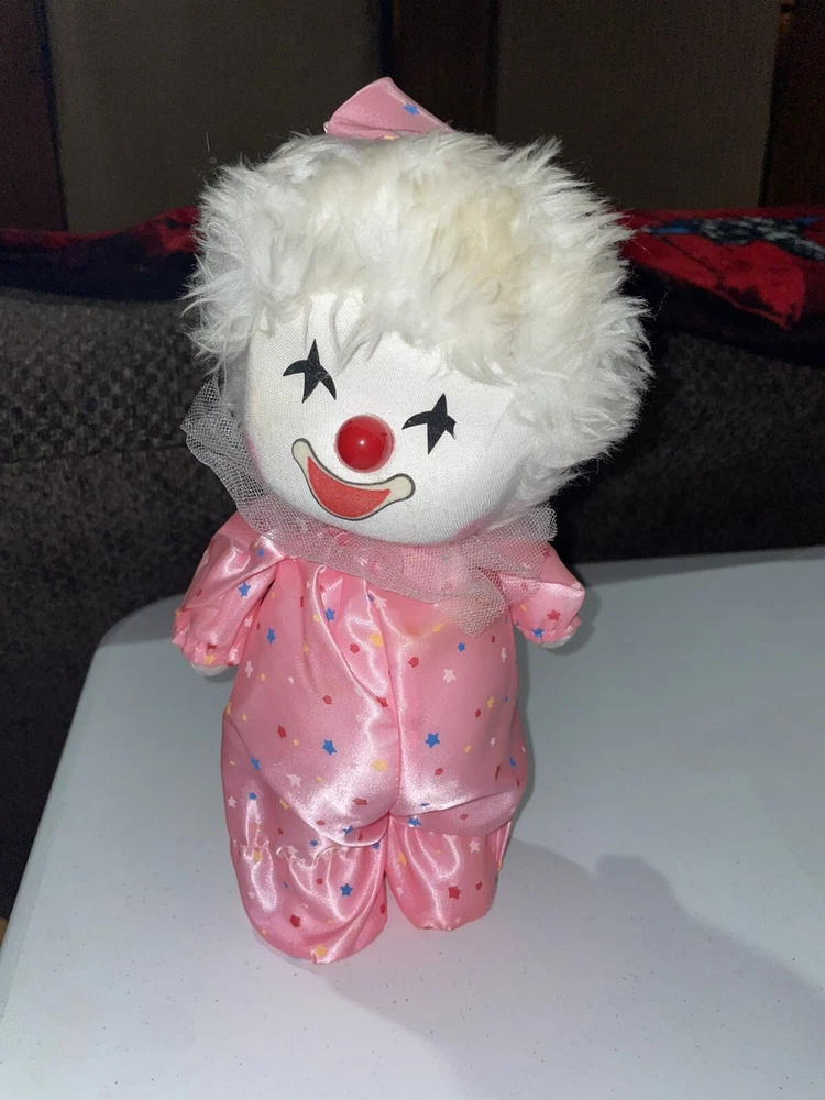 Vintage Standing Small musical windup Clown doll in pink sleeper jumper. The clown can stand on own, the music plays a short repetitive tune of “Hark the Herald Angels sing” The clown head Moves while standing, the clown will need to be supported while head moves or the clown will tip backwards This is for one item main photo is multiple views. ⭐️ Item is in Good used condition - has discolored spot on white hair, felt on left eye is cut (both pictured) - Refer to ALL pictures and video for condition of the exact item you will receive. Feel free to ask questions ⭐️ Buy with confidence and check my feedback ratings. Paypal or pay through eBay’s managed payment system only please. Shipping is always free. Please keep in mind, when making an offer, that shipping is pricey and I pay all shipping. International shipping through the global shipping program through eBay only. Please check out my other items for sale. Feedback is greatly appreciated and will be gladly reciprocated. Payment is expected within 48 hours. Many thanks from SH Emporium.