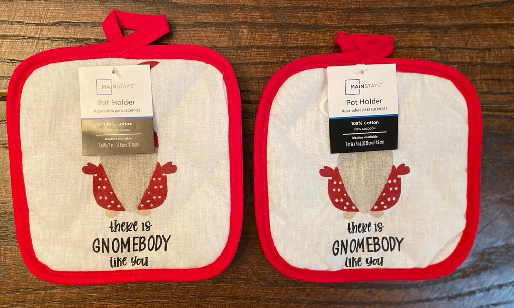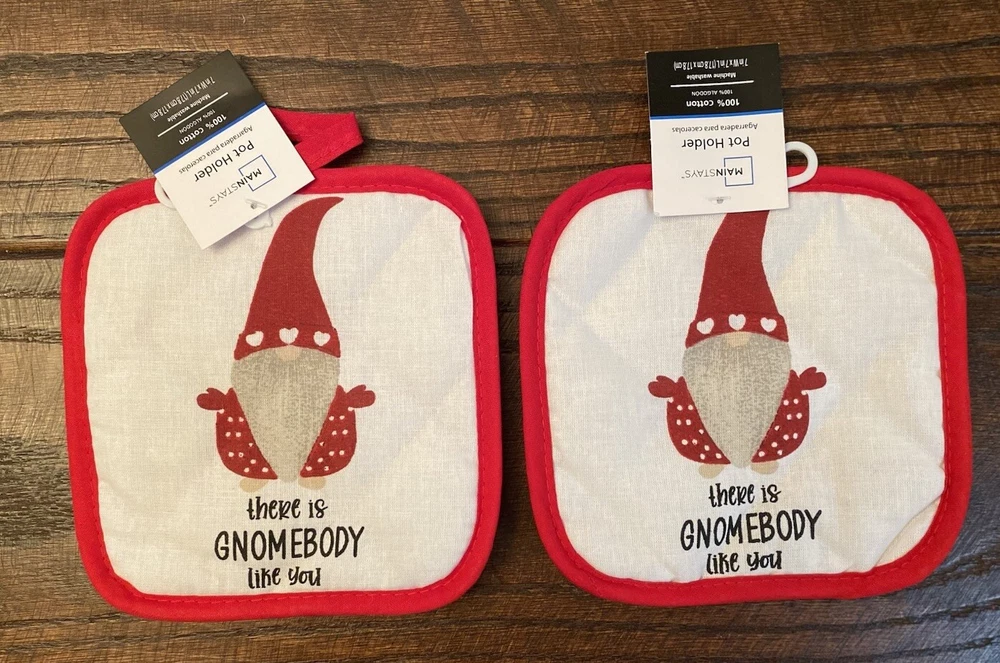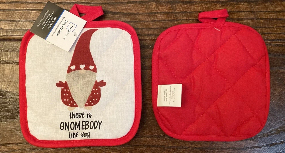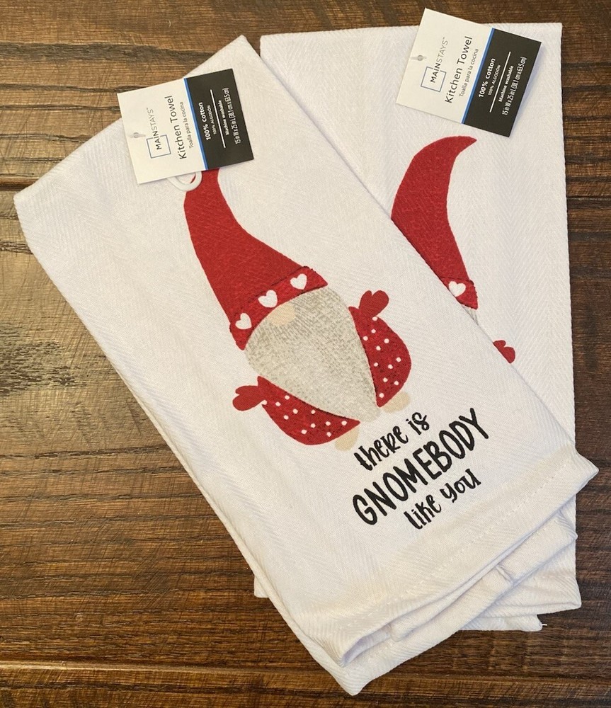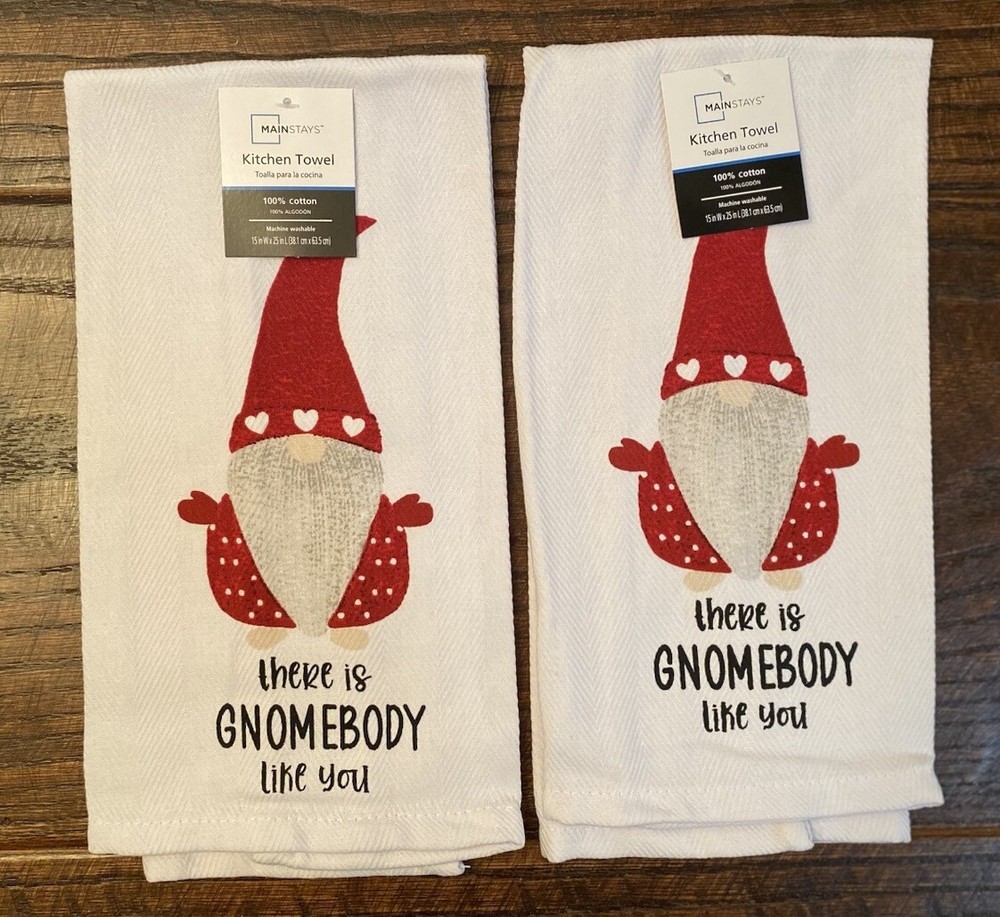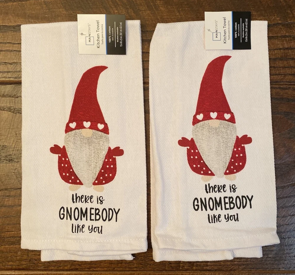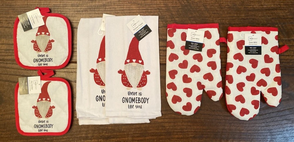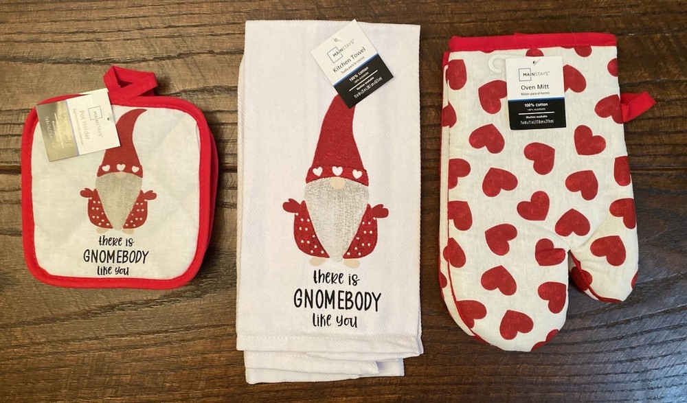 •New •Mainstays •Set of 6 •Valentine’s Day Gnome & Hearts Themed Bundle. “There Is Gnomebody Like You” •2 - Kitchen Towels 100% Cotton, 15” x 25” •2 - Pot Holders, 100% Cotton. 7” x 7”. Solid Red Back. Hooks For Hanging. •2 - Oven Mitts, 100% Cotton. 7” x 11”. Solid Red Back. Hooks For Hanging •Stored in a Smoke Free, Clean Home
