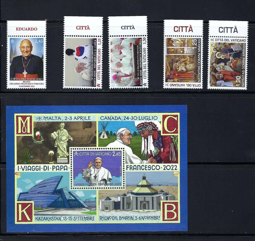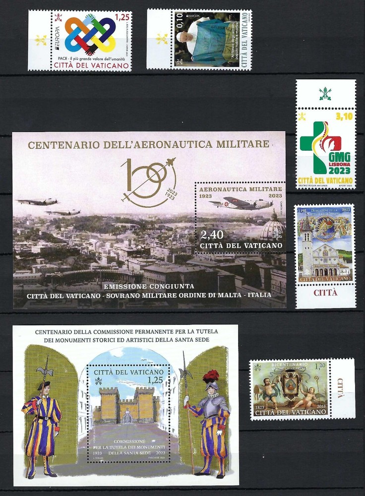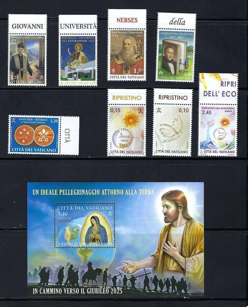This is a complete set of mint never hinged stamps issued by the Vatican City in 2023. The set does not include the booklet or the recalled version of the World Youth Day stamp, which can be purchased separately. The year set contains w/ Scott #: 1814 In Memory of Pope Emeritus Benedict XVI 1815 Easter of Resurrection MMXXIII 1816-19 Pontificate of Pope Francis - Year MMXXIII 1820 550th Anniversary of the birth of Nicolaus Copernicus s/s 1821 An ideal pilgrimage Jubilee 2025: Africa s/s 1822 Centenary of the Italian Air Force s/s 1823 The Cathedral of Santa Maria Assunta of Spoleto 1824 Bicentenary of the Lateran Union 1825-6 Europe 2023: “ Peace, the highest value of humanity” 1827 Historical and Artistic Monuments s/s 1829 XXXVII World Youth Day– Lisbon Revision 1830 150th Anniversary of the birth of St. Giovanni Calabria 1831 250th Anniv of the Pontifical Lateran University 1832 850th Anniversary of the death of San Nerses Shnorhali 1833 50th Anniv of Relations Between Vatican and Australia 1834-6 Decade on Ecosystem Restoration - 2nd year 150th Anniversary of the death of Alessandro Manzoni Beatification of Cardinal Eduardo Francisco Pironio Diplomatic Relations Between the Holy See and Korea Apostolic journeys of Pope Francis in the year 2022 s/s An ideal pilgrimage Jubilee 2025: America s/s Christmas MMXXIII Please contact me with any questions. Thanks for looking.