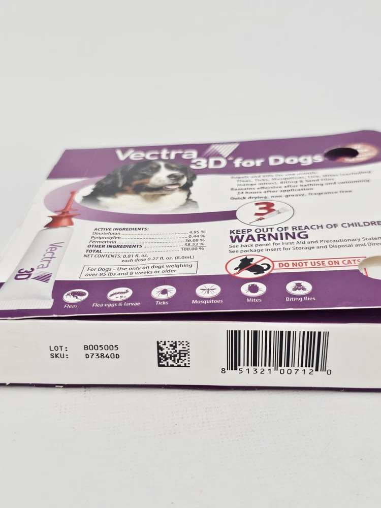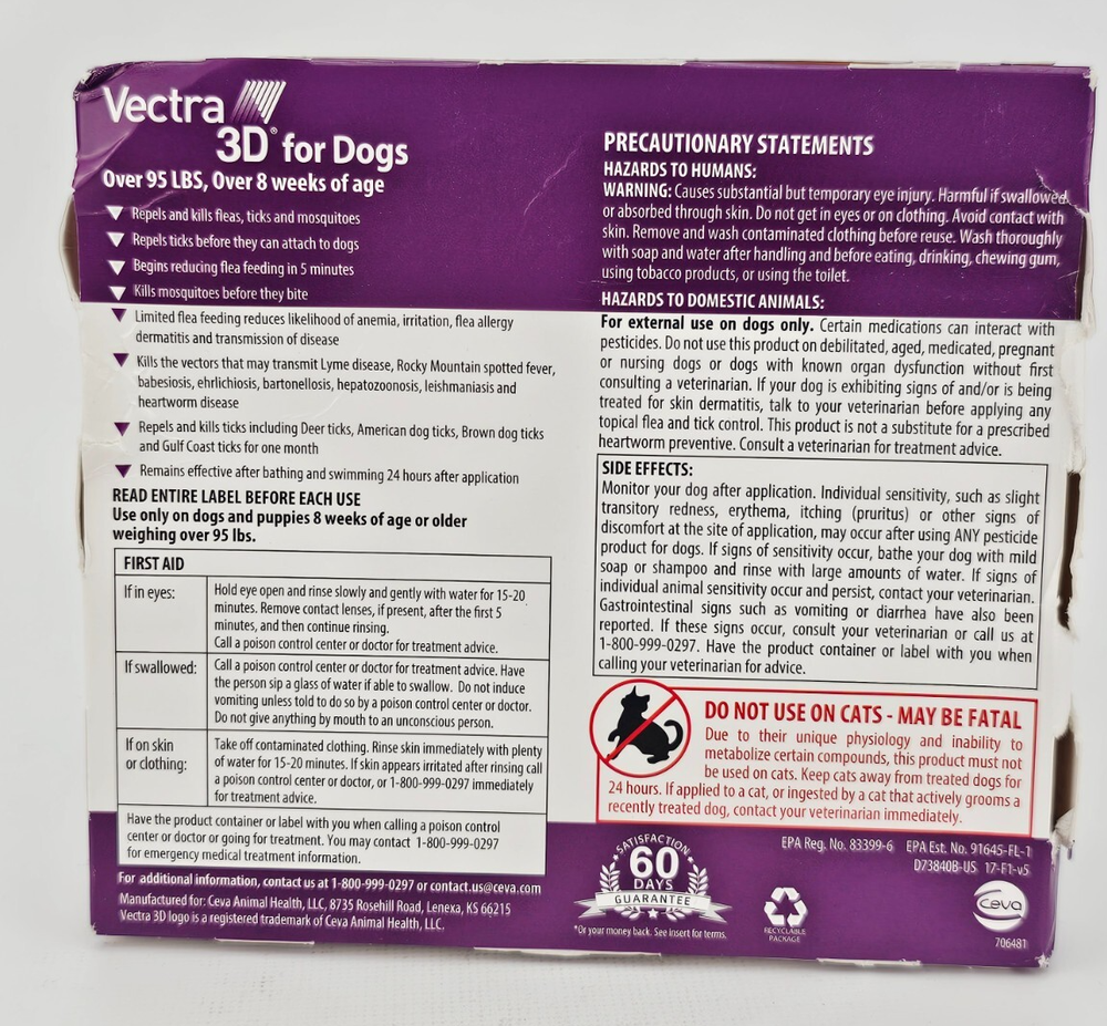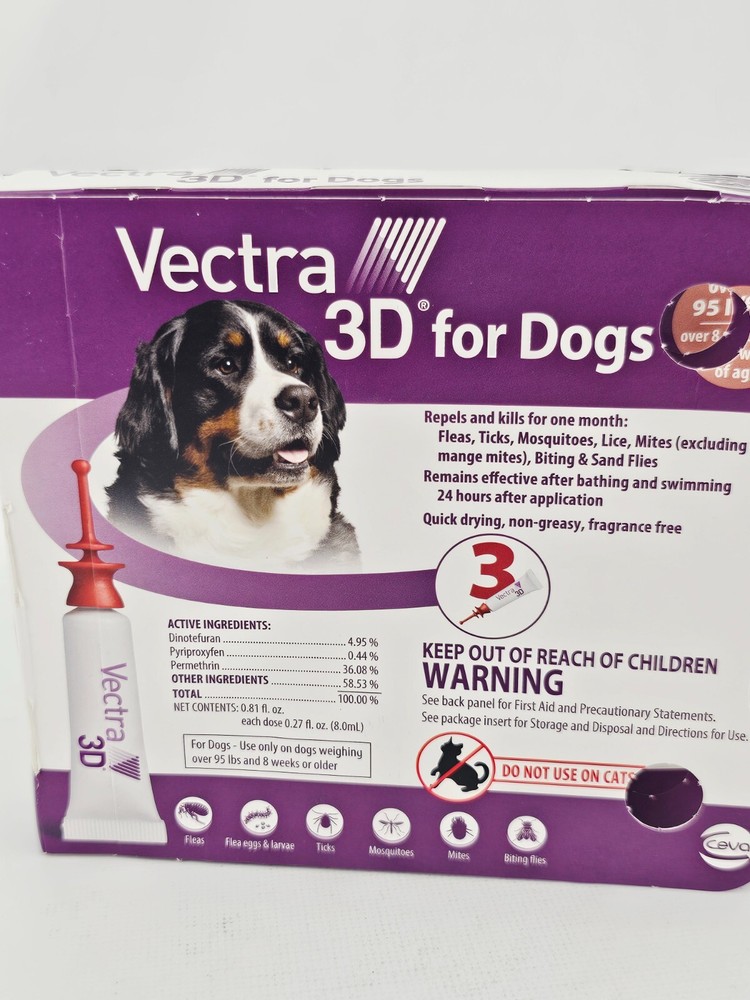 EPA REGISTRATION NUMBER : 11556-143 Vectra 3D Dogs Over 95Lbs Flea Tick Treatment Prevention 3 Monthly Doses You will receive exactly the item in the picture above if you have any questions feel free to ask. I ship Monday through Friday and please check out my other listings for more great deals I am happy to combine shipping!