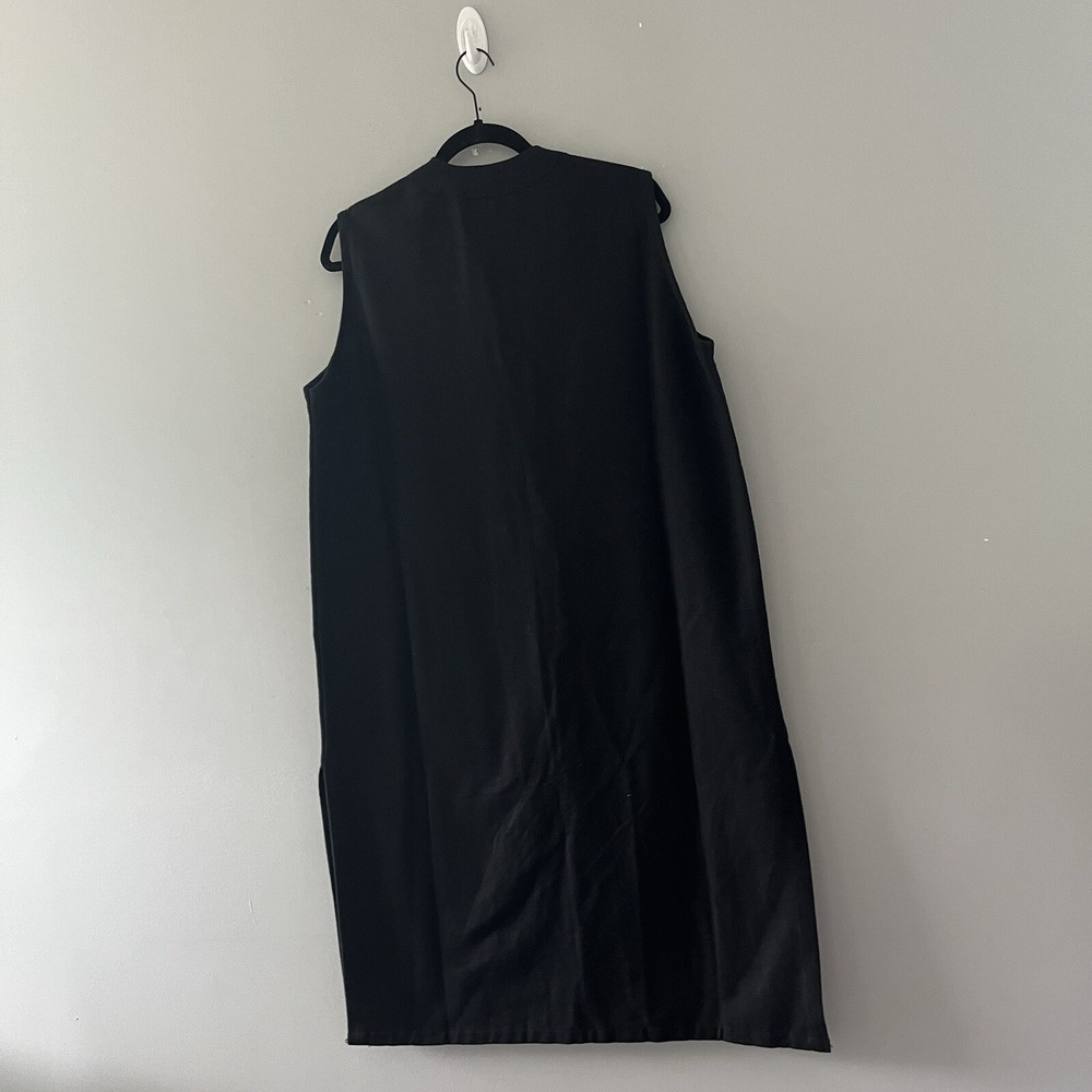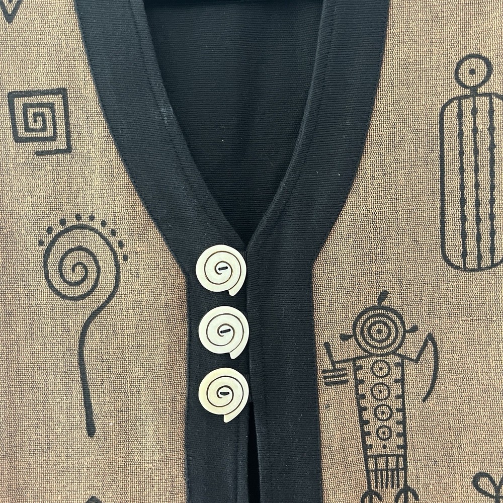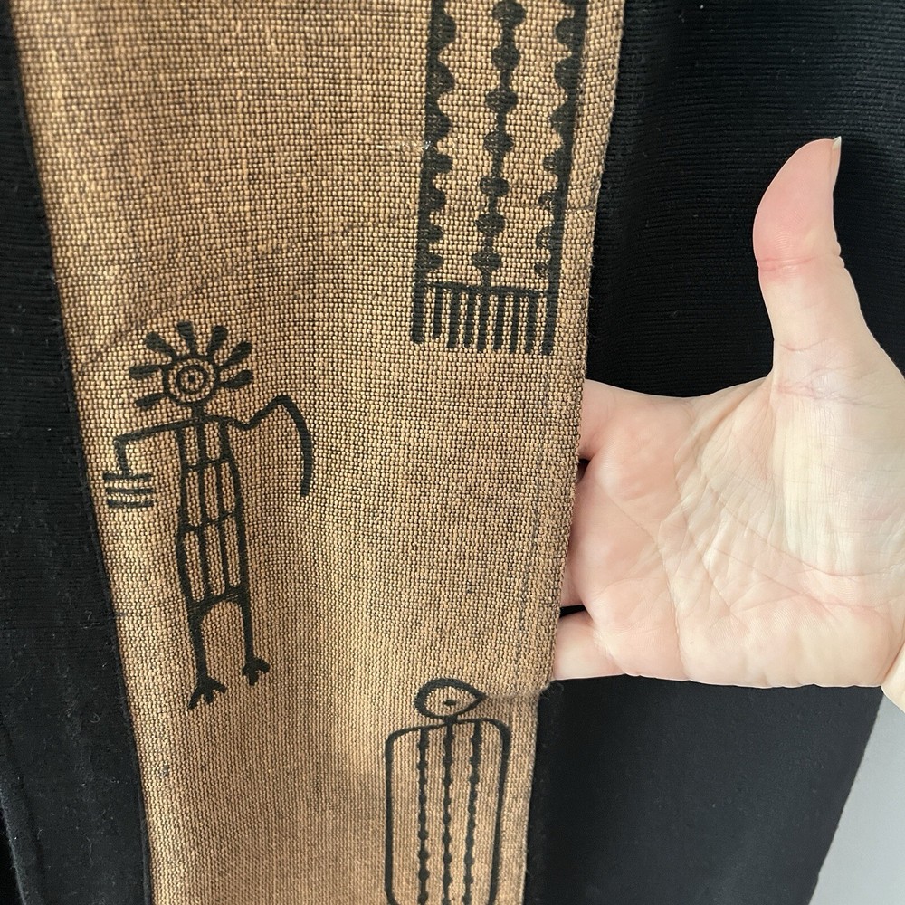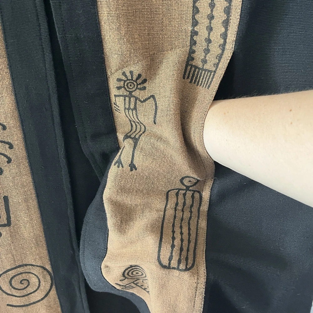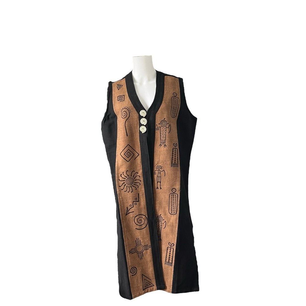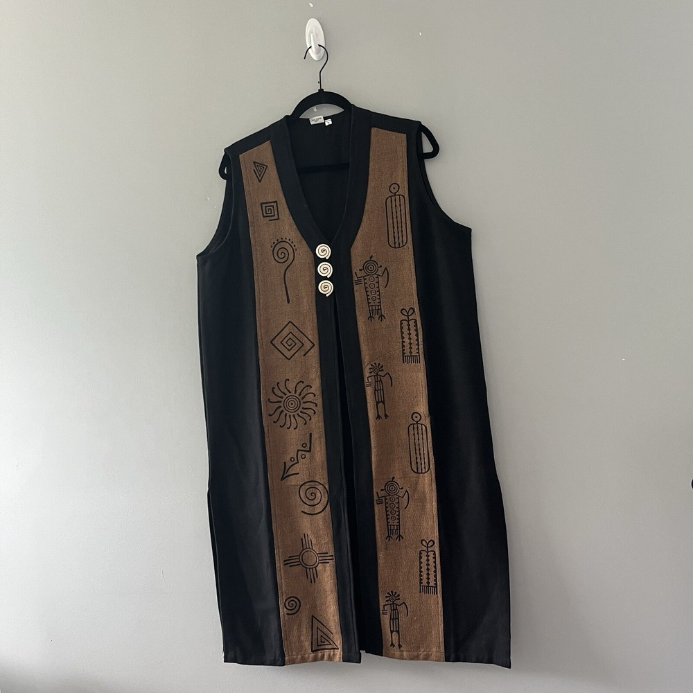 Venus Imports Long Duster Vest Art to Wear Tribal Cotton Size Large Sleeveless Three button closure Long, duster length Black with brown panels on the front with graphic design 100% cotton Size large 23 inches pit to pit 43.5 inches shoulder to hem Measurements are approximate Preowned, no noted flaws Photos taken by me of the actual item Offers welcome