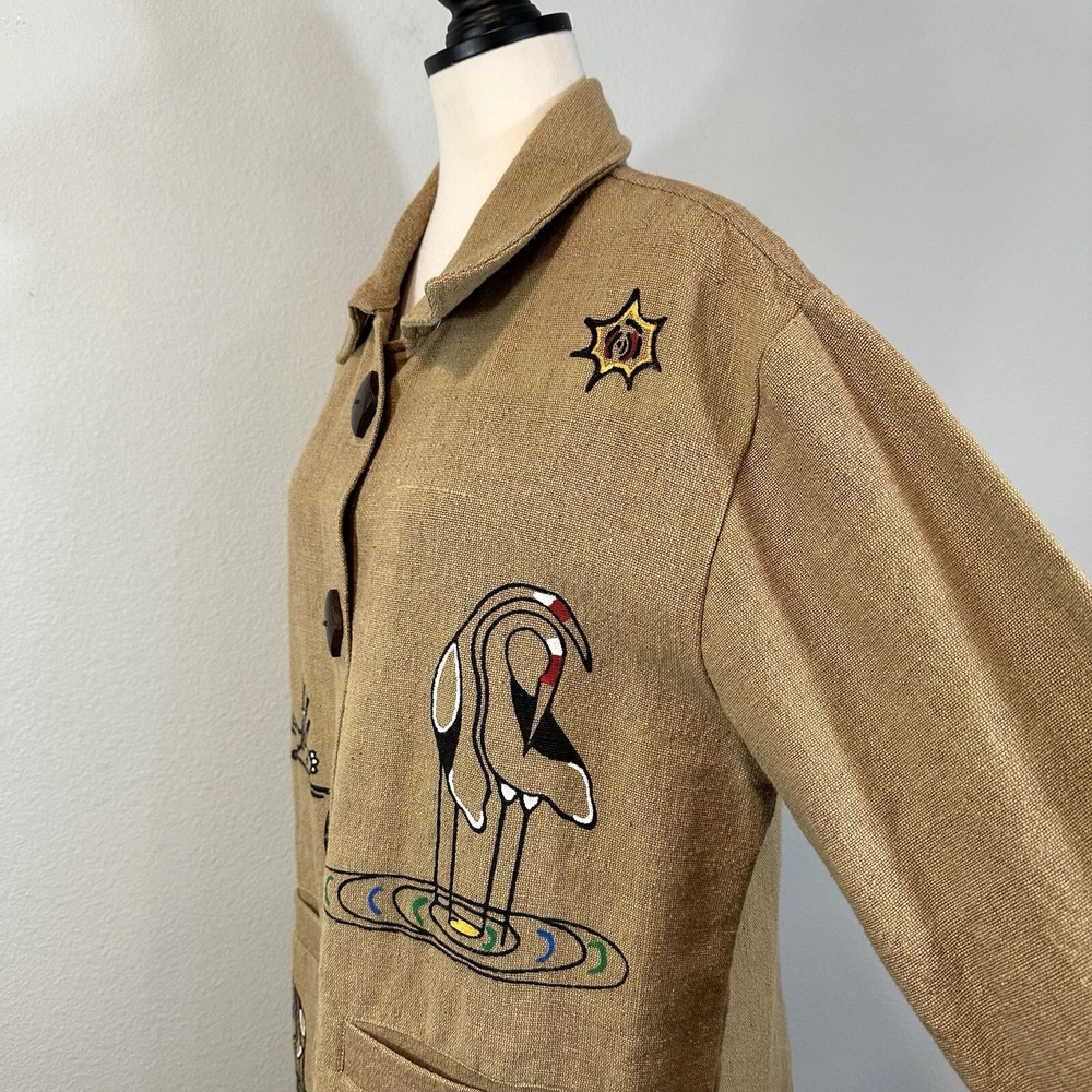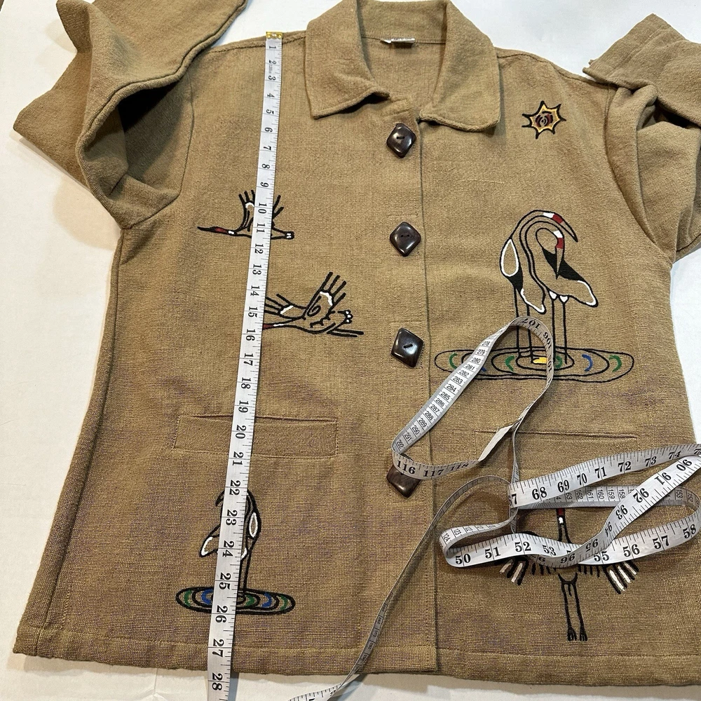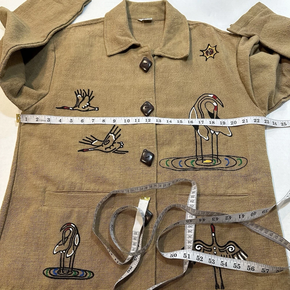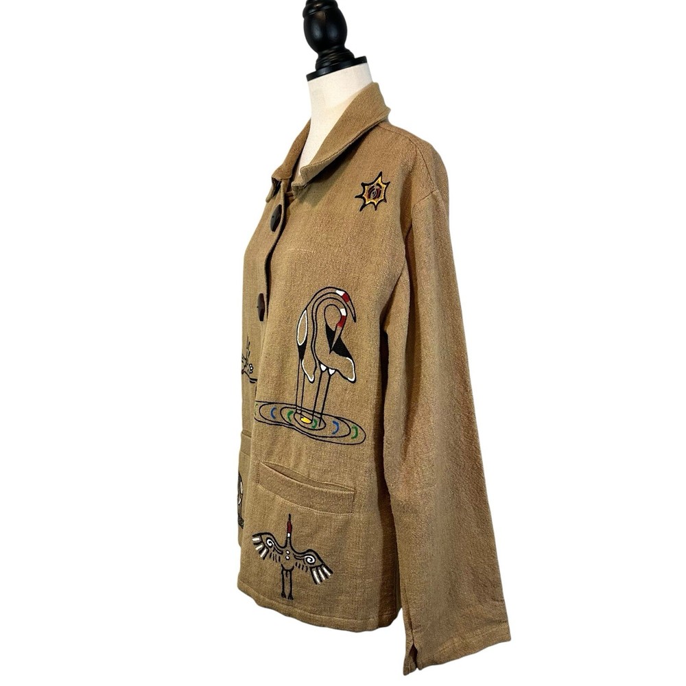 This handcrafted shirt jacket is a stunning piece of wearable art! The vibrant crane painting adds a unique, bohemian charm, and the 100% cotton fabric feels soft and breathable. The XL size fits comfortably, and the pre-owned condition is flawless—no flaws at all. Perfect for adding a pop of culture and style to any outfit. A must-have for lovers of handmade fashion!