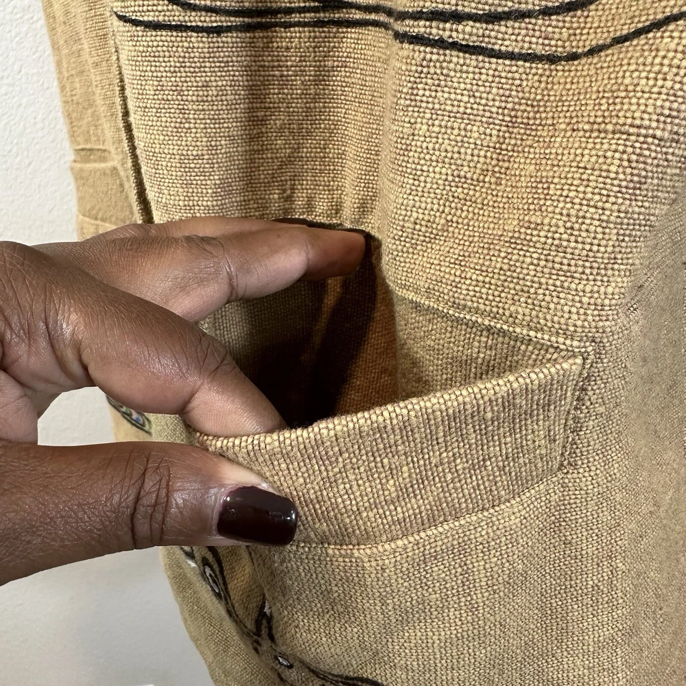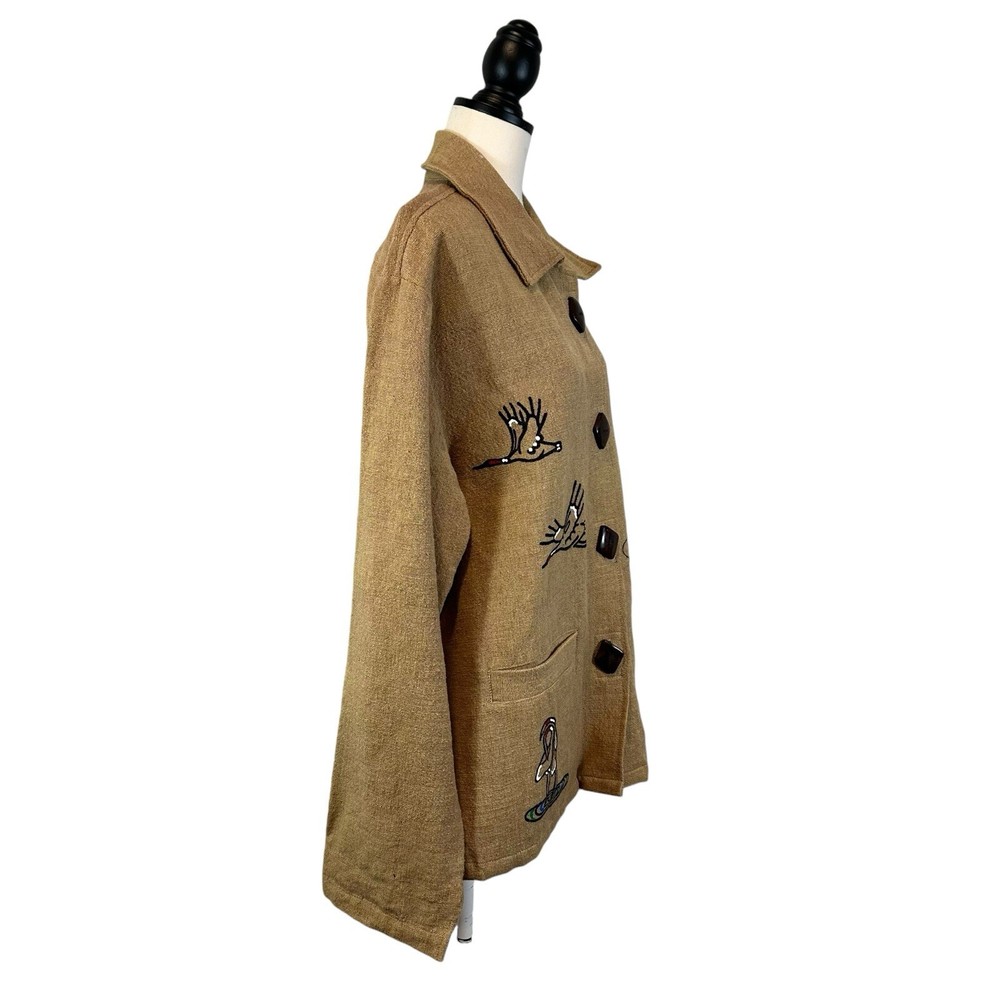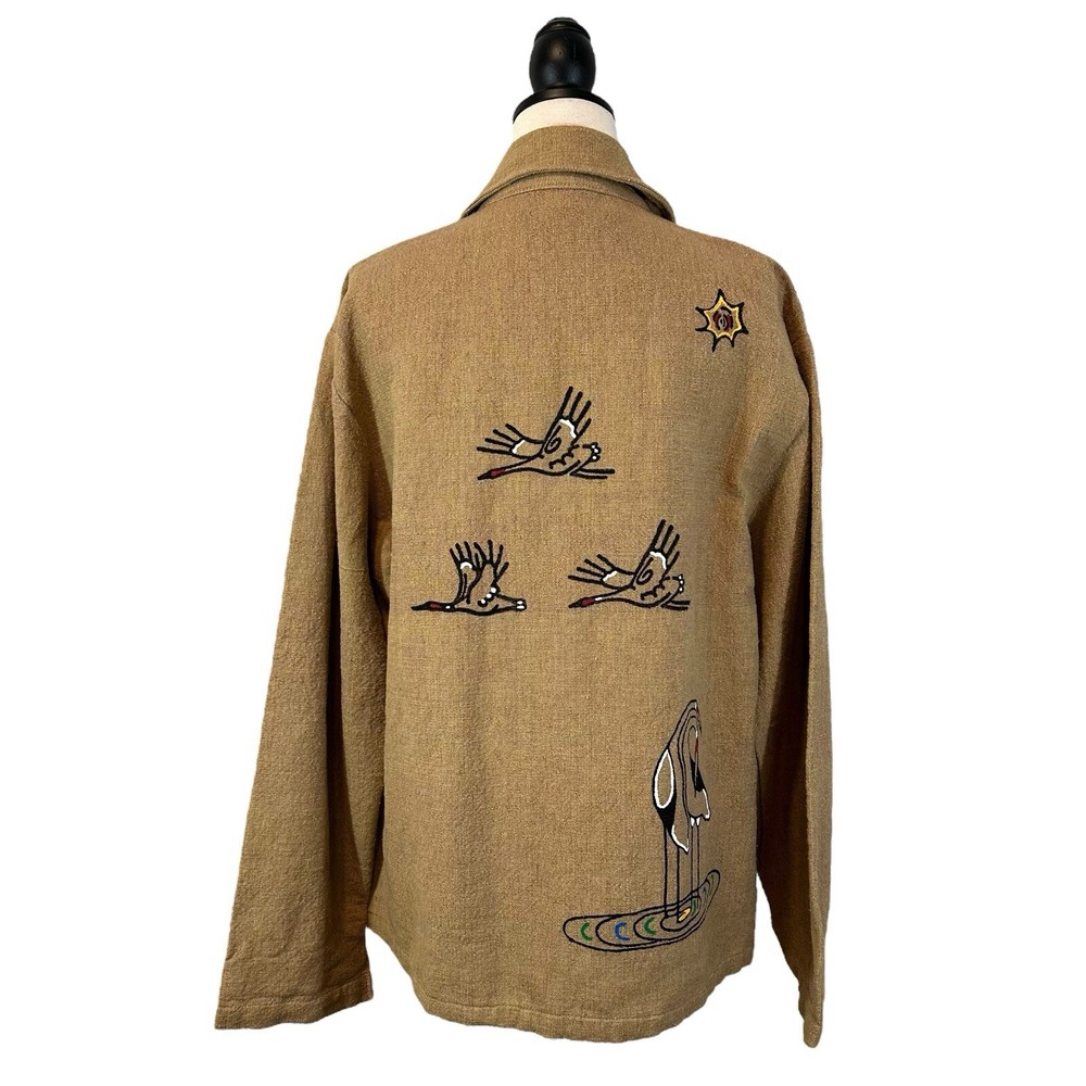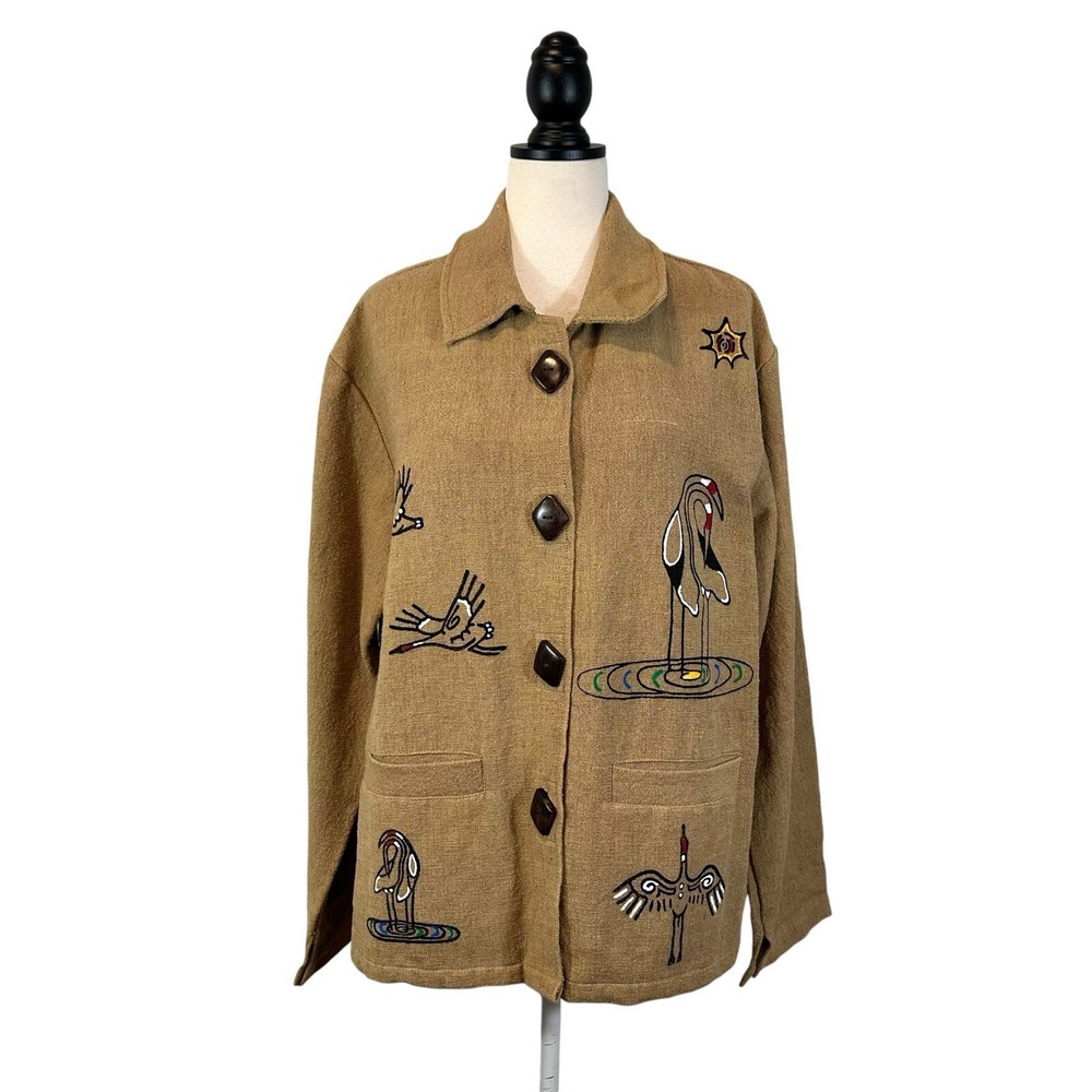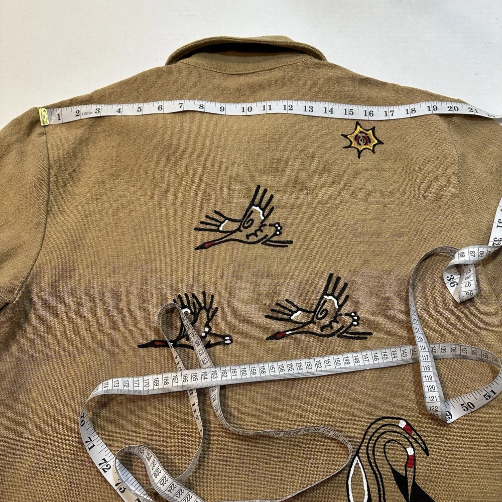 This handcrafted shirt jacket is a stunning piece of wearable art! The vibrant crane painting adds a unique, bohemian charm, and the 100% cotton fabric feels soft and breathable. The XL size fits comfortably, and the pre-owned condition is flawless—no flaws at all. Perfect for adding a pop of culture and style to any outfit. A must-have for lovers of handmade fashion!