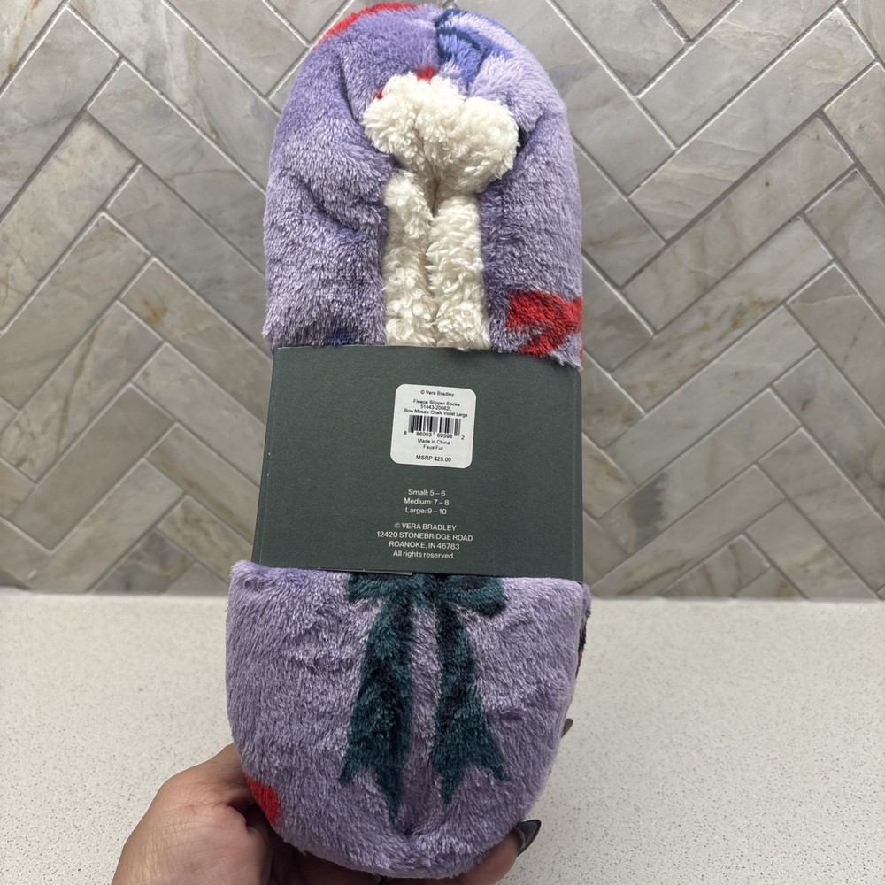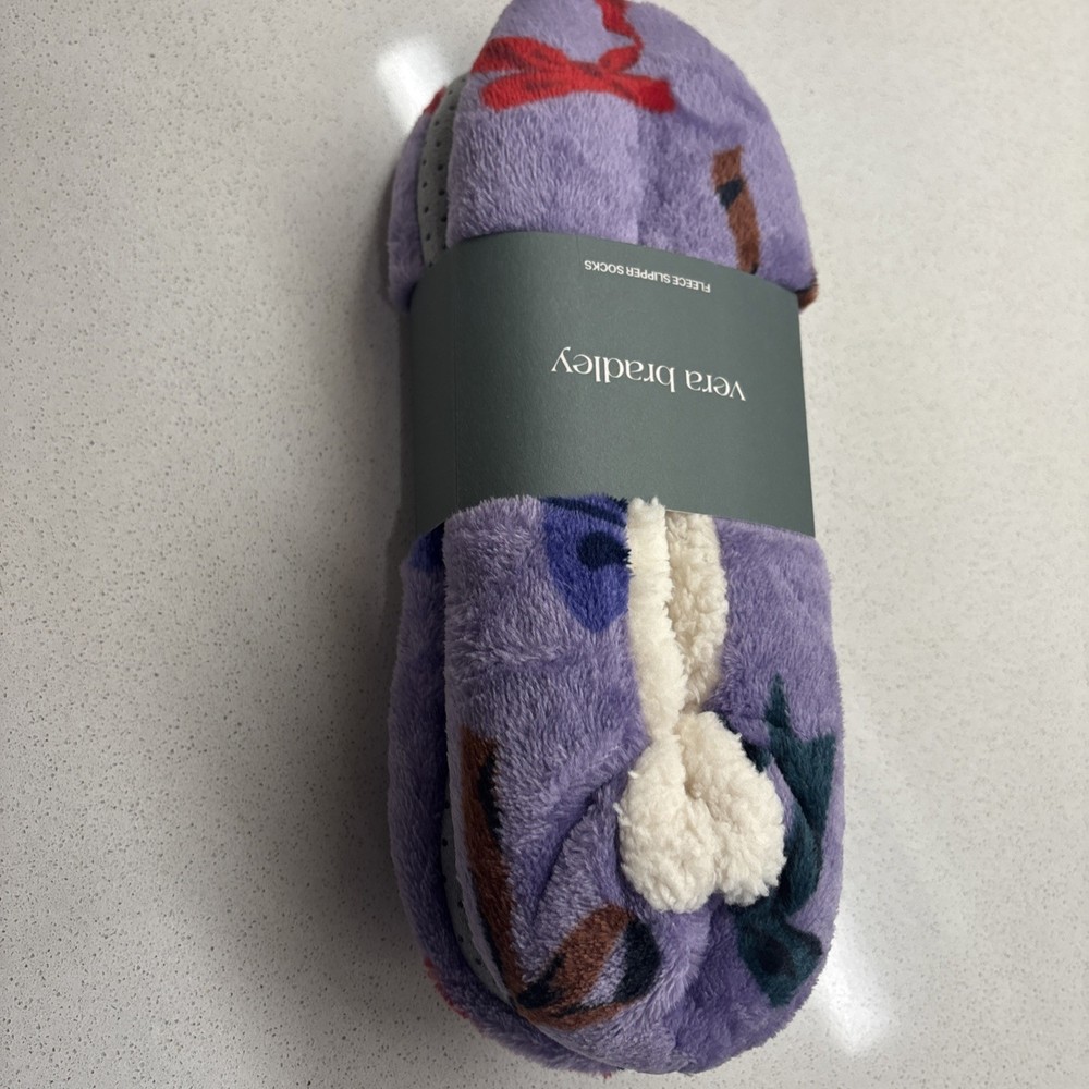 Cozy up your feet with the Vera Bradley Purple Fleece Slipper Socks, designed with both comfort and style in mind. Ideal for women who appreciate a touch of warmth and flair in their everyday wear, these fuzzy socks come in a vibrant purple hue complemented by a charming floral pattern. Crafted from soft fleece material, these slipper socks provide a comfortable fit in a size medium/large and are perfect for lounging around the house or running quick errands. The non-slip design ensures stability, while the cozy fleece keeps your feet snug during colder days. Enjoy the perfect blend of functionality and fashion with these stylish and comfortable Vera Bradley socks.