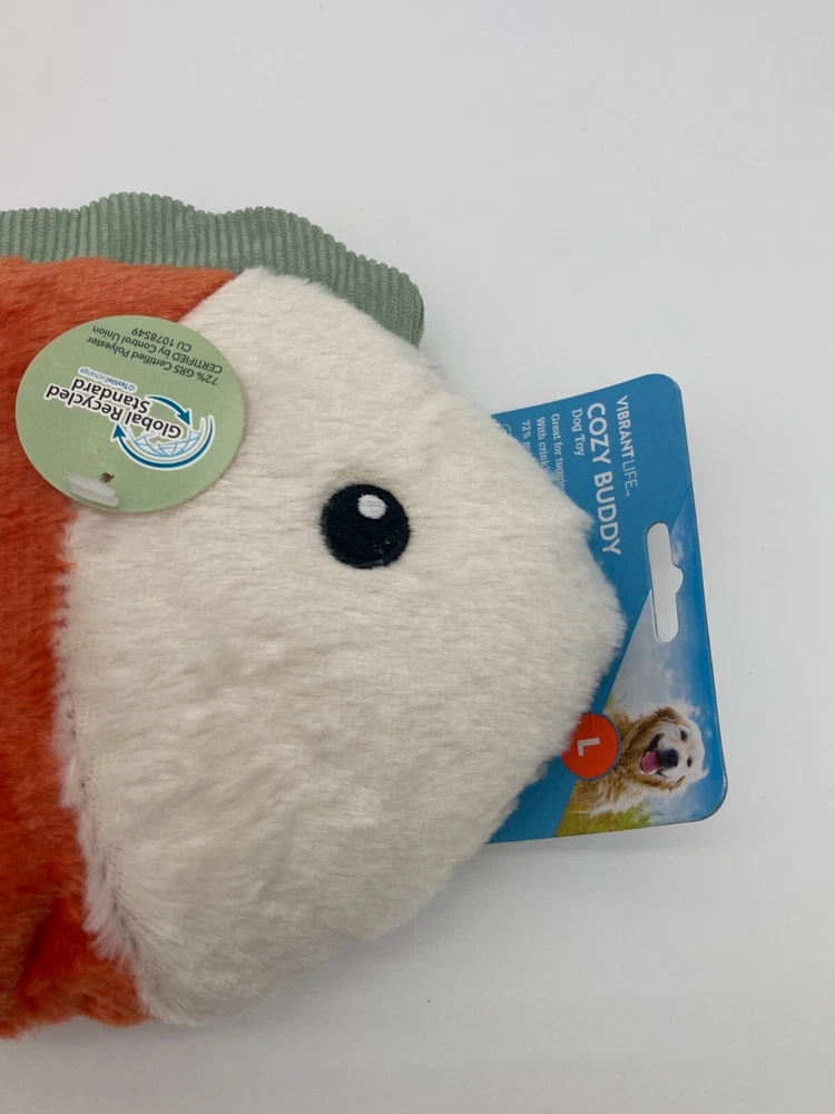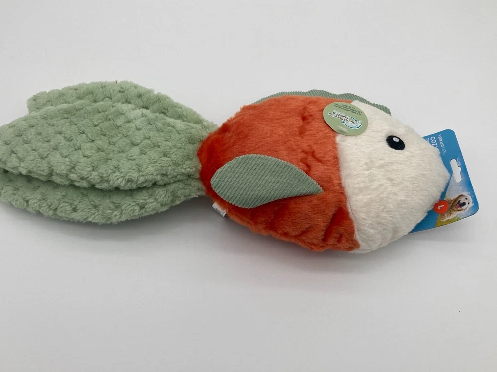 Vibrant Life Cozy Buddy Gold Fish Dog Toy - SQUEAK CRINKLE - 15" LARGE Description SAFE & ENTERTAINING LARGE DOG TOY: This sensory pleasing toy was made with recycled plastic bottles (72%) and is Global Recycled Standard certified. SQUEAKER: To your Large pup, the only thing better than getting a new toy is getting one that has a silly sounding squeaker inside! CRINKLE PAPER PLAY: Stitched and stuffed with dog-friendly fabrics and materials to encourage a more energized, safe play for your furry friend! CHEW LEVEL: 2 (light-moderate) – great for tug, grab and play with your four-legged companion. A moderate chew level also makes this toy a soft buddy for your pet to cuddle with when playtime is over. SIZE: 2.4″D x 8.5″W x 15″H Last 4 pictures are from one of the item you will receive. Please see all close up pictures for exact condition this item. SHIPPING We always make every effort to ensure that your package is delivered as soon as possible. Please understand that some factors (the weather, heavy mail traffic, and shipping companies) are out of our control. We offer free shipping to the lower 48 states and ship within 1business days of payment, usually sooner. We do not accept P.O. Boxes. Please enter a physical address. We do not ship outside the US RETURNS Sorry we does not accept returns for this item. CONDITION New. Last 4 pictures are from one of the item you will receive. Please see all close up pictures for exact condition this item. CUSTOMER SATISFACTION We try our very best to make sure every customer is completely satisfied. PLEASE BE SURE TO READ ALL DETAILS, VIEW ALL PICTURES AND BE FAMILIAR WITH THE PRODUCT. If there's a problem, message us! We are open to questions and suggestions. We're happy to help. Thank you for stopping by.