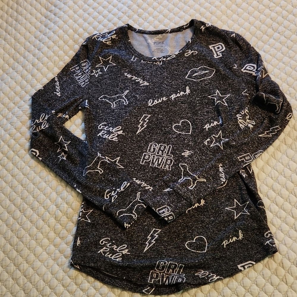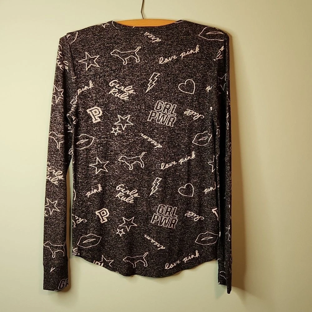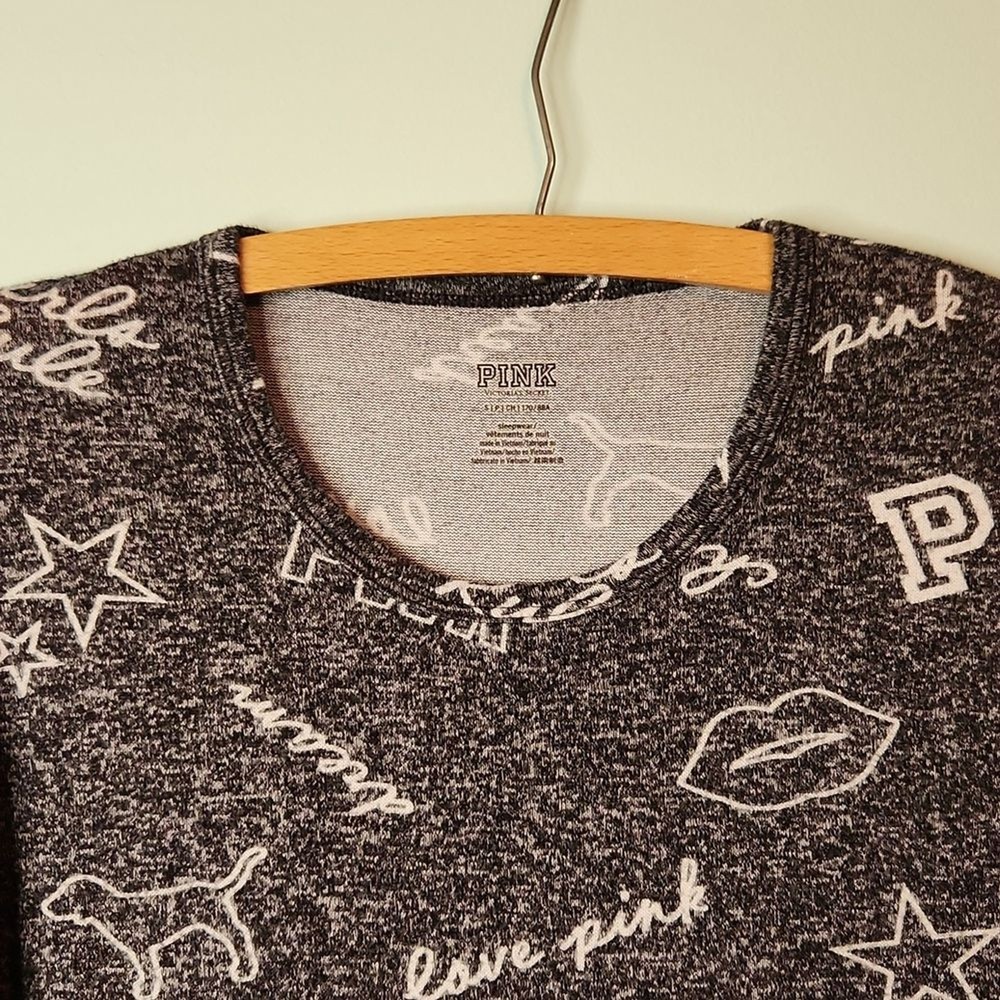 Victoria's Secret Pink Women’s Size: Small S Color: Black speckled with white and white graphics Soft and comfortable long sleeve sleep shirt with mod fem graphics - GRL PWR chill Girls Rule love pink kissy lips, stars, hearts, dog Material: 75% viscose, 25% polyester Approximate measurements, unstretched: Bust (pit to pit) 16", Sleeve (shoulder to cuff) 25", Length 23 1/2" Very Good preowned condition. Minor wear. Item may have folds, wrinkles, or creases from storage.