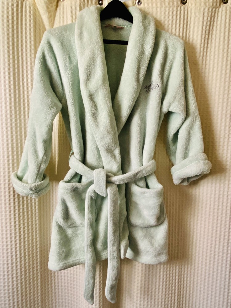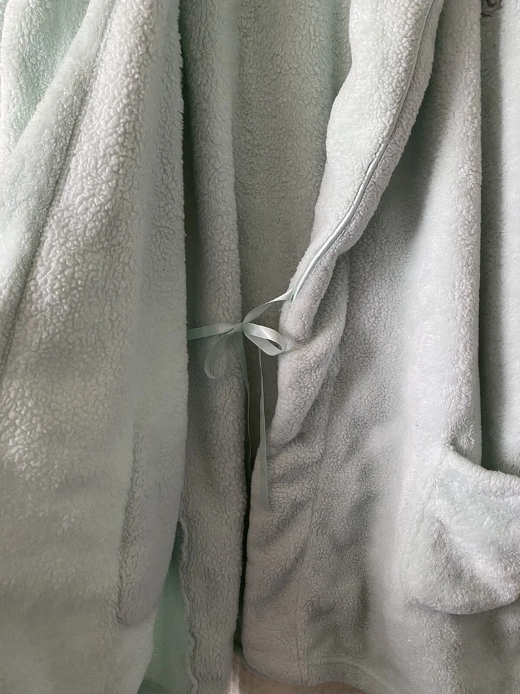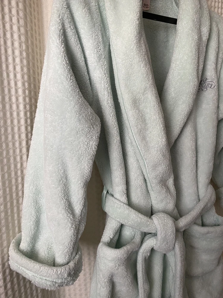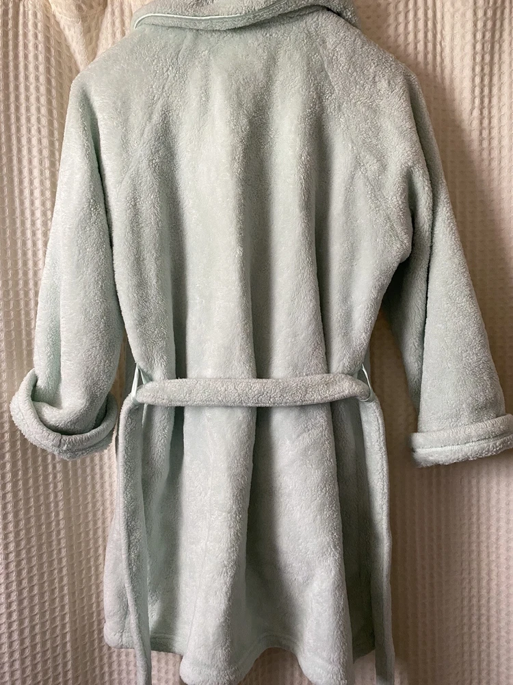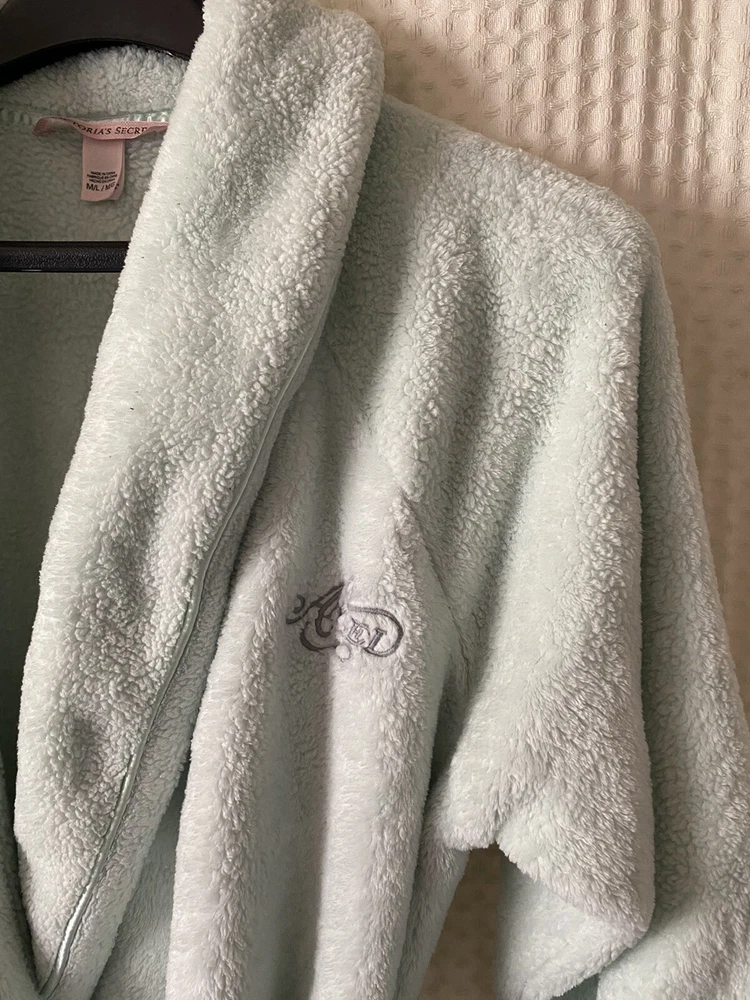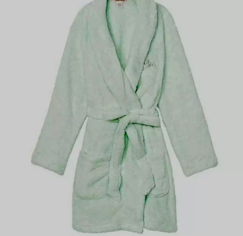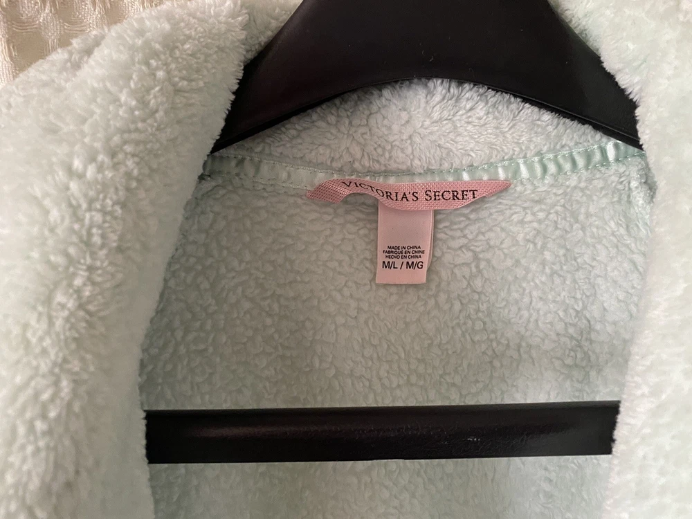 Victoria's Secret (Angel) Soft & Cozy Robe w/ Pockets Mint Green Size M/L. Victoria Secret Jade Mint Green Fleece Cozy Short Plush Robe M/L Embroidery at chest Front pockets Tie waist Two Side Pockets 36" from shoulder; hits at thigh Size M/L Color Misty Jade Mint Green Very thick fleece Colors on first phots from ad show more accurate colors.