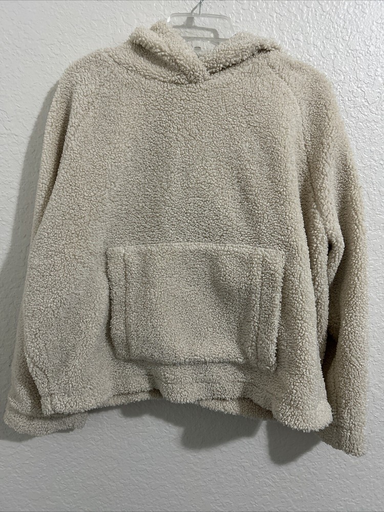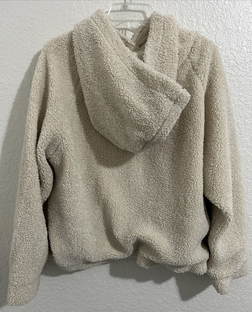 This Vince Women's Cozy Faux Sherpa Hoodie in size L features a solid ivory color with long sleeves and a pullover closure. Made of 100% polyester fleece, it is designed for activewear. The hoodie is lined, hooded, and has pockets for added functionality. With a stylish pullover design, this cozy hoodie from Vince is perfect for casual and comfortable wear.