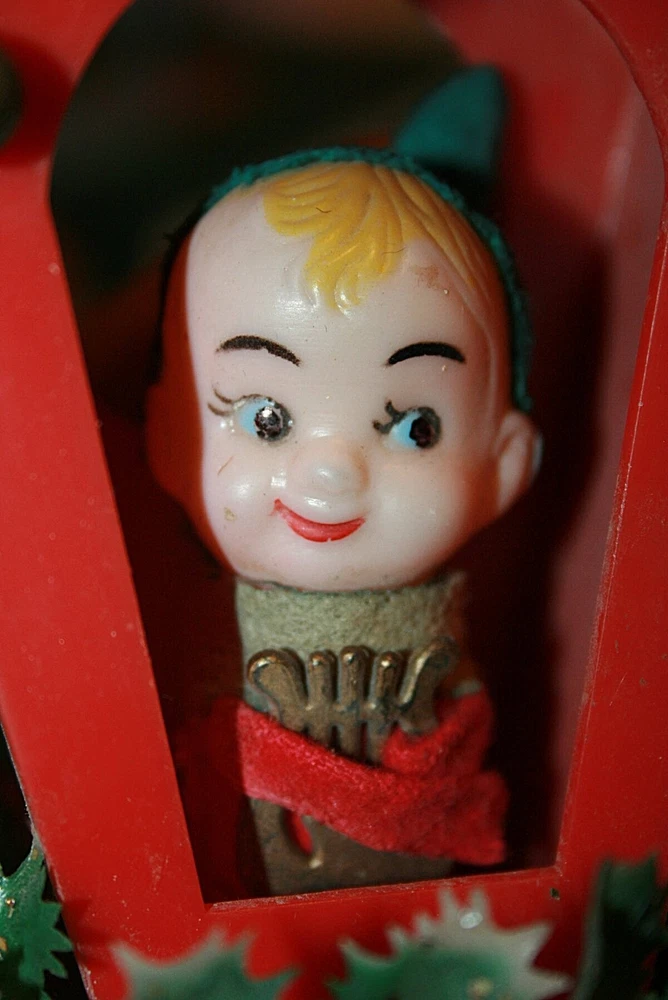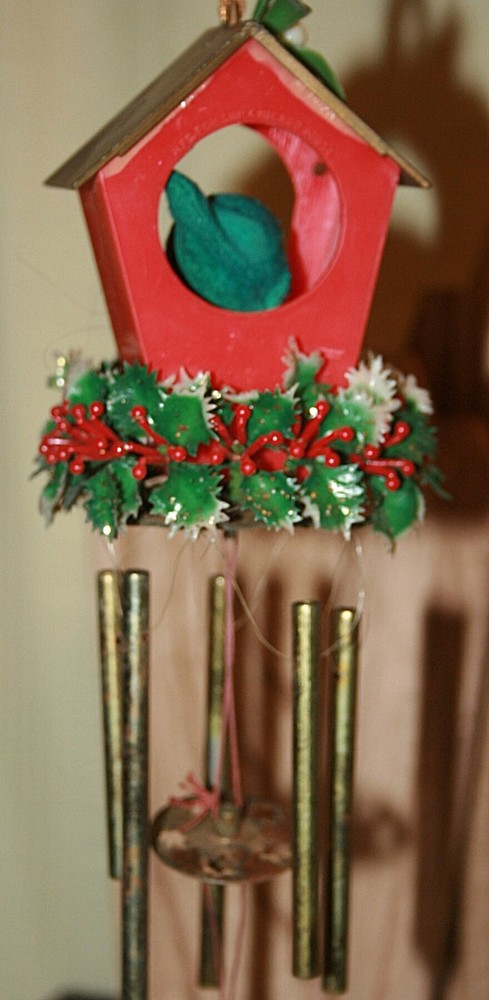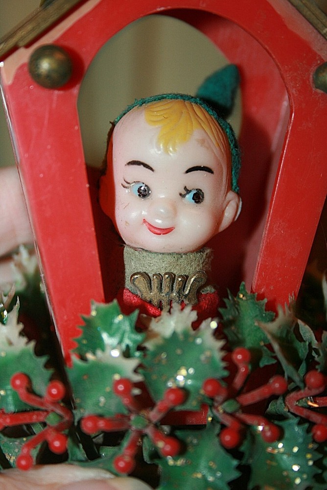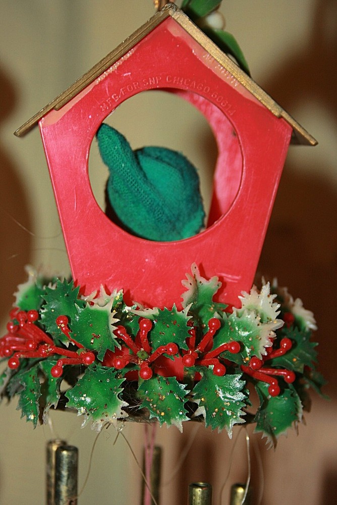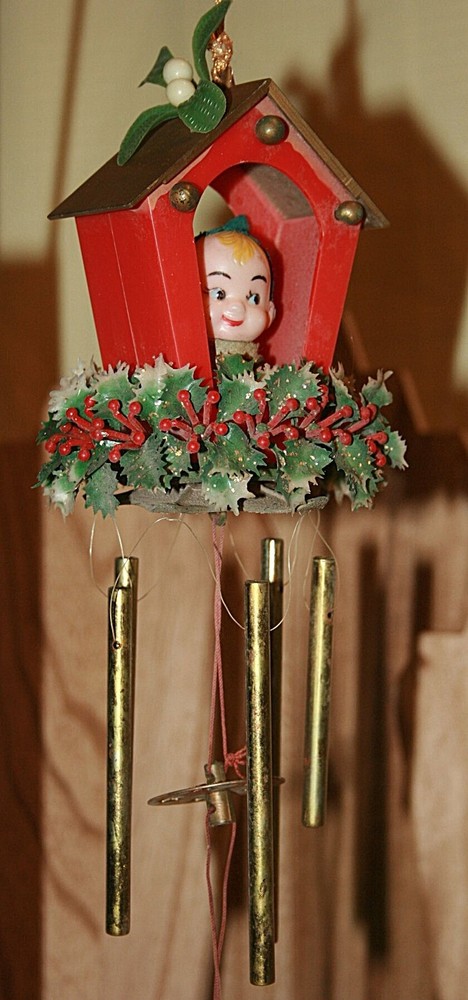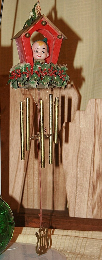 Vintage 14" Christmas Wind Chime with Celluloid ELF Hong Kong This charming windchime is about 14" long from the top of the house to the harp at the bottom. The house is plastic and is trimmed with red and white plastic berries and gold tipped greenery. The inside of the house has a celluloid elf with a green felt hat and a gold plastic harp. The bars are metal with a round metal insert. A long gold metallic string is attached at the top to hang it inside or out. The chime sound is very lovely. It was Made in Hong Kong from the 60s. Please see my other Christmas decor listed here. See my other listings for more great items! txzj pxzj4405 txzj-11 txzj44 txzj115