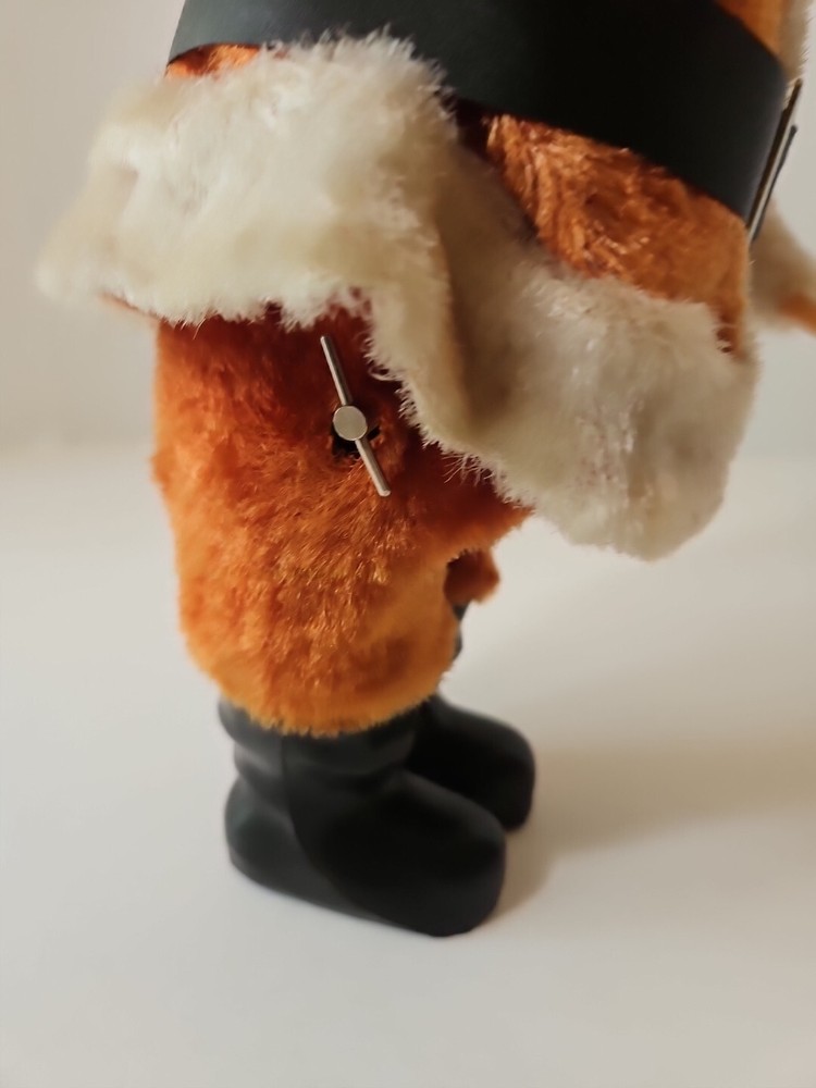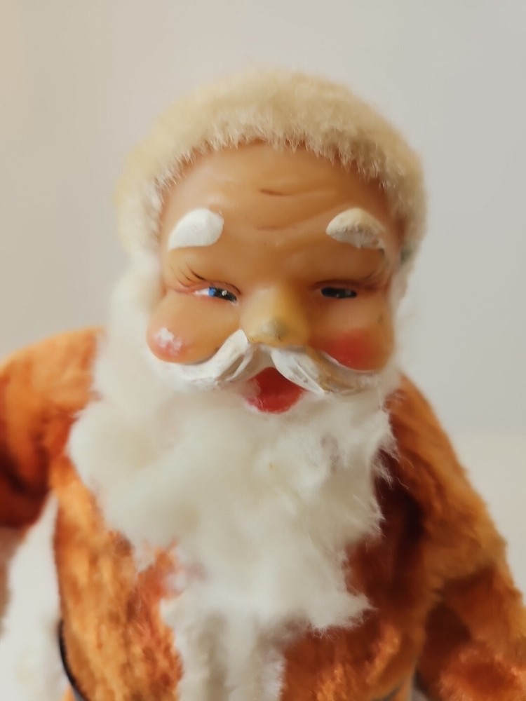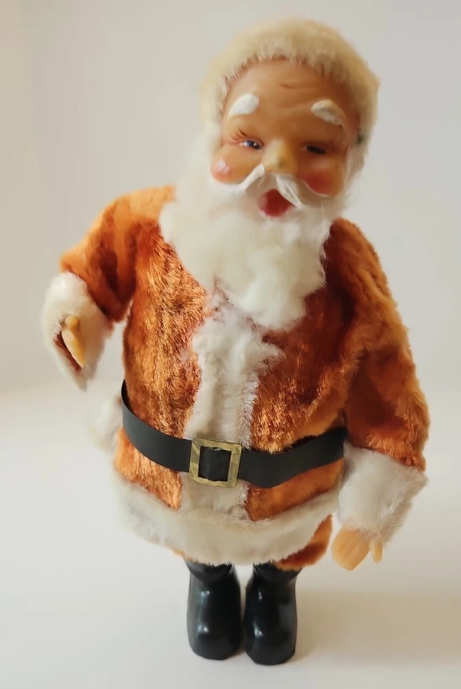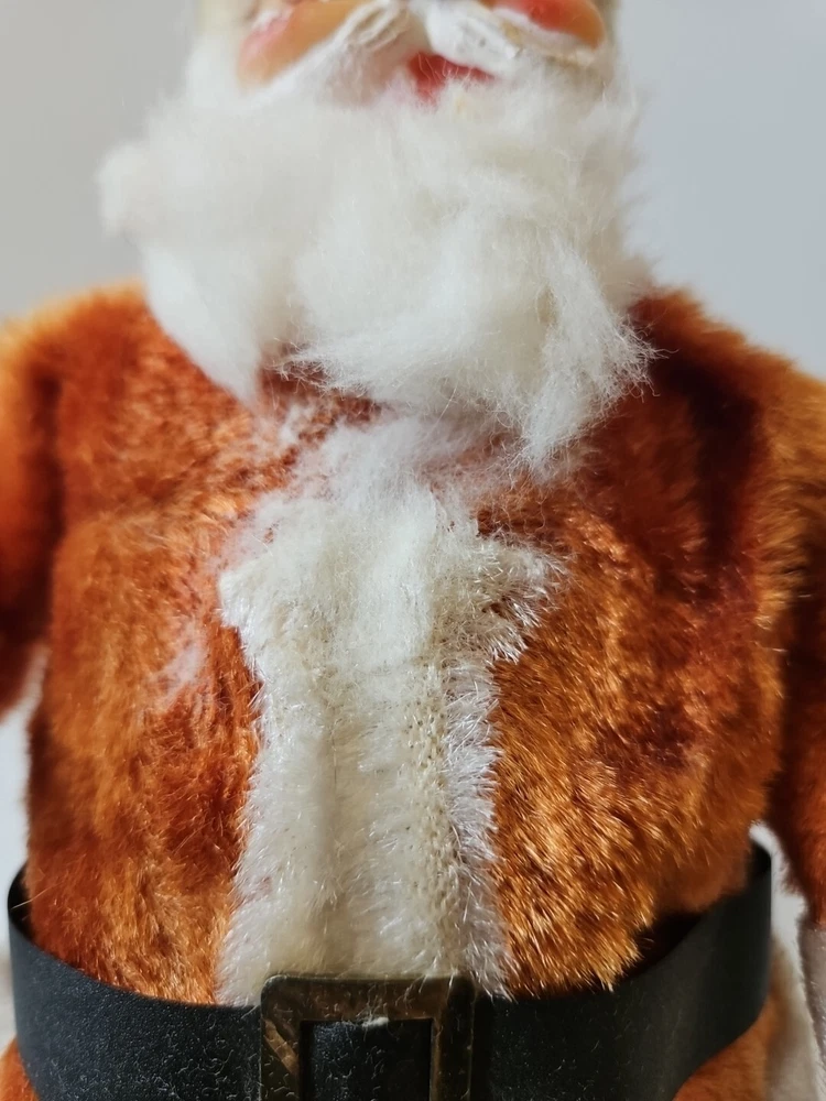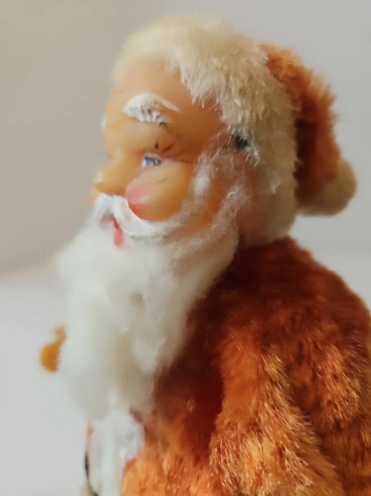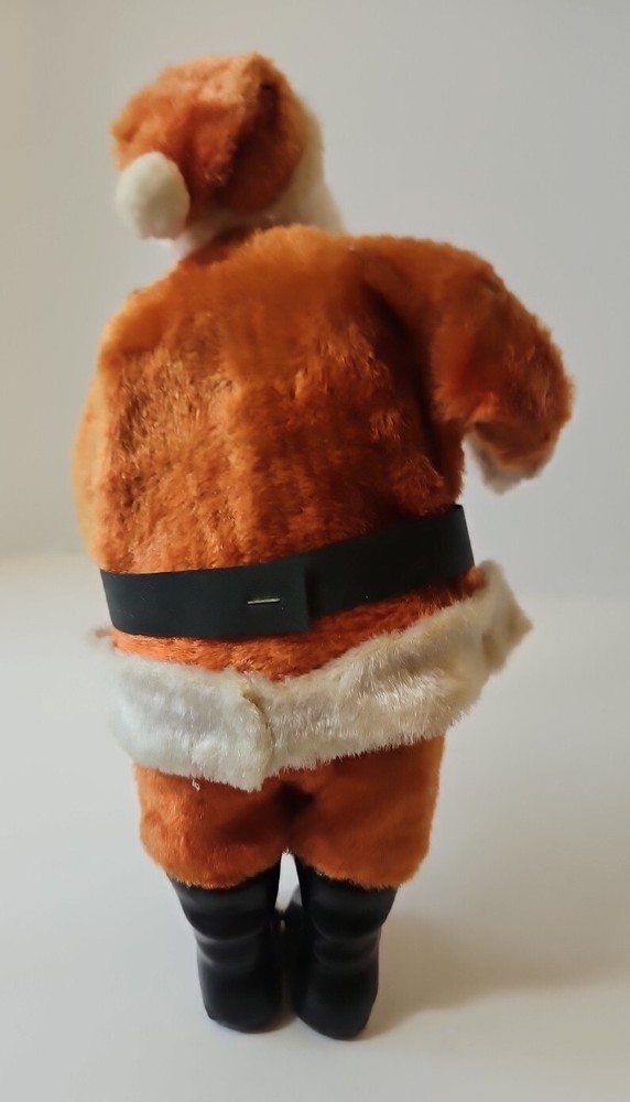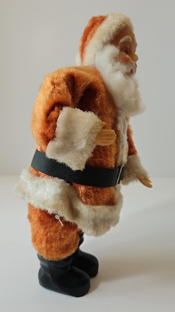 This vintage Santa Claus figurine from the 1950s is a charming addition to any Christmas collection. With a wind-up on his side, the plush Santa stands at 12 inches tall and plays music when activated. Made in Japan, this original mid-20th century piece features mixed materials including velvet, rubber, and fabric in a classic red color. The Santa figurine is perfect for any room and occasion, whether you're a teenager, adult, or child. It's a unique and timeless item that will bring joy to your holiday season.