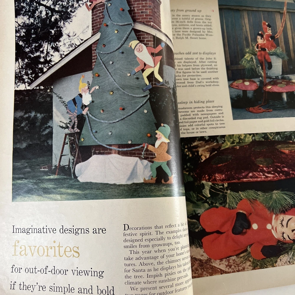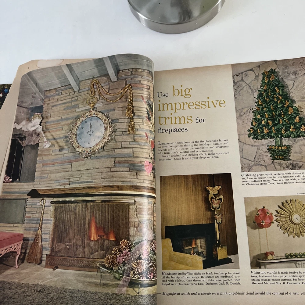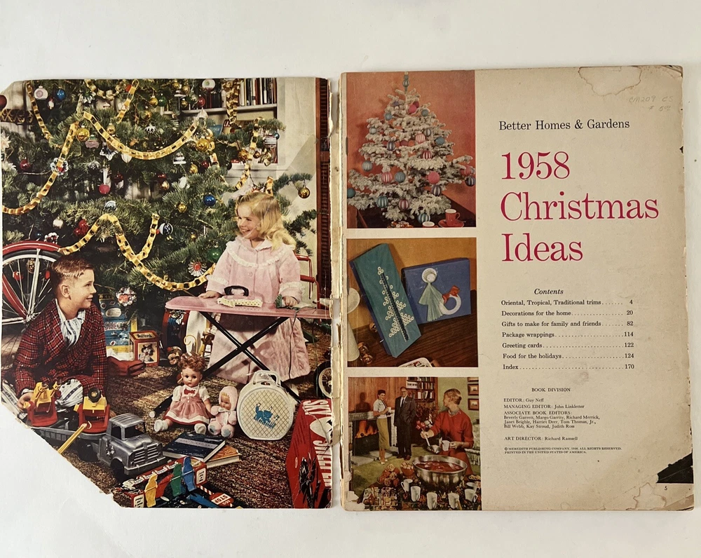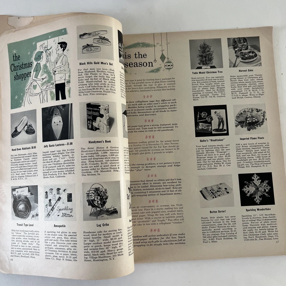 Vintage 1958 Better Homes & Gardens Magazine Christmas Ideas 172 Pages Absolutely Amazing Photographs…!!! Travel back in time to the 1950’s…! So nostalgic, so heartwarming…! The Outdoor decorations are so funny and fantastic…! Every page is so interesting and beautiful. Even the ads are fascinating! (Who would buy a Gold Plated Coffee Pot???)… Condition is Good with some issues: The cover has damage and the first page is coming off the binding. It shows some wear - But is intact and all pages are present. This magazine makes me happy just looking at it… Would be a wonderful gift…