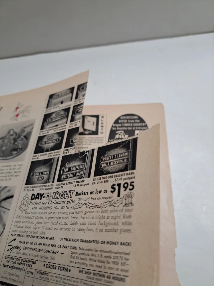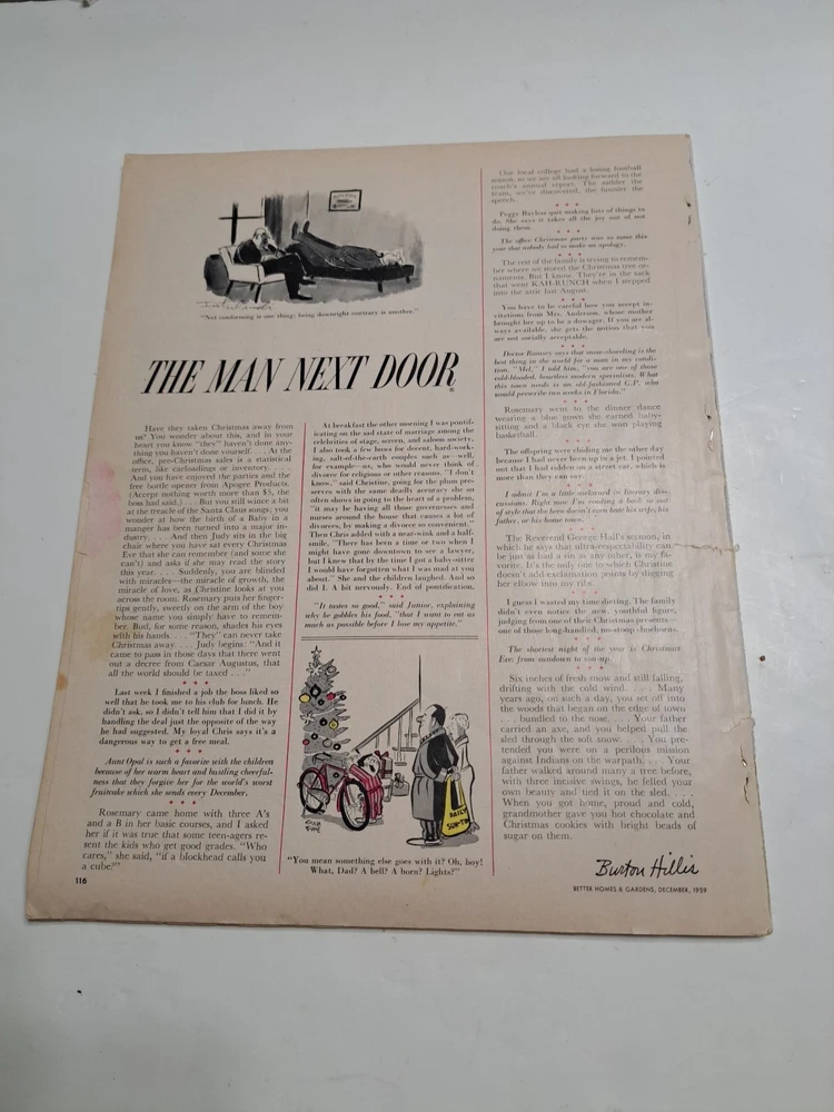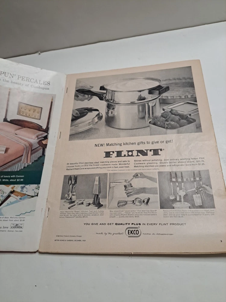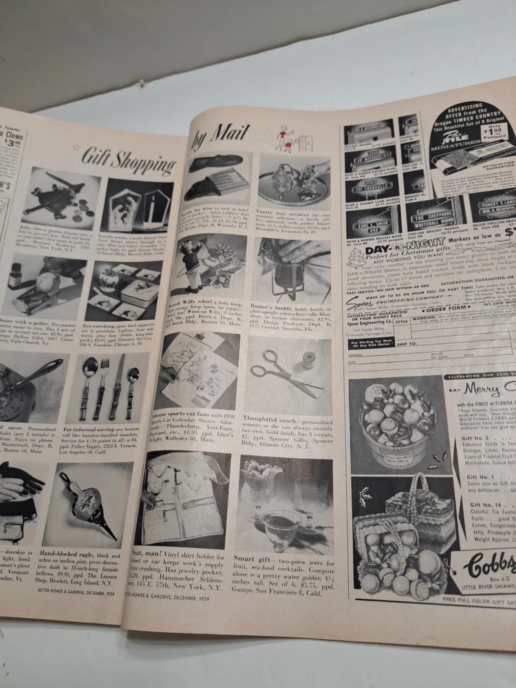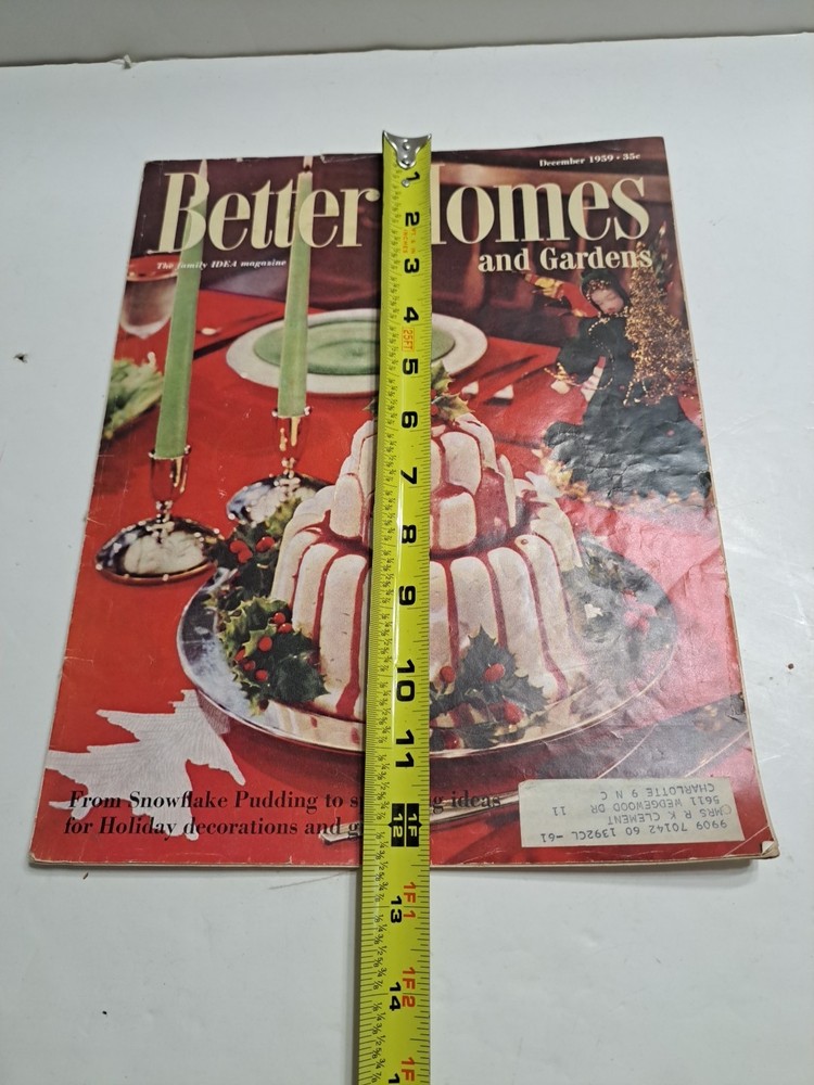 Delve into the pages of yesteryear with the Vintage 1959 December "Better Homes and Gardens" Magazine, a treasure for enthusiasts of history and vintage publications alike. This edition, printed in English, offers a unique snapshot of the era's lifestyle and culture, set against the backdrop of a bygone December. Within its nostalgic foldouts and articles, the magazine serves as a time capsule for readers interested in the historical context of home living, gardening, and the arts. A classic addition to any collection, it invites readers to experience the charm of mid-century Americana through its rich content and timeless appeal. Sold as found in estate! We sell items as found in estate We don’t wash or clean the items We are estate liquidators Please don’t hesitate to make us an offer We stay in business to help people to liquidate and to help you make smart purchases Inv 4825 LZ