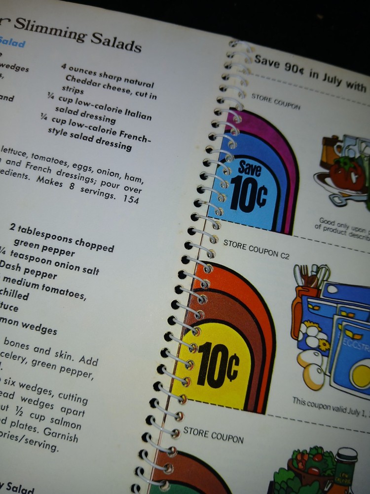 This is the vintage Better Homes and Gardens Skinny Book from the 1970s. It is a limited collection edition, spiral bound recipe book published by Meridith Corp in 1975. The book is written in English and intended for adults who are interested in slimming recipes. The book is in good condition and perfect for collectors who enjoy nostalgic items. It is a collectors addition stemmed from the original source book "Eat and Stay Slim." It contains recipes, from appetizers to desserts, as well as nostalgic ads and pictures, designed to help with weight management.