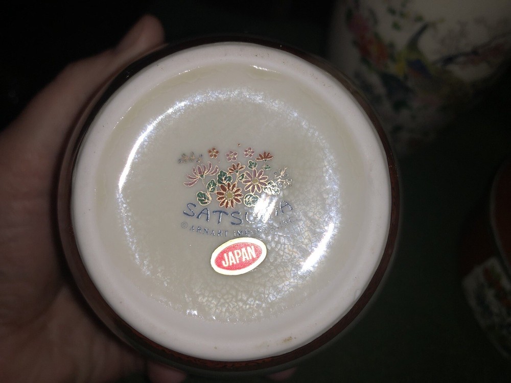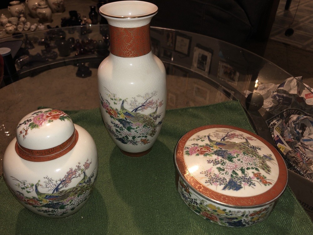 Vintage 1979 Satsuma Arnart Imports Peacock Floral Design 3 Piece Set. Set includes: 8.25” vase, 5” lidded ginger jar, and lidded trinket dish....