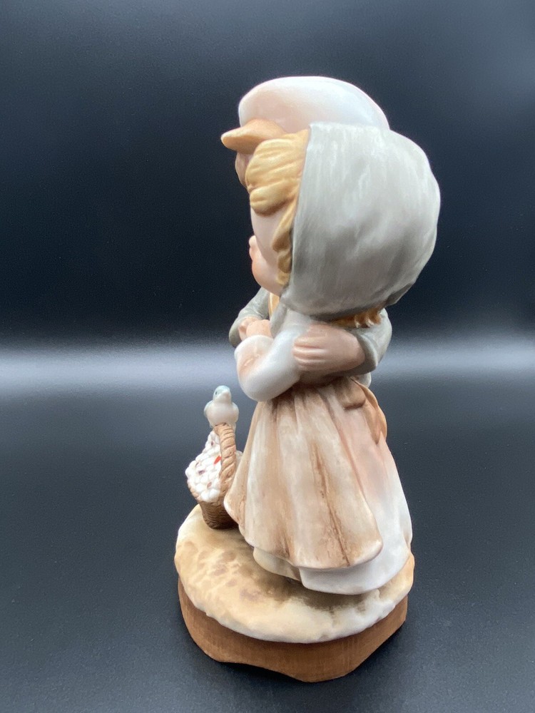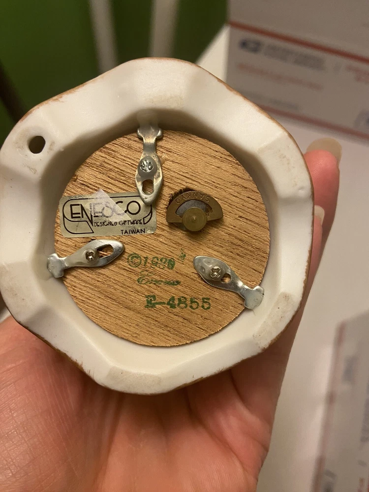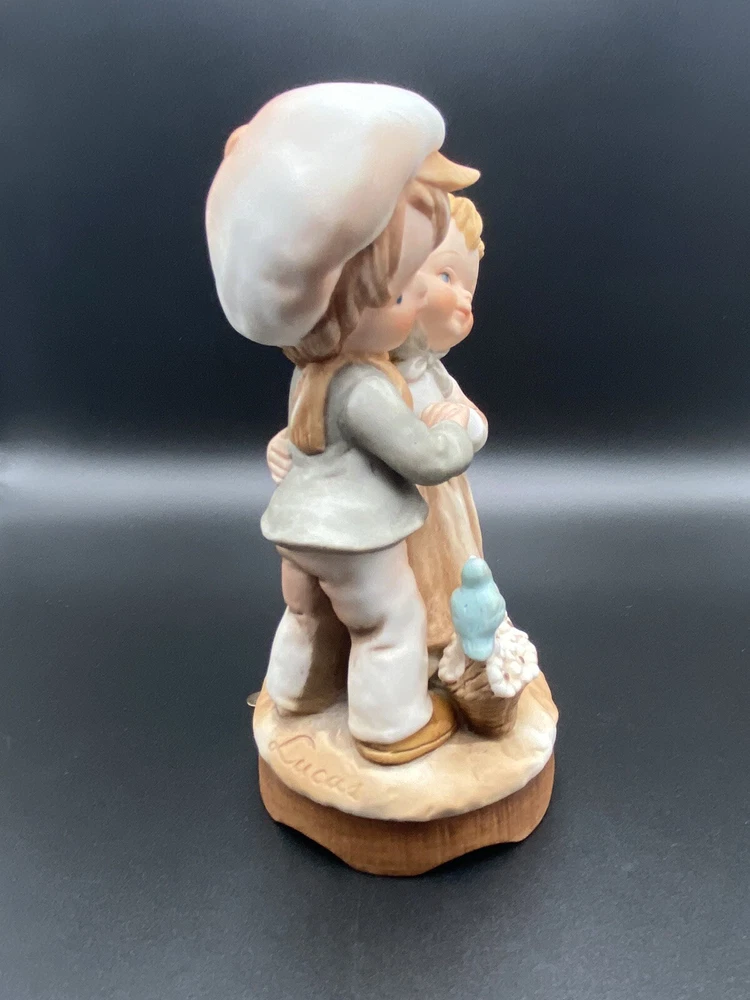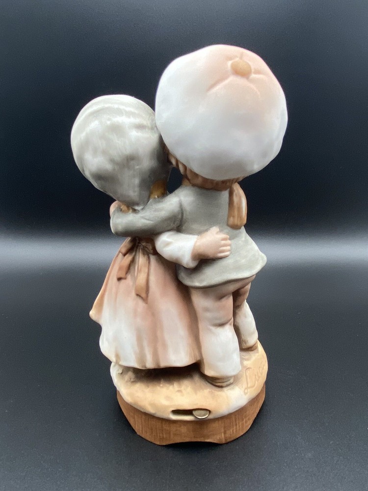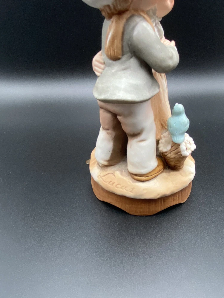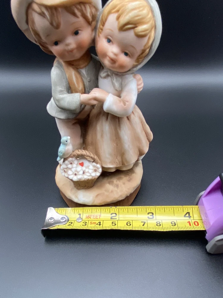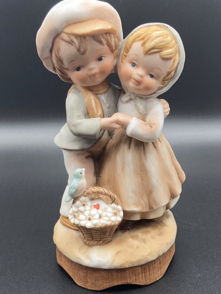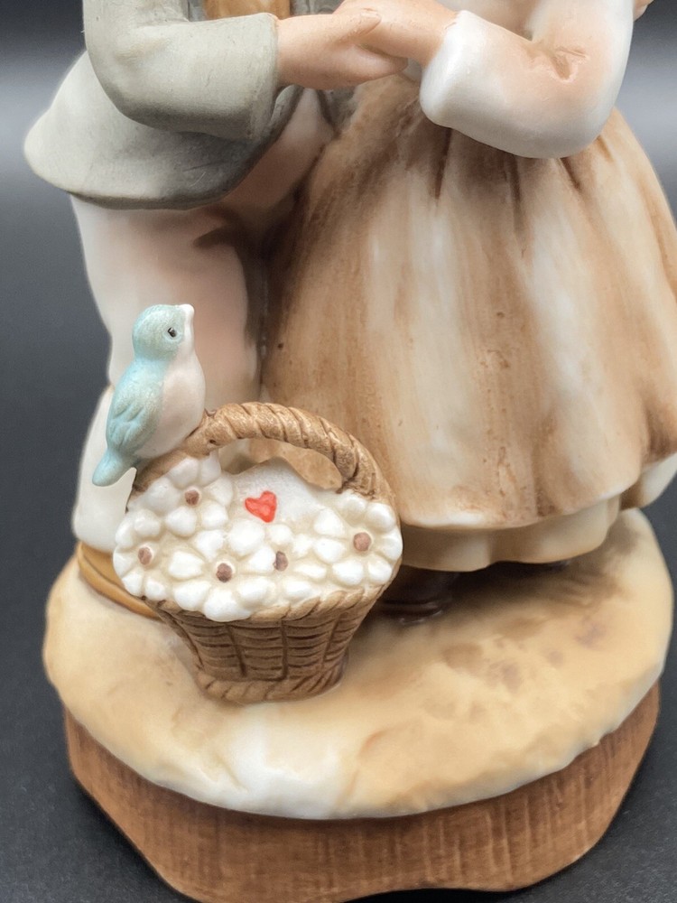 Vintage 1980 Enesco ceramic little boy and girl wind up musical figurine, birds. It does play music but you can hear the gears or something grinding when it plays. Good condition. No chips or cracks.