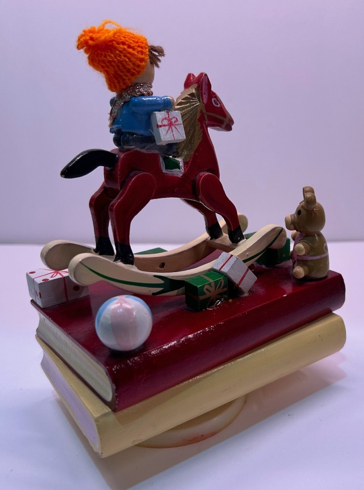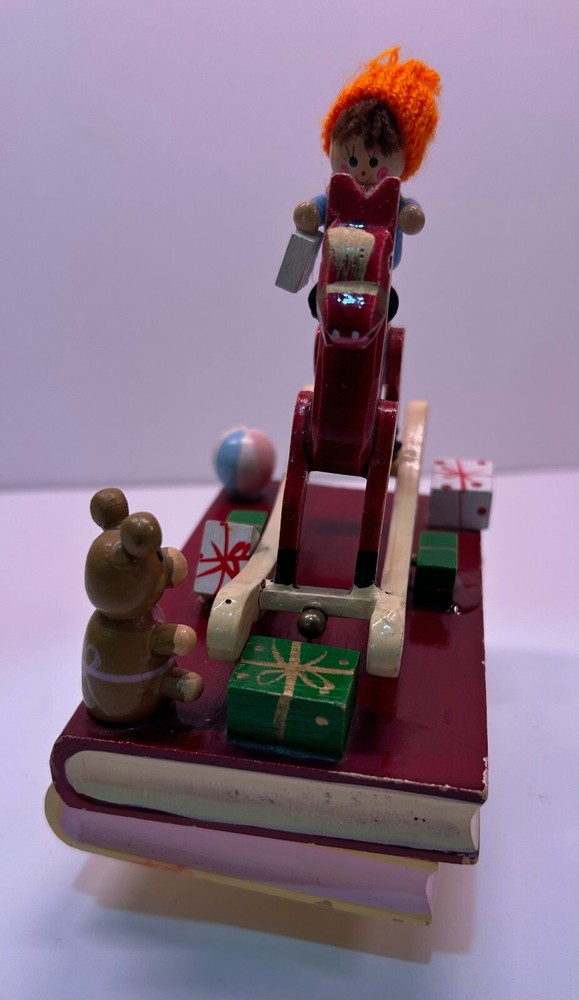 Vintage 1980's Christmas Rocking Horse with Teddy Bear Wind Up. The wind up plays Hark The Herald Angels Sing while the rocking horse moves back and forth. Has been test and works. Please let me know if there are any questions.