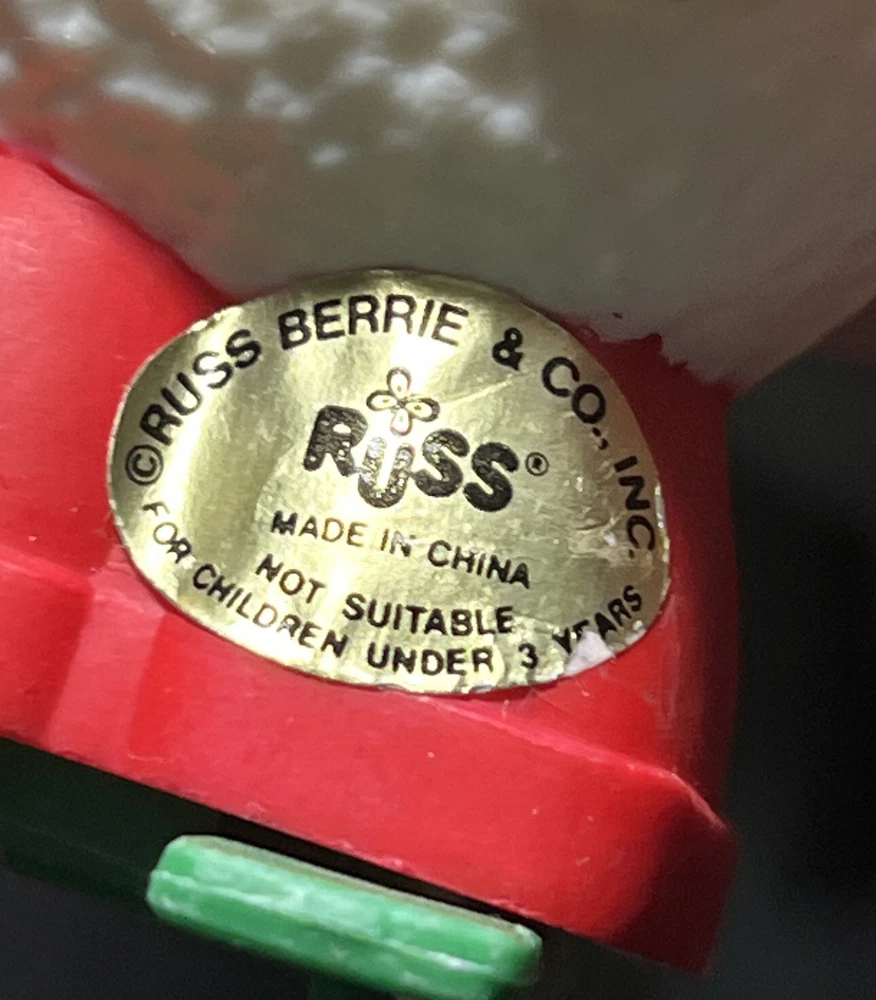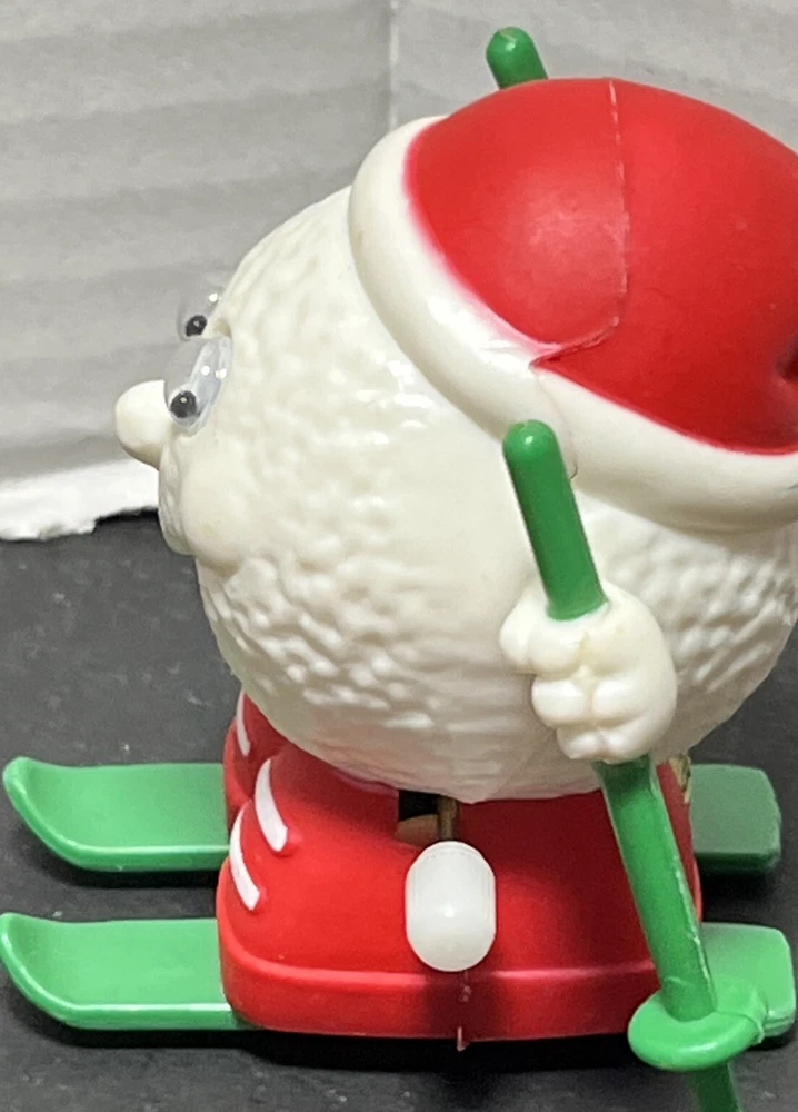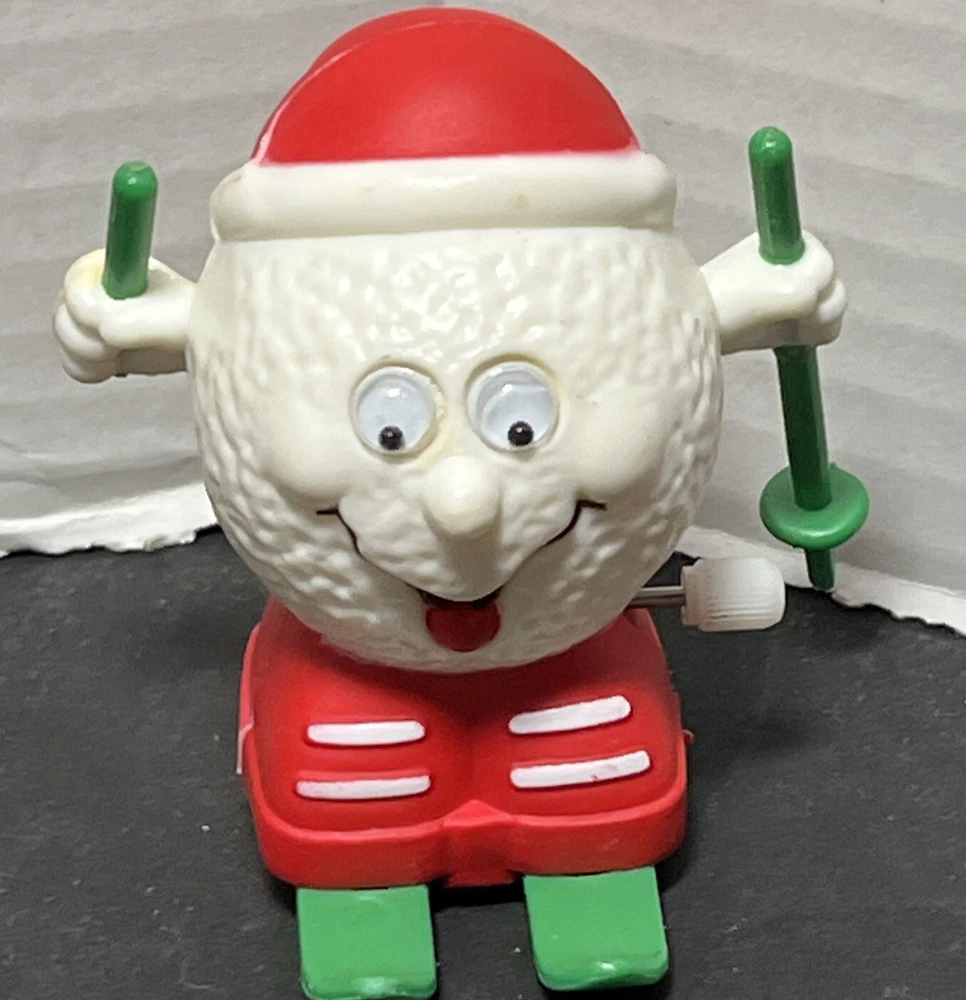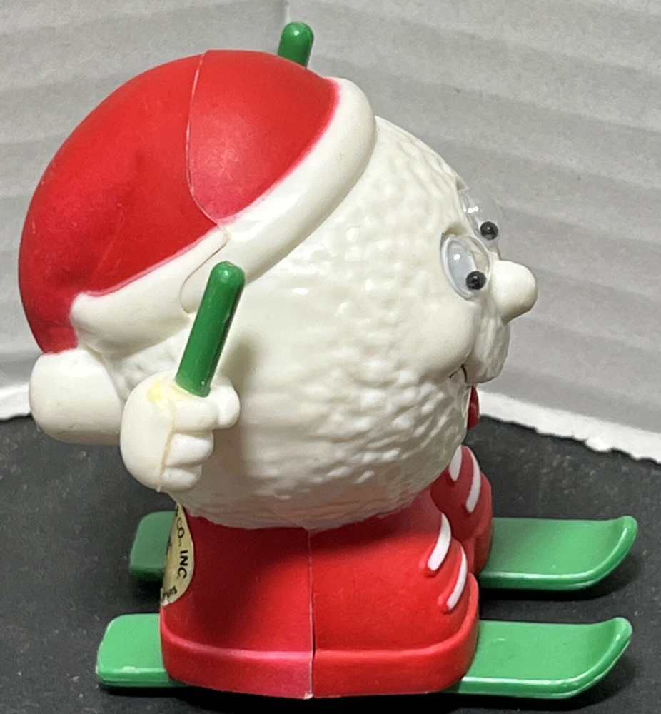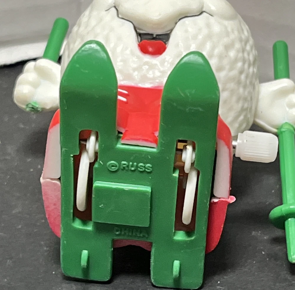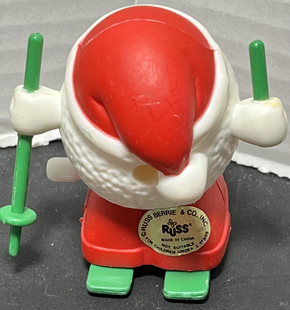 This vintage 1980's Russ Berrie wind-up figurine features a jolly Santa Claus wearing a red hat and skiing down a hill with a snowball in hand. Perfect for collectors or anyone looking to add a touch of festive cheer to their holiday decor. The toy is from the 1980s and is in great working order.