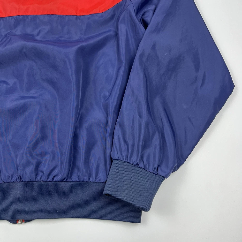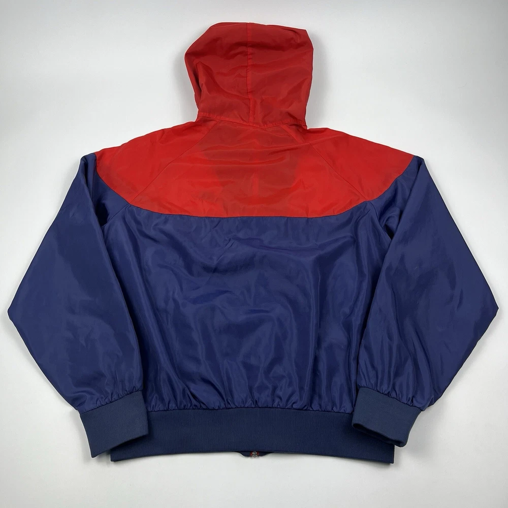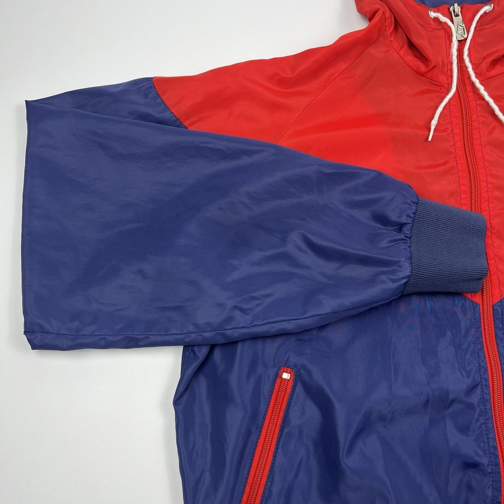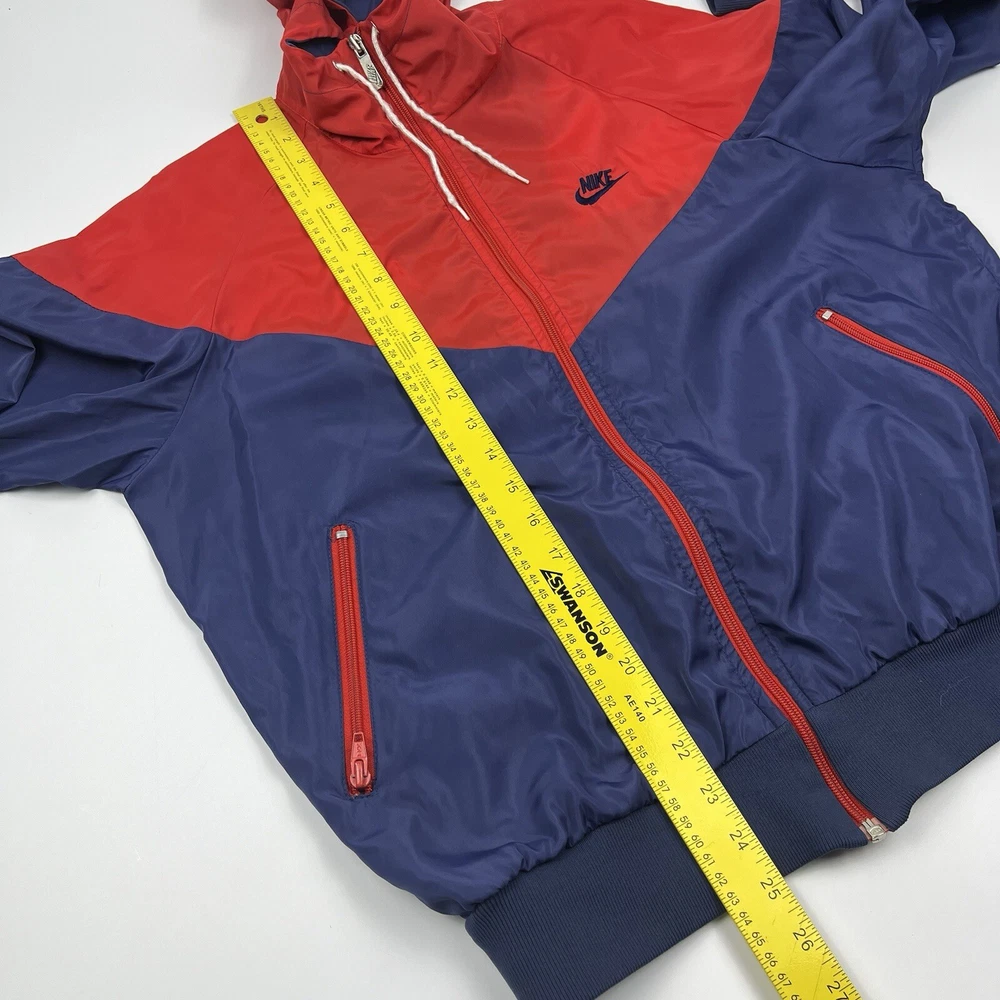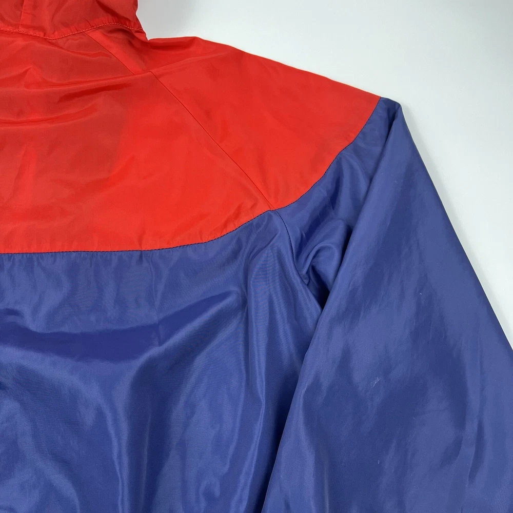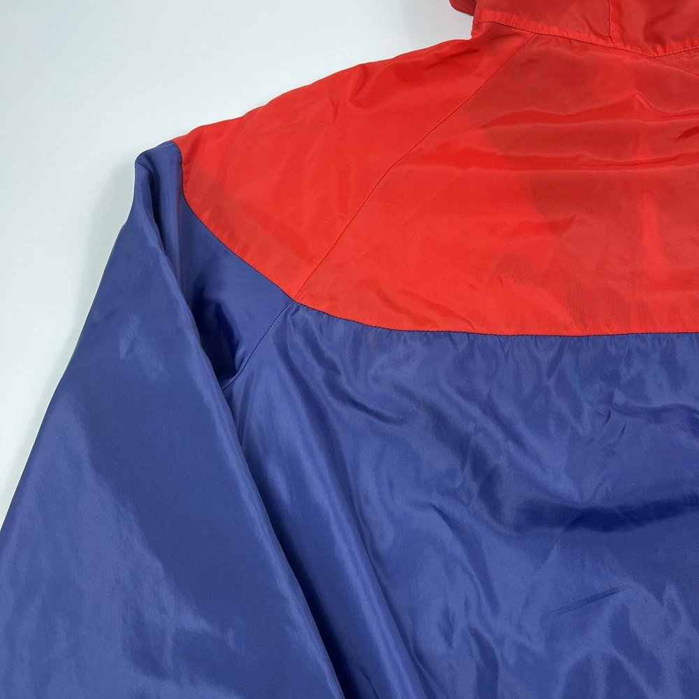 This vintage Nike Olympic windbreaker jacket is a must-have for any sports enthusiast. Made in the USA in the 1980s, it features a colorful colorblock pattern and a full zip closure. The jacket is perfect for all seasons and is wind and water-resistant, making it ideal for outdoor activities such as track and field, gym and training, tennis, soccer, cross-training, CrossFit, skateboarding, basketball, running, and jogging. It also has zipped pockets for convenient storage and is machine washable for easy care. The jacket is available in a men's size Large, with a chest size of 46 inches, 25" Length and is suitable for casual wear, travel, and activewear.