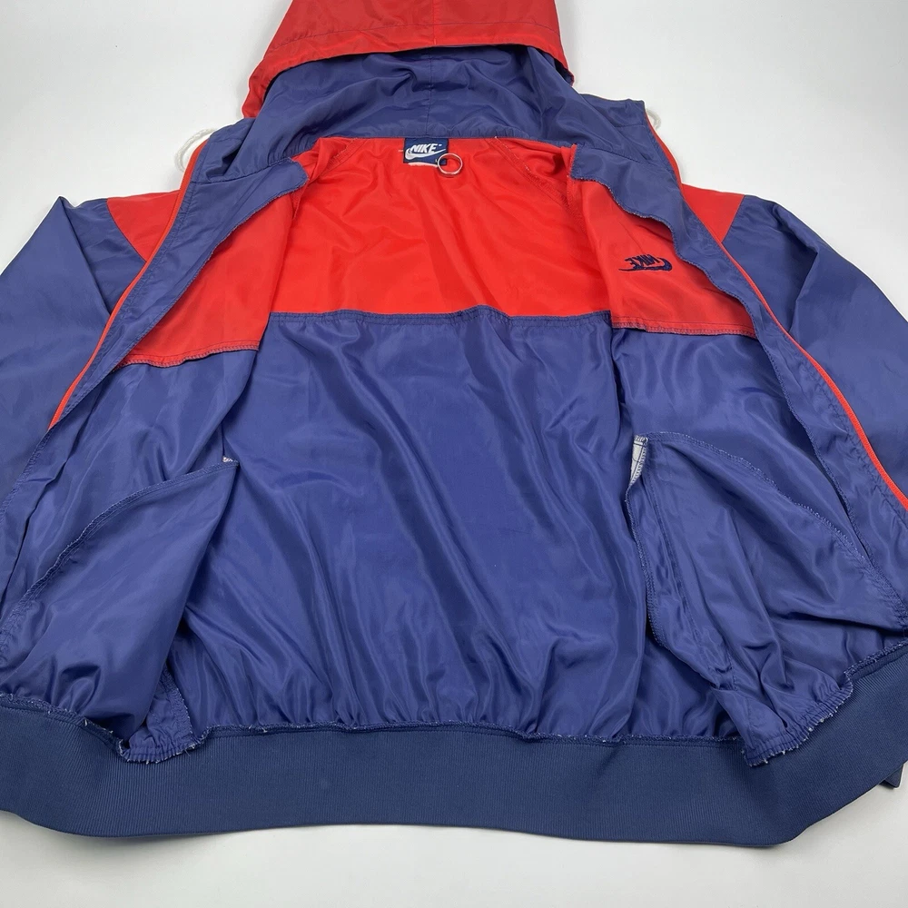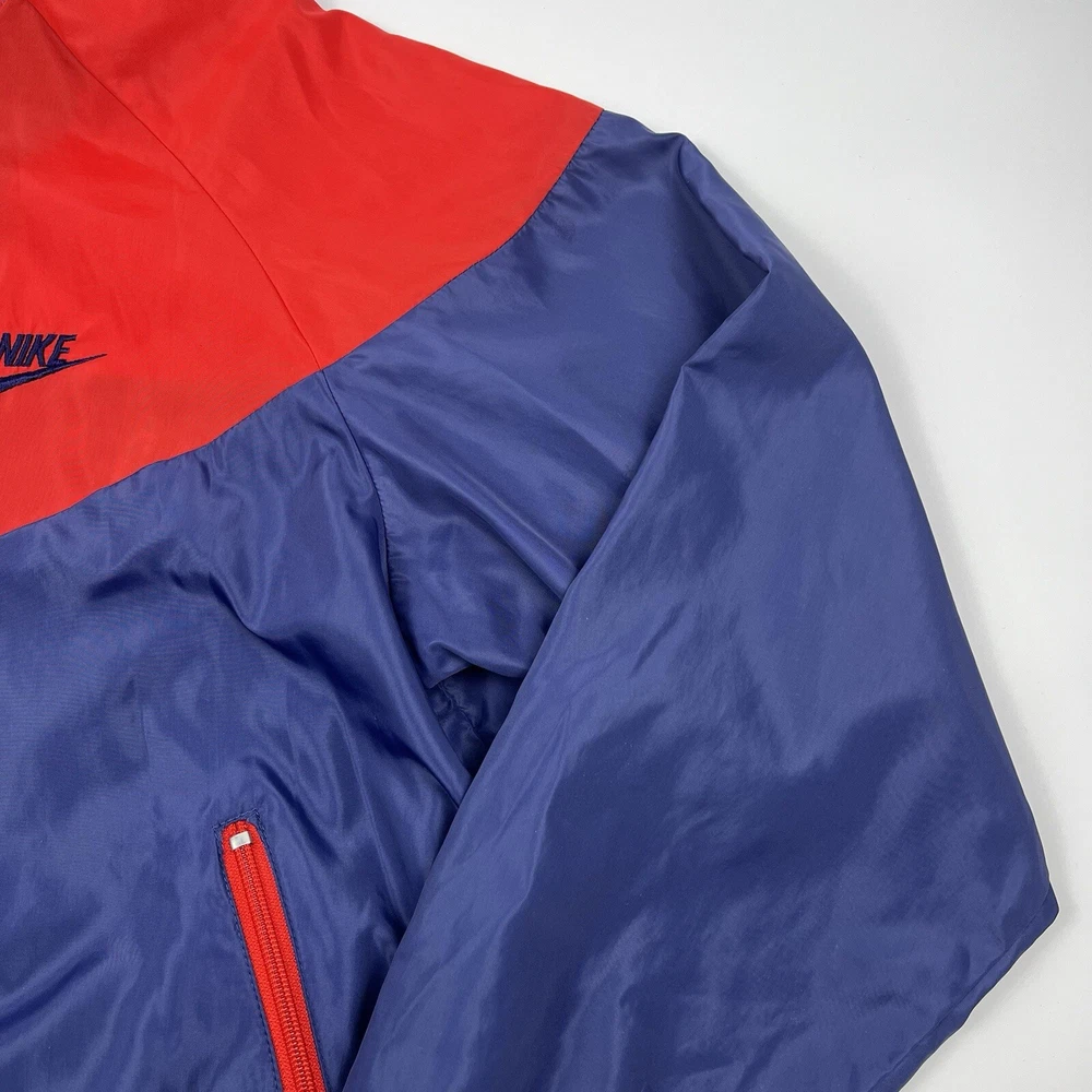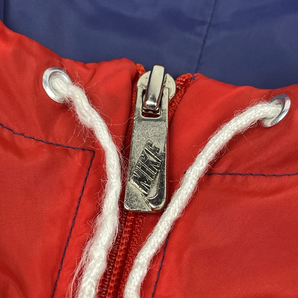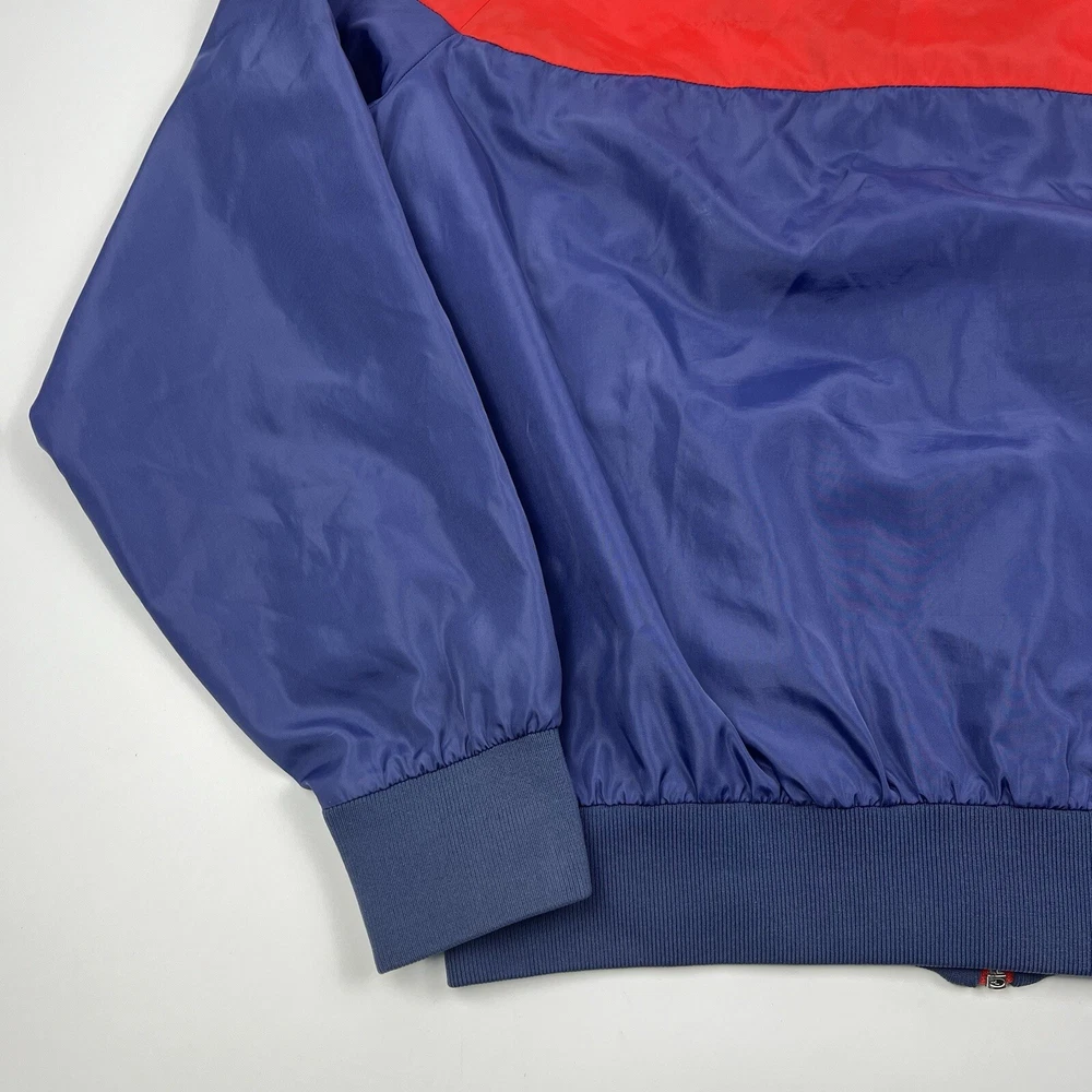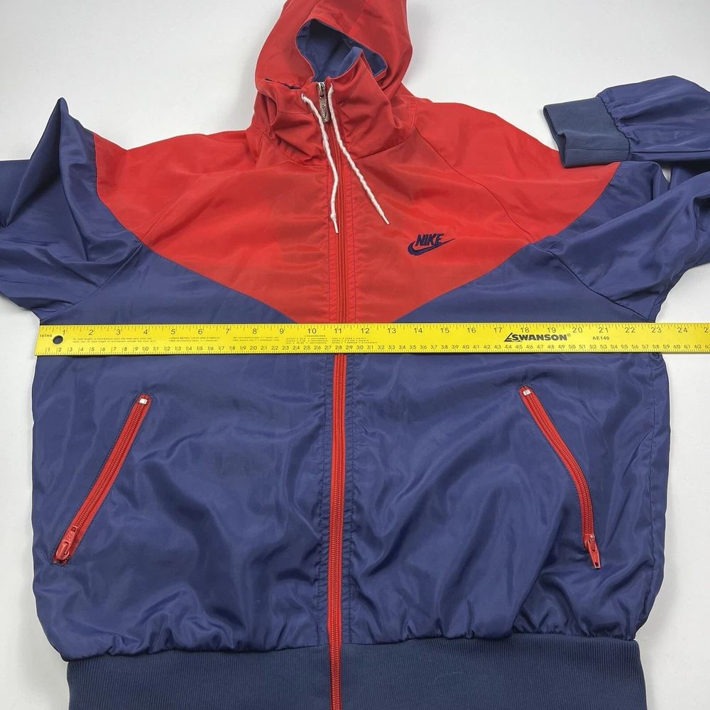 This vintage Nike Olympic windbreaker jacket is a must-have for any sports enthusiast. Made in the USA in the 1980s, it features a colorful colorblock pattern and a full zip closure. The jacket is perfect for all seasons and is wind and water-resistant, making it ideal for outdoor activities such as track and field, gym and training, tennis, soccer, cross-training, CrossFit, skateboarding, basketball, running, and jogging. It also has zipped pockets for convenient storage and is machine washable for easy care. The jacket is available in a men's size Large, with a chest size of 46 inches, 25" Length and is suitable for casual wear, travel, and activewear.