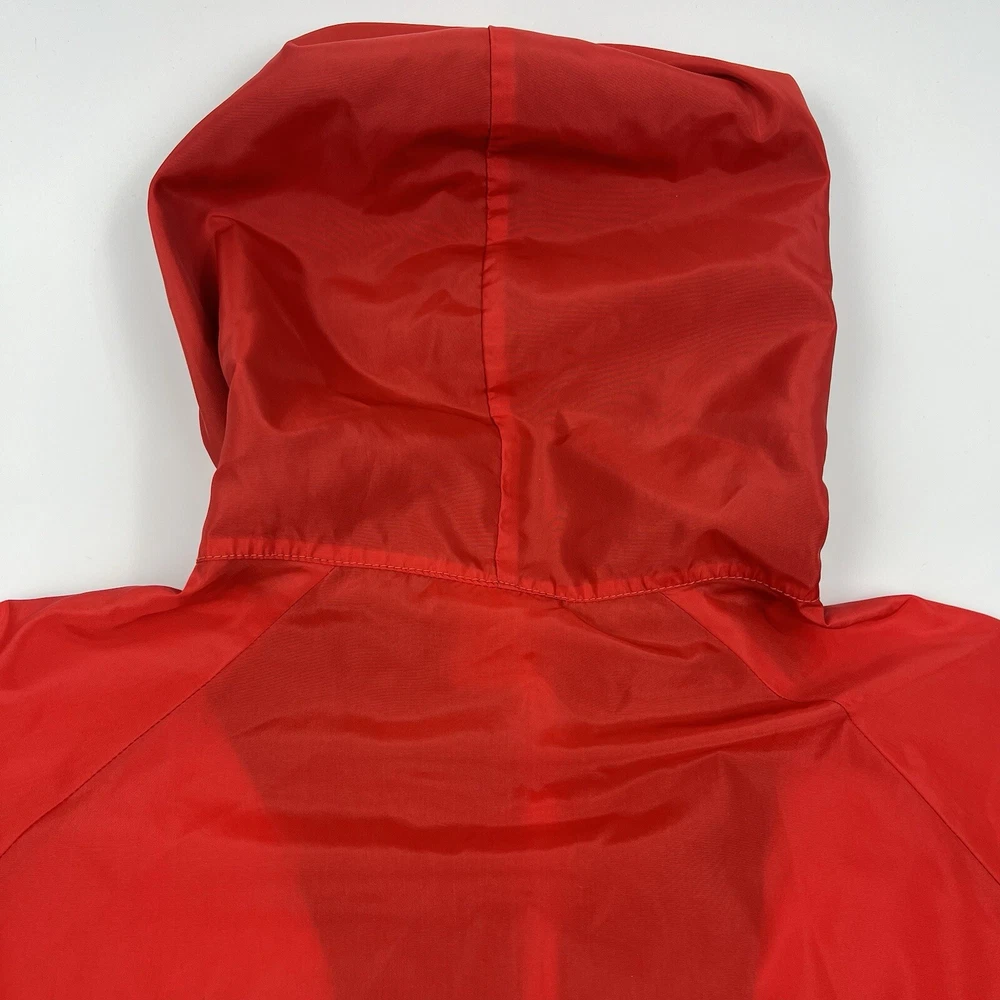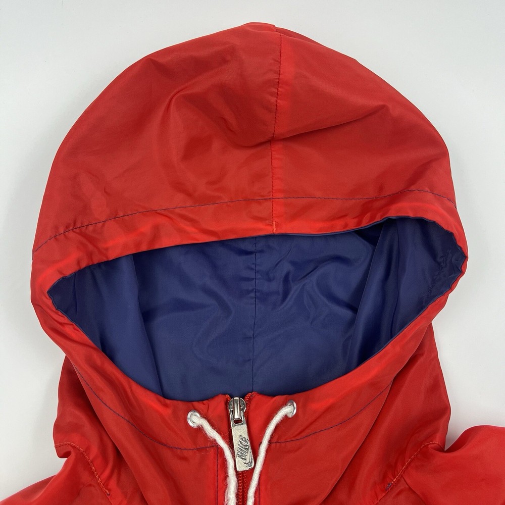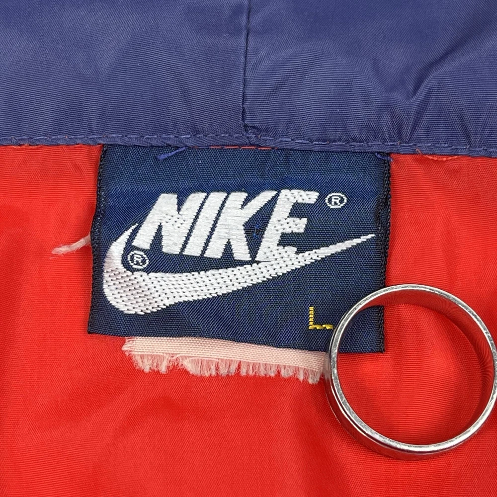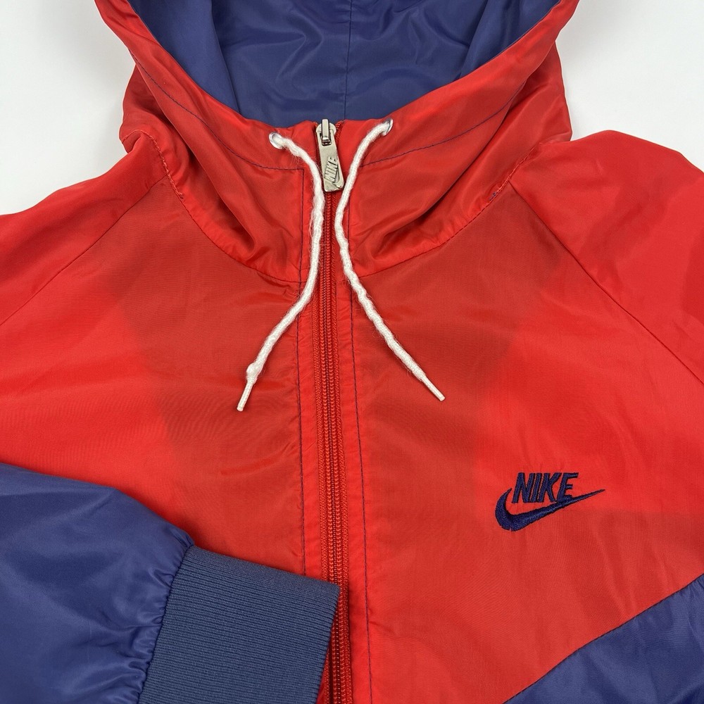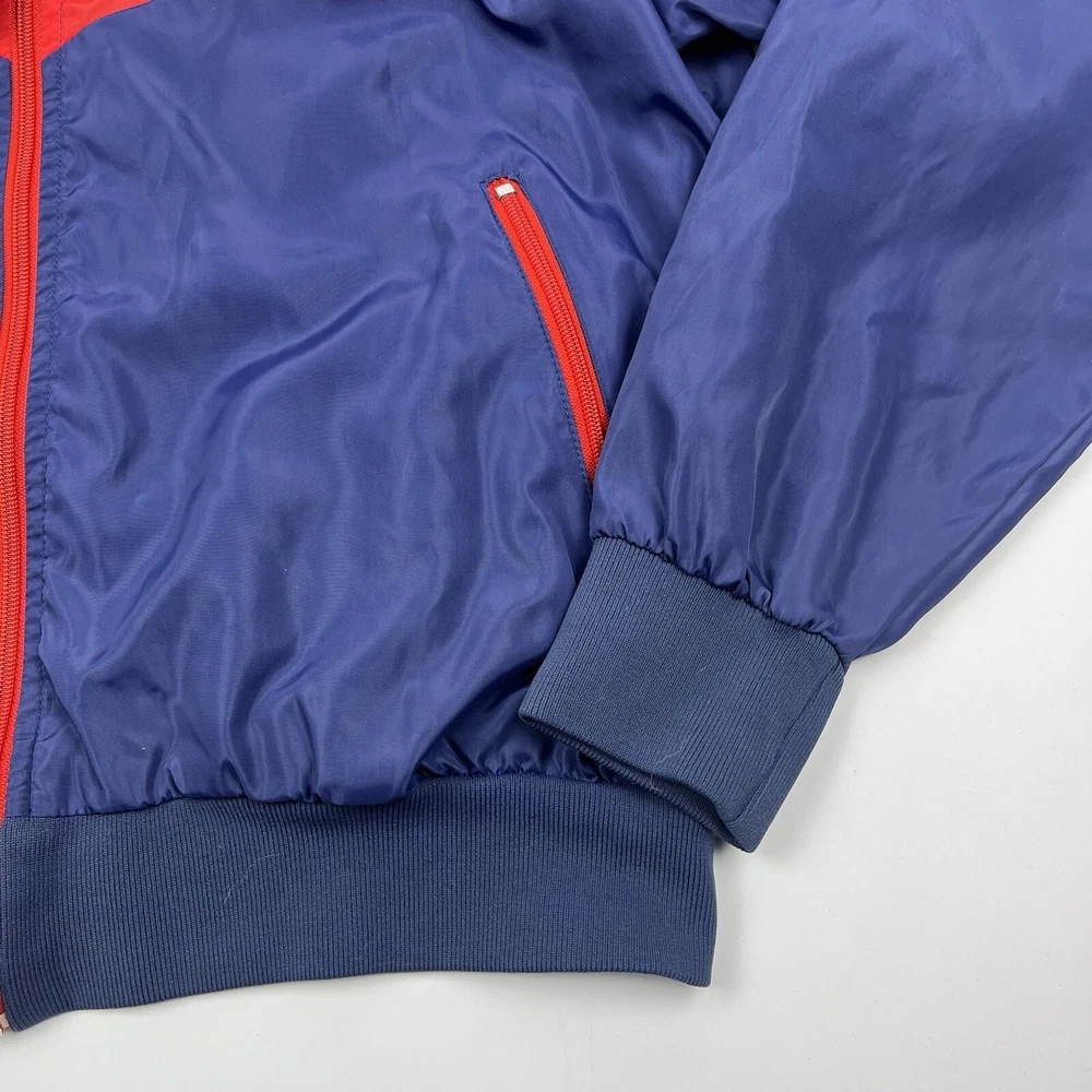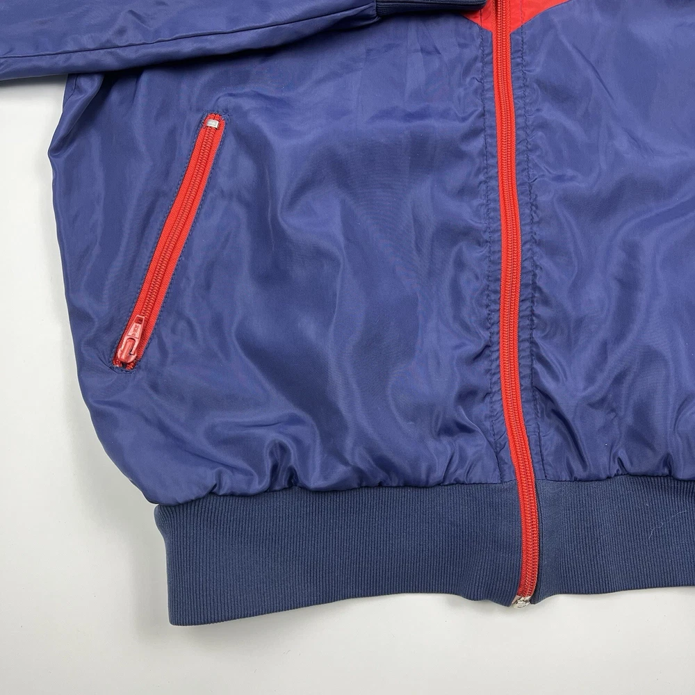 This vintage Nike Olympic windbreaker jacket is a must-have for any sports enthusiast. Made in the USA in the 1980s, it features a colorful colorblock pattern and a full zip closure. The jacket is perfect for all seasons and is wind and water-resistant, making it ideal for outdoor activities such as track and field, gym and training, tennis, soccer, cross-training, CrossFit, skateboarding, basketball, running, and jogging. It also has zipped pockets for convenient storage and is machine washable for easy care. The jacket is available in a men's size Large, with a chest size of 46 inches, 25" Length and is suitable for casual wear, travel, and activewear.