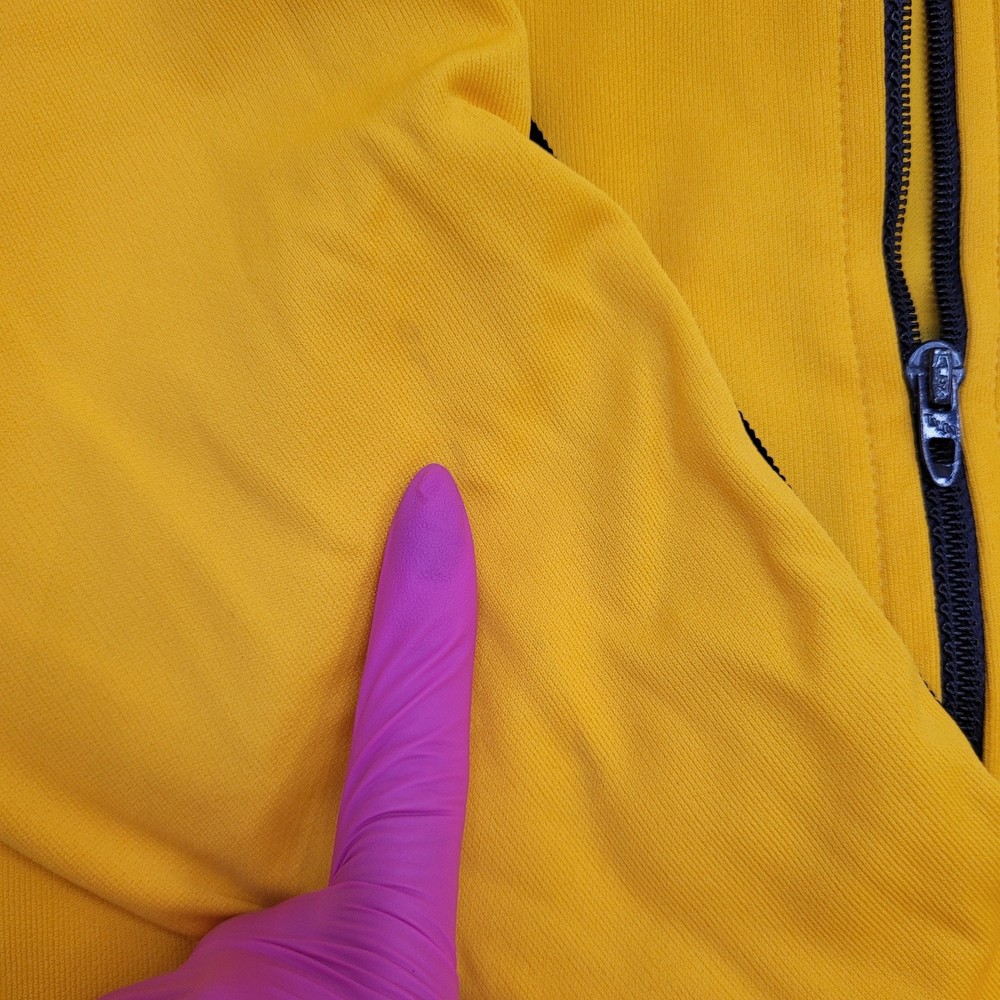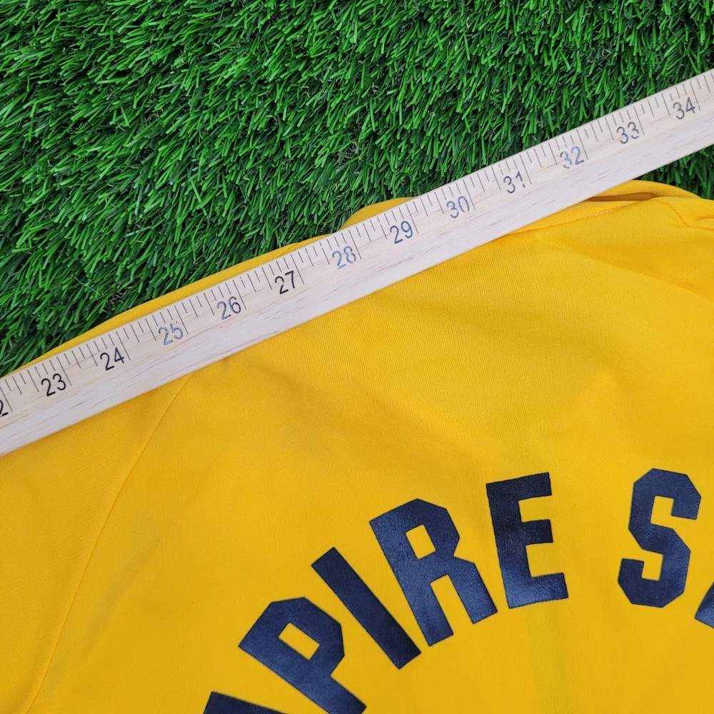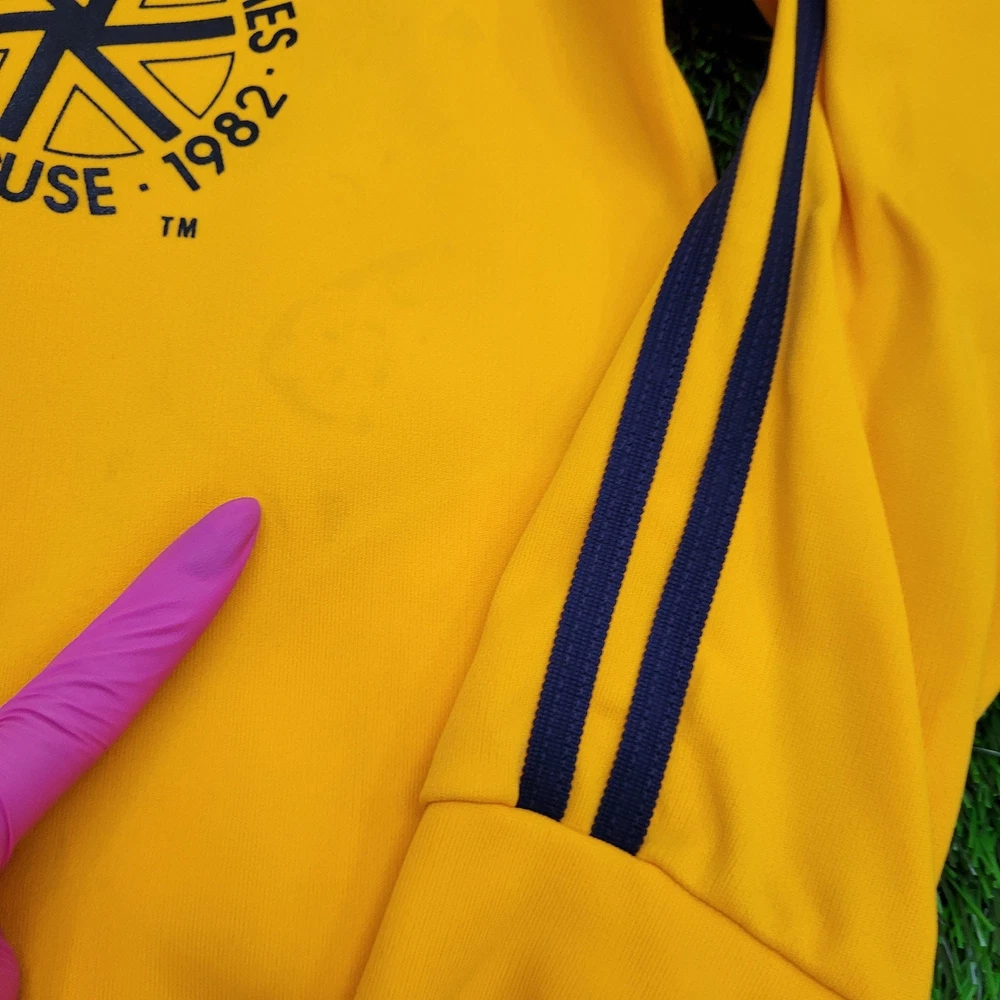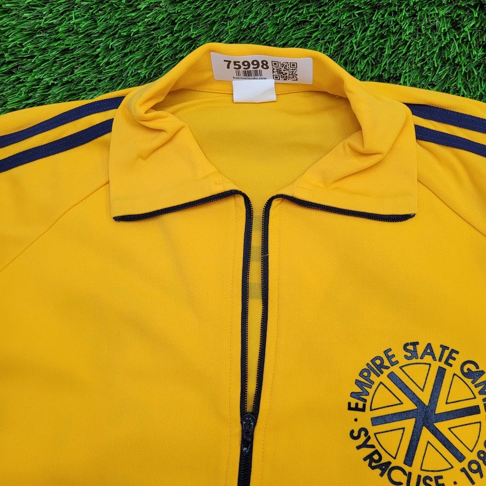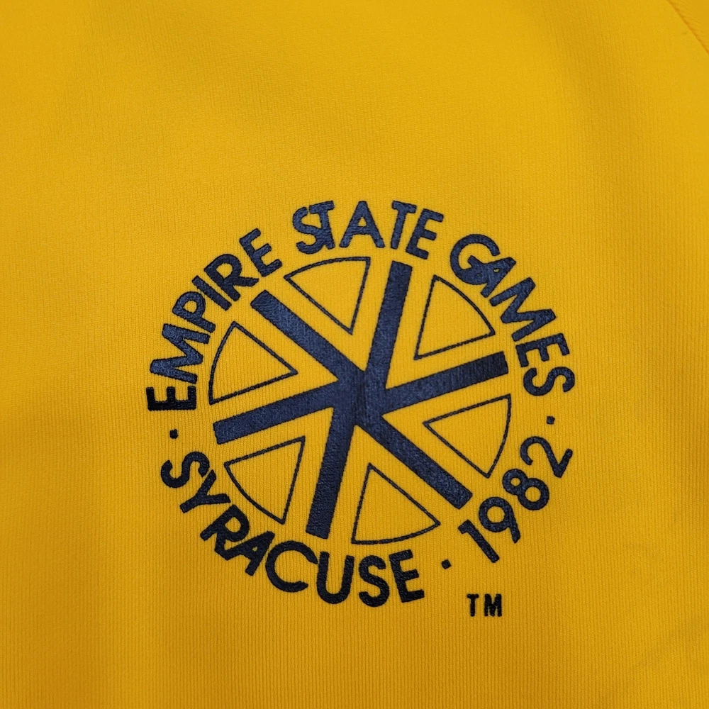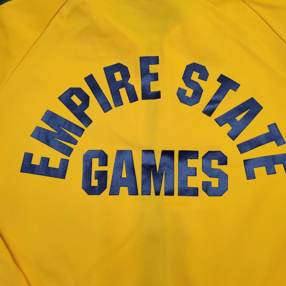 This vintage track jacket is a fantastic find for retro sports lovers! The bold yellow color and classic Empire State Games logo give it serious nostalgic charm. Though it shows some light wear like minor fading and small stains (as pictured), the jacket has no rips or holes—just authentic vintage character. Perfect for Syracuse fans or anyone who loves '80s athletic style. The fit is true to size, and the cracking graphics add to its throwback appeal. A must-have for collectors or casual wear!