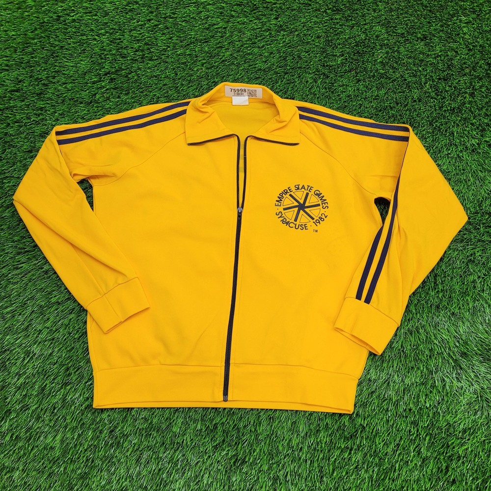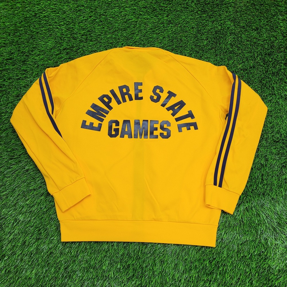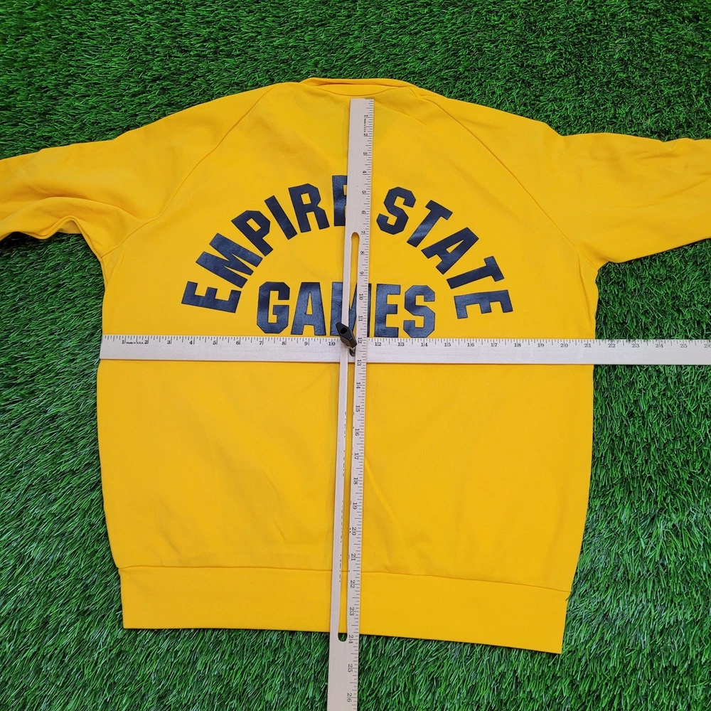 <![CDATA[<div>Vintage 1982 Empire State Games Track Jacket Womens L 21x24 Step into sports history with this vintage 1982 Empire State Games track jacket in Women's Large. Featuring a vibrant yellow design, perfect for retro sportswear and Syracuse fans! * Used condition * No rips/holes * Stains (see picture and zoom in to see size/location) * Normal fading from washing * Normal cracking on the graphic VINTAGE 1982 EMPIRE STATE GAMES TRACK JACKET, WOMEN'S LARGE YELLOW JACKET, 21X24 VINTAGE TRACK JACKET, RETRO SYRACUSE APPAREL, VINTAGE SPORTS JACKET, LARGE EMPIRE STATE GAMES JACKET, YELLOW TRACK JACKET, RETRO 80S FASHION, VINTAGE SPORTSWEAR, EMPIRE STATE GAMES CLOTHING 75998