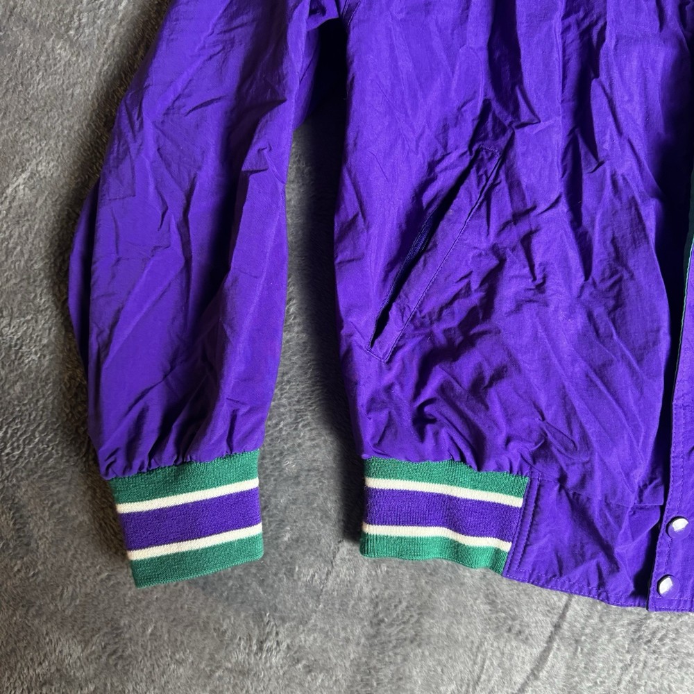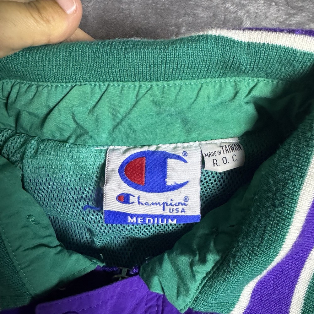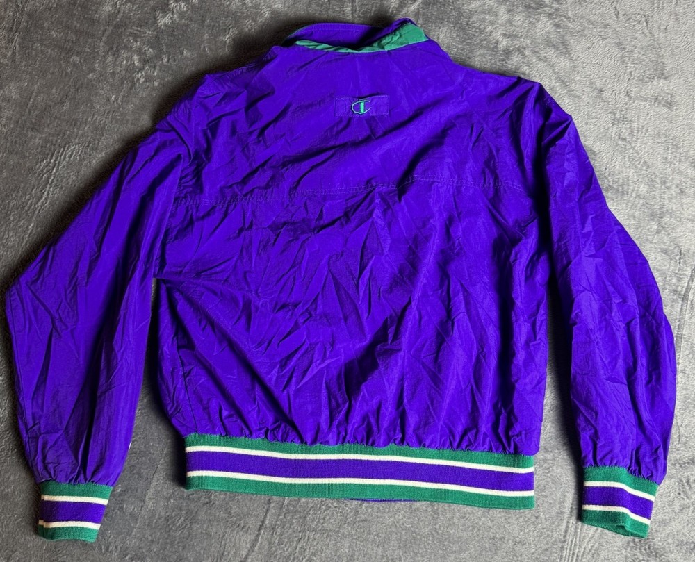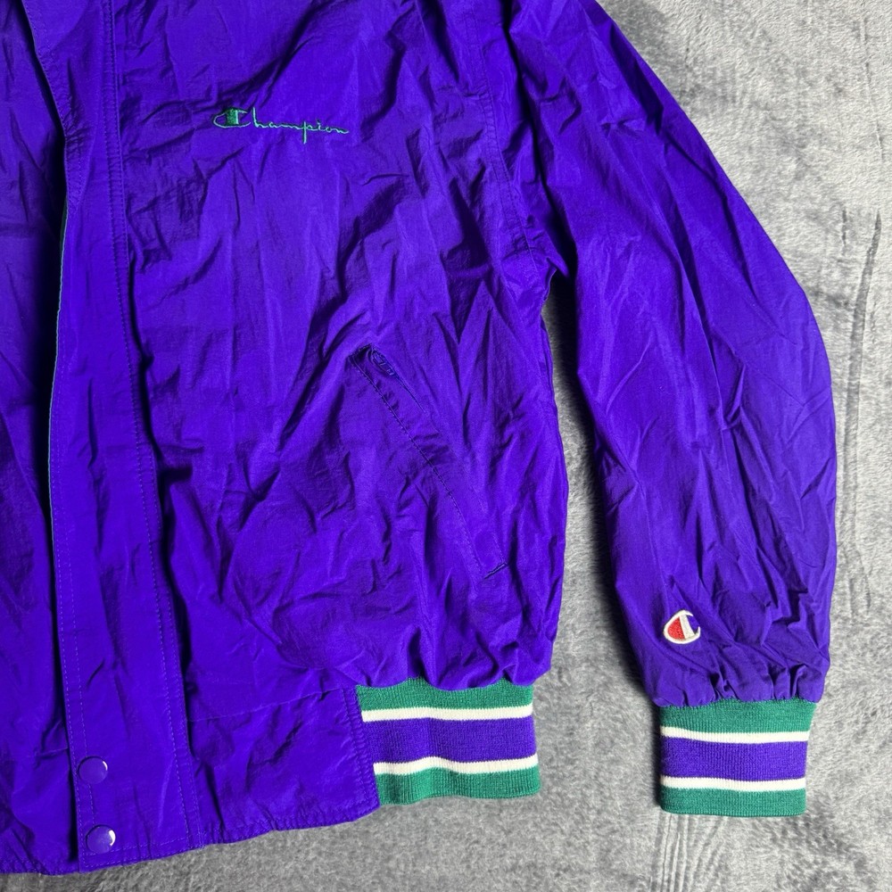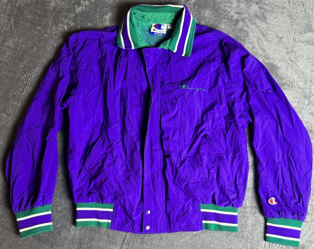 This vintage Champion windbreaker jacket is a true throwback to the 90s. The purple and teal colors create a geometric pattern that is perfect for any casual or travel occasion. The jacket is made of nylon and polyester, making it lightweight and breathable. It features a full zip closure, zipped pockets, and a collarless design. The jacket is perfect for all seasons, from winter to summer. It is also wind-resistant and has a softshell fabric type. The jacket is embroidered with the Champion logo and is in a mid-length cut.