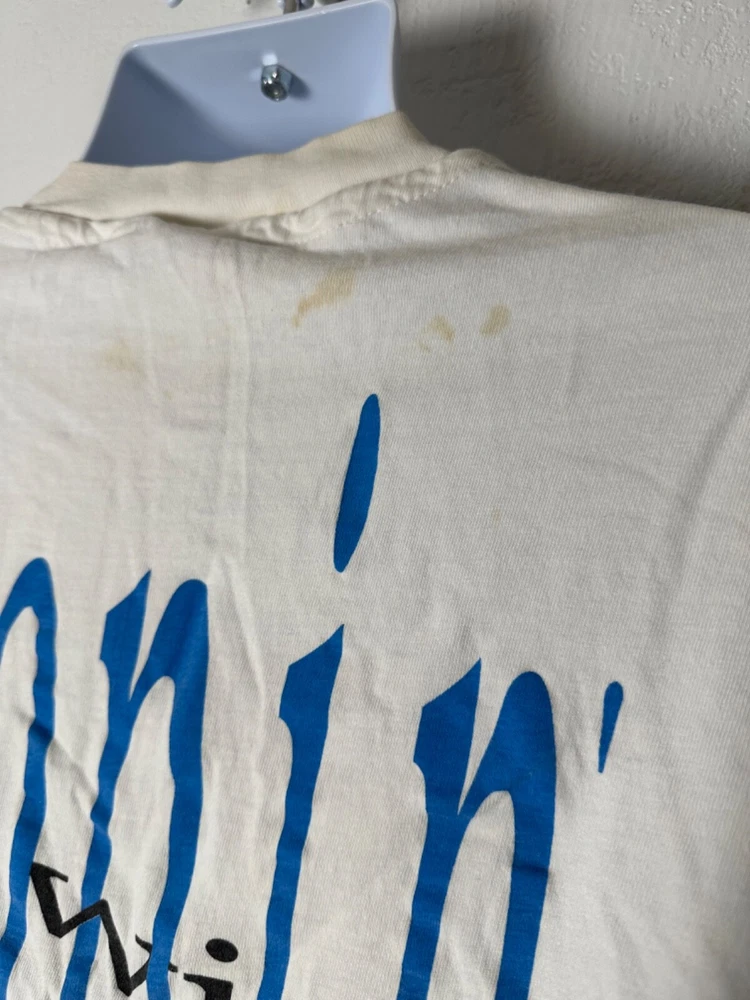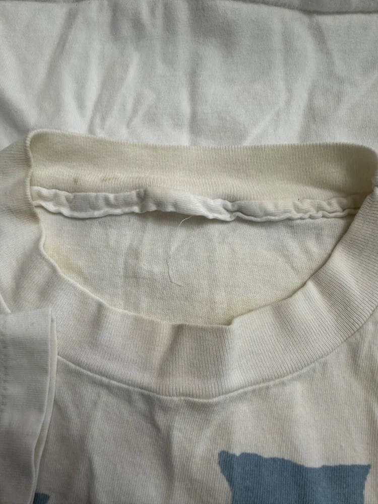 Yellowing and stains around collar, may oxi out. No tags, best guess is large. See pictures