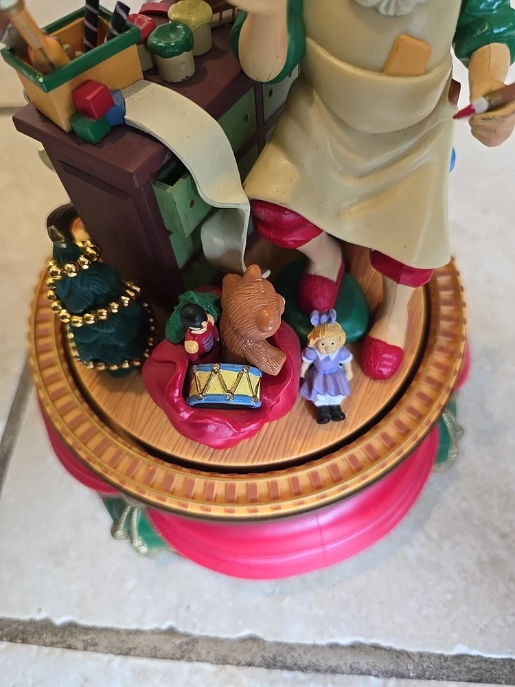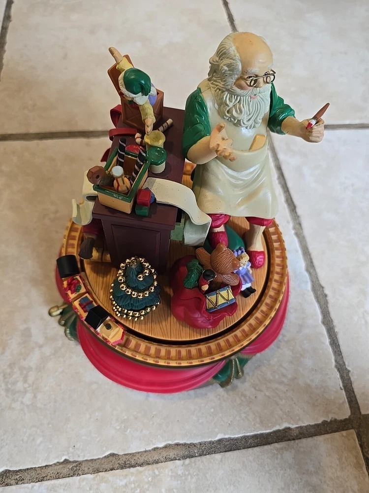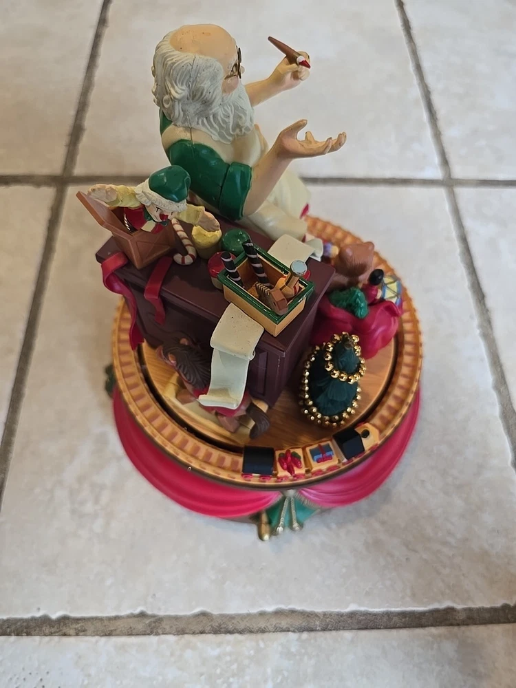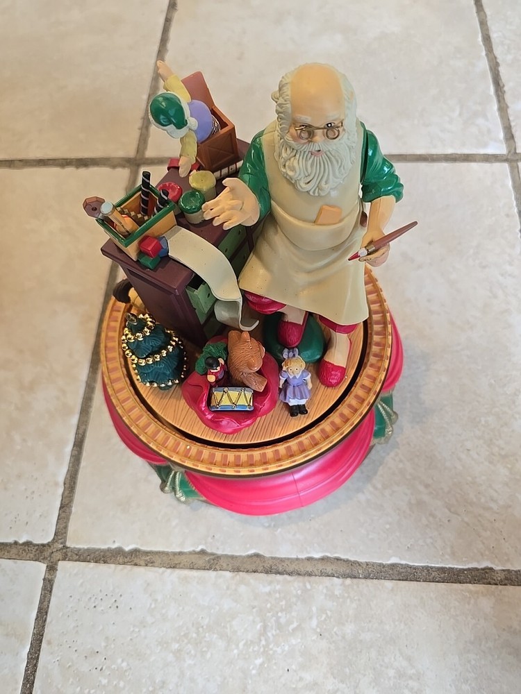 Vintage 1992 Santa's Best Animated Music Box Christmas Santa Claus Wind Up. Tested and in great working condition. The whole thing spins. The Christmas tree also spins independently. Santas painting hand goes up and down. The clown goes in and out of the box. Everything works on it as it should. Unfortunately, Santa is missing the little bird house in his hand. Otherwise, everything appears to be in good cosmetic condition. Please see the pictures for the condition. Shipped with USPS. Thanks for looking.